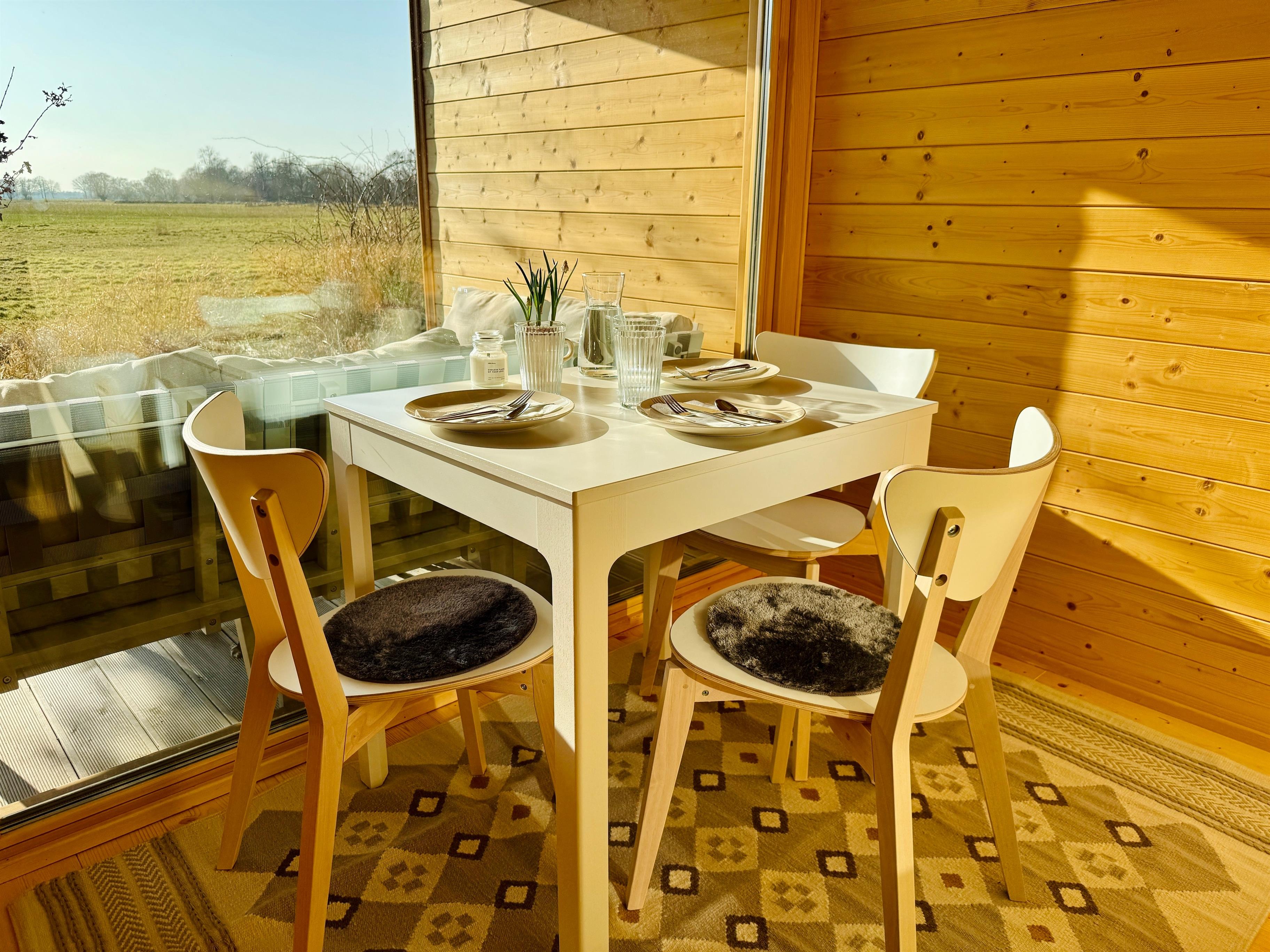 Ein besonderes Highlight ist das separate Ess- und Arbeitszimmer: Am großen Tisch finden drei Personen bequem Platz zum Essen oder Arbeiten. Schließt ihr die Schiebetür, verwandelt sich der Raum in ein ruhiges Homeoffice mit bodentiefen Fenstern und traumhaftem Wiesenblick, ideal für kreative Gedanken oder konzentriertes Arbeiten im Grünen.
