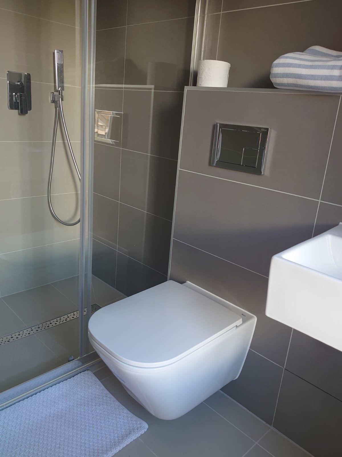 Ein modernes Bad mit bodentiefer Regendusche runden das Ganze stilvoll ab.