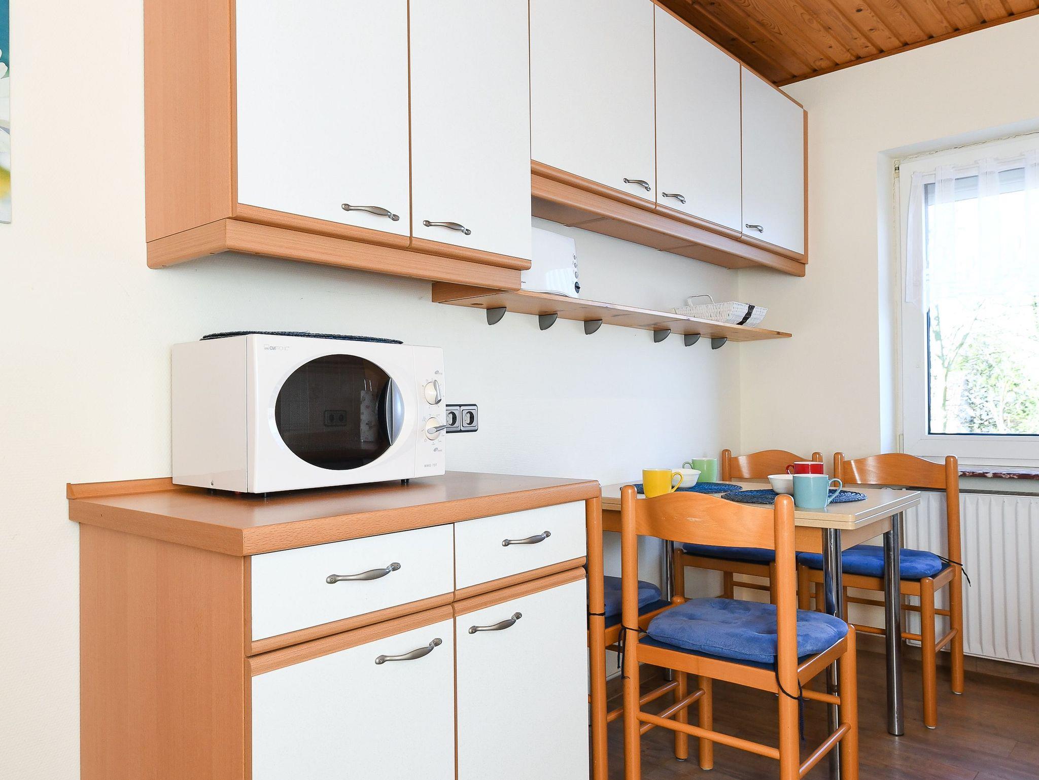 Größe ca. 70 Quadratmeter, Wohnzimmer, Küche, Schlafzimmer, zweites separates Schlafzimmer, drittes separates, Schlafzimmer, Badezimmer mit Dusche, Waschtisch und WC, Obergeschoss, Terrasse am Garten, überdachte Terrasse, optimal für 2 bis 6 Personen und zusätzlich 2 Kleinkinder.