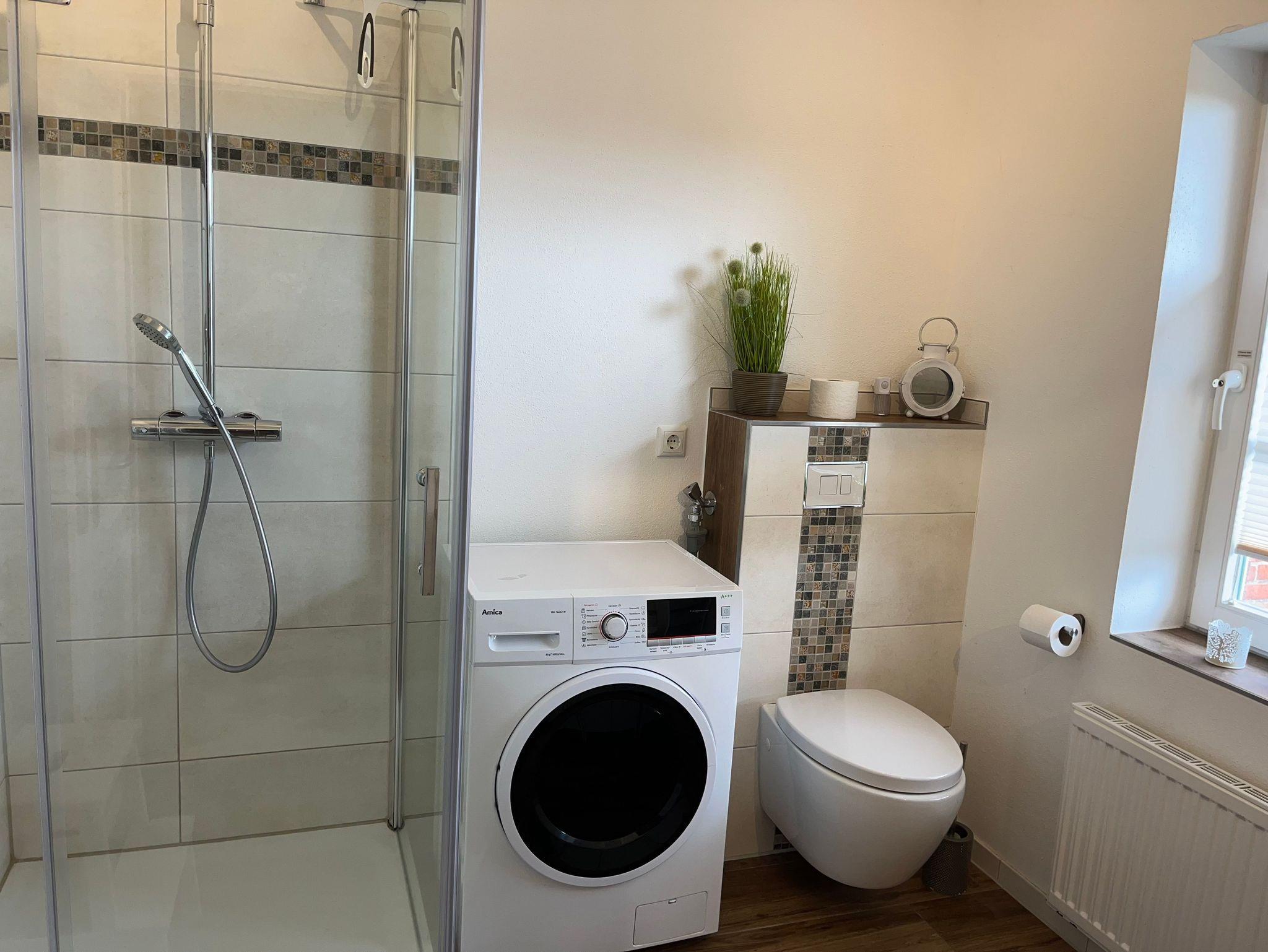Badezimmer mit Dusche, WC und Waschmaschine