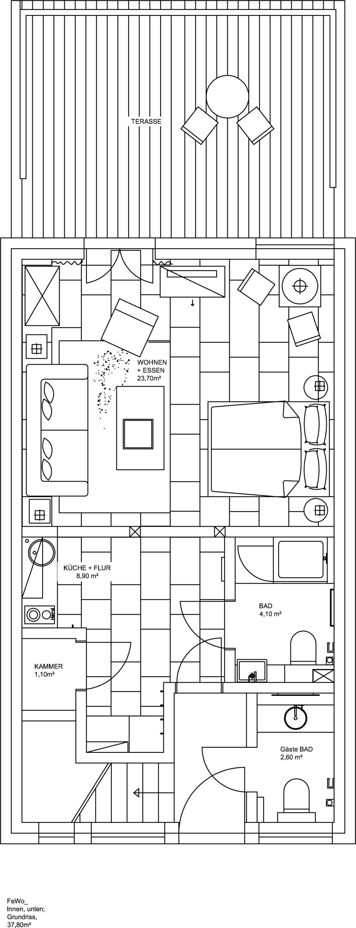 Die Ferienwohnung befindet sich im Erdgeschoss, mit eigener Holzterrasse, die in die Gartengestaltung mit einbezogen wurde.