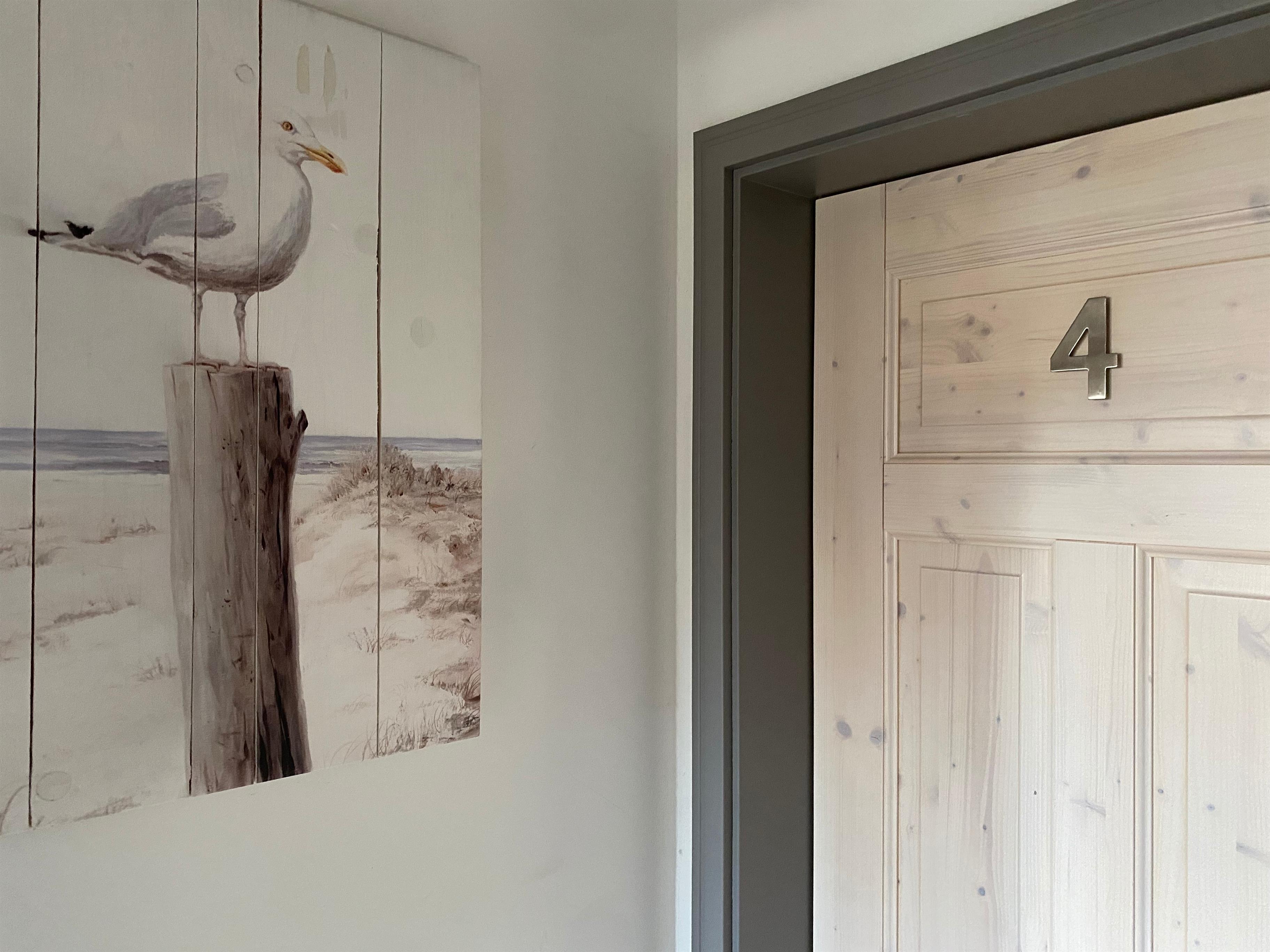 Die Ferienwohnung befindet sich im Obergeschoss. Vor Ort befinden sich Sitzmöglichkeiten, u.a. auch ein Strandkorb, im Garten, welche genutzt werden dürfen.