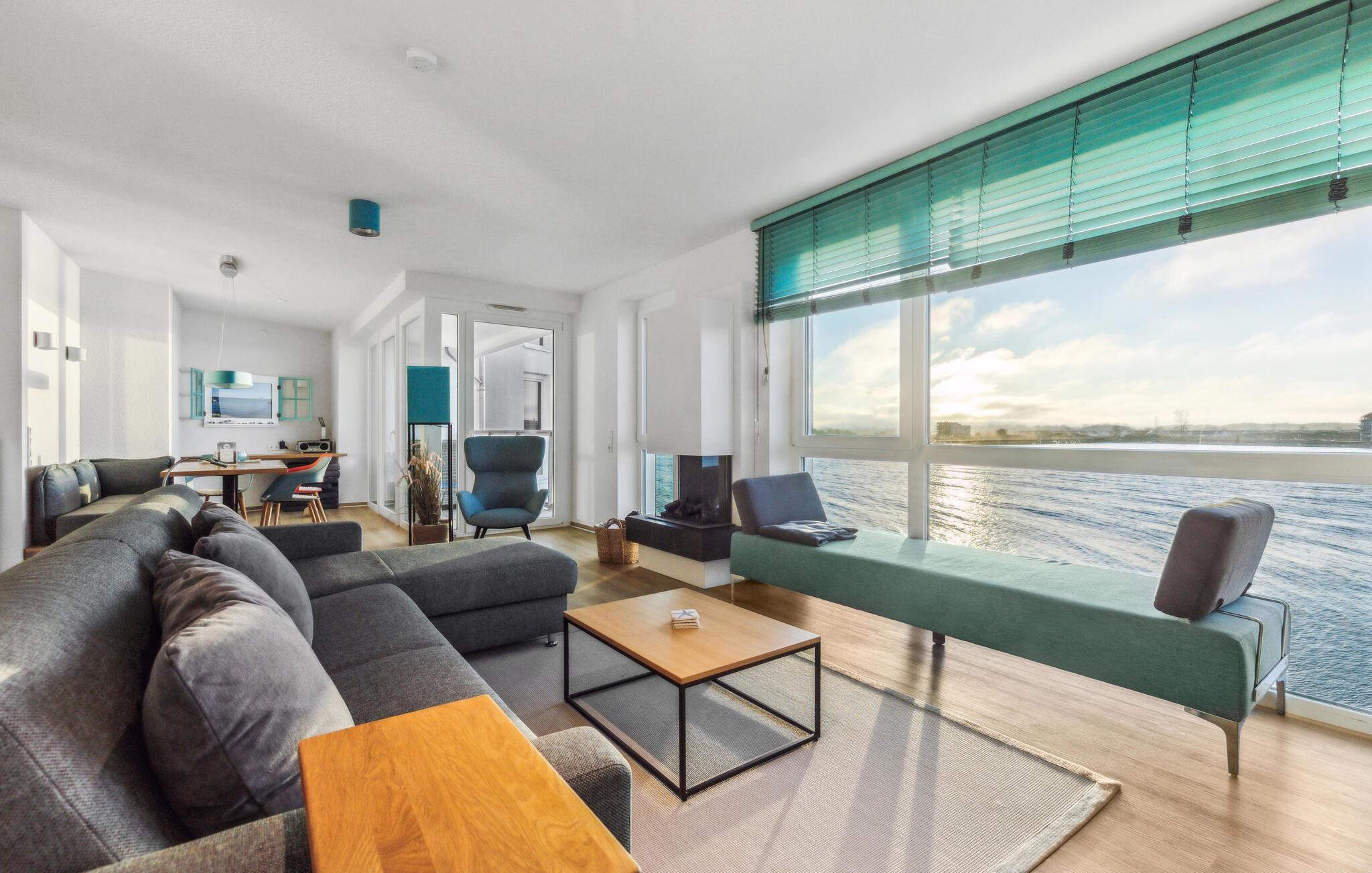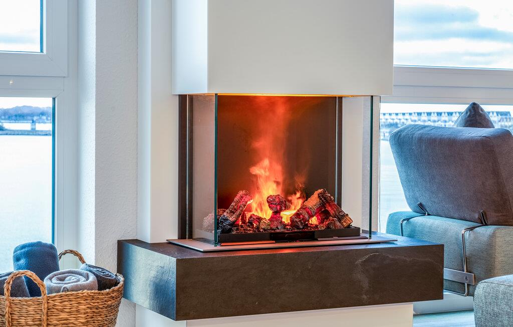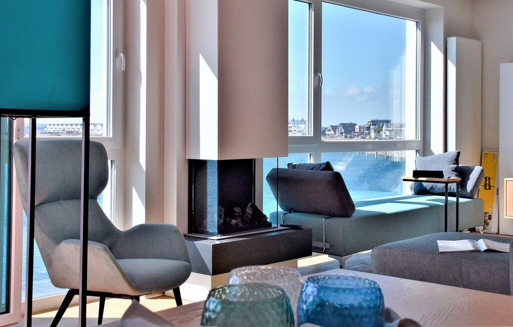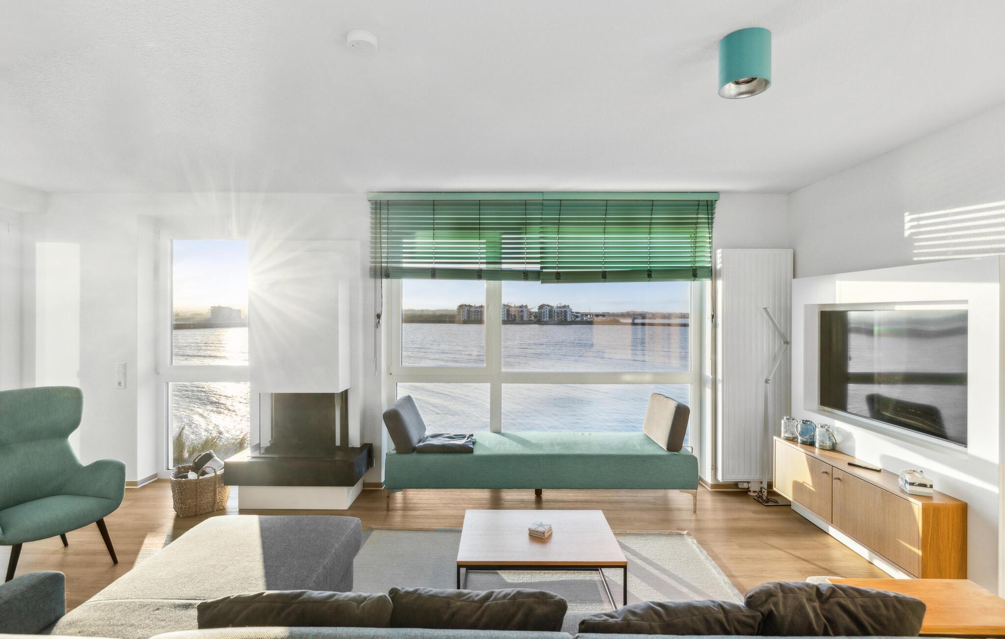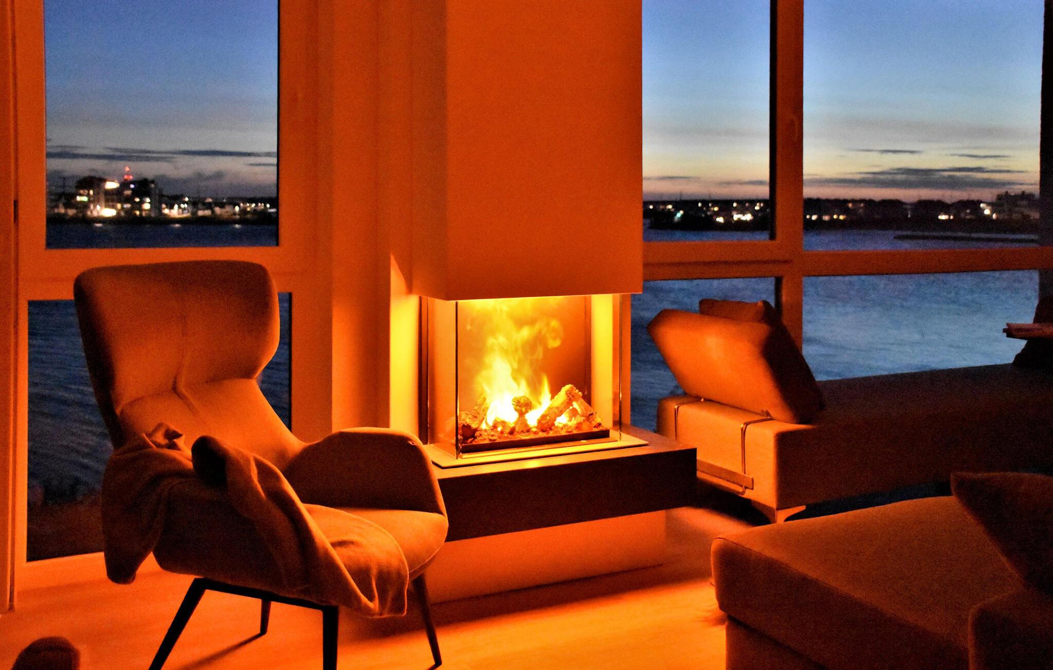 I dårligt vejr kan I komfortabelt observere alt dette fra sofaen eller fra den specialfremstillede puf – tilsyneladende lige over vandet. Om vinteraftener kan I nyde panoramaudsigten og de storslåede solnedgange fra det hyggelige sted ved pejsen.