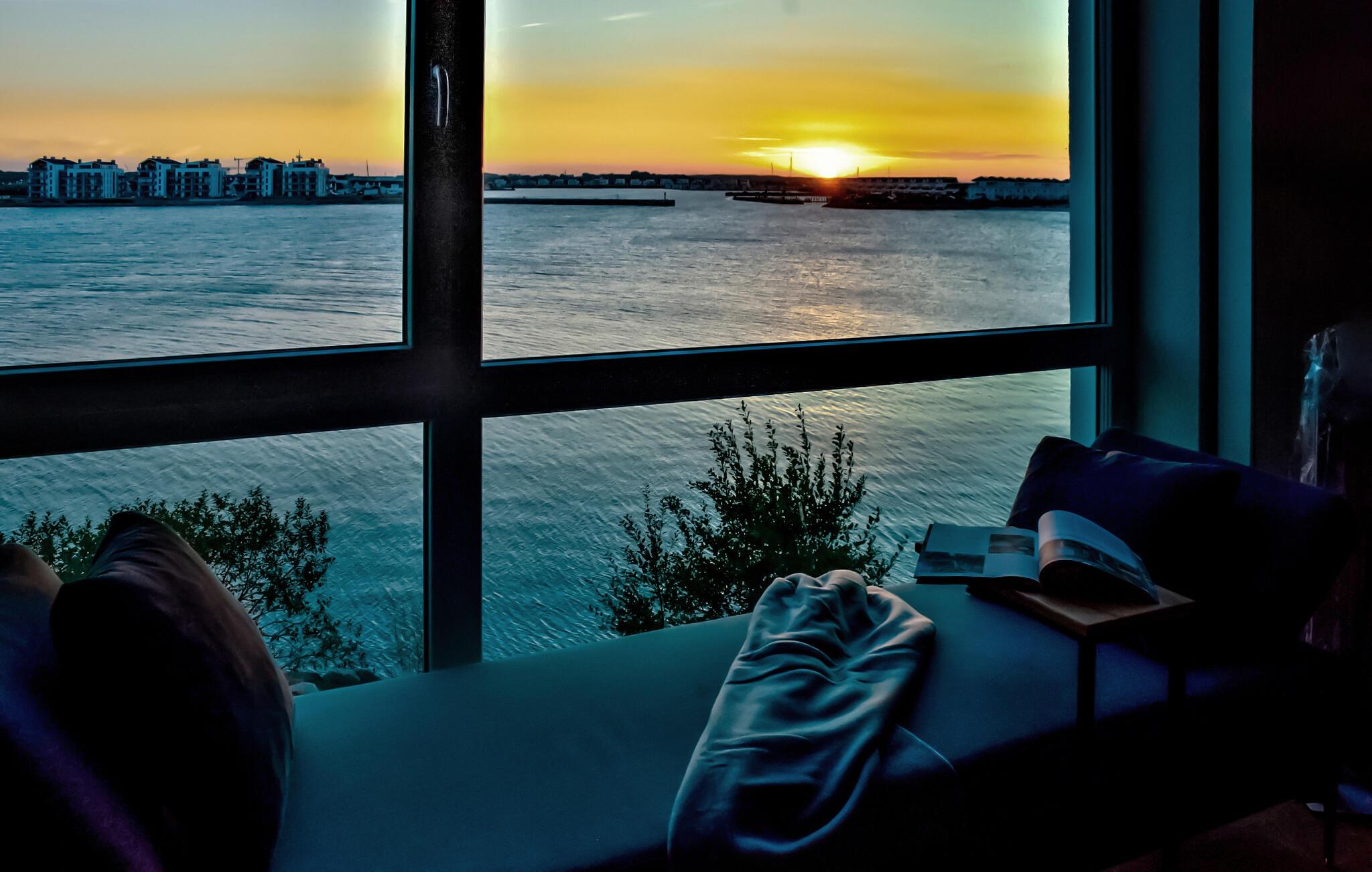 Gennem de store vinduer fra gulv til loft fejer blikket hen over havneindløbet, lystbådehavnen,s forbipasserende både. Skarver dykker i vandet, og marsvin cirkler ofte flere gange om dagen.