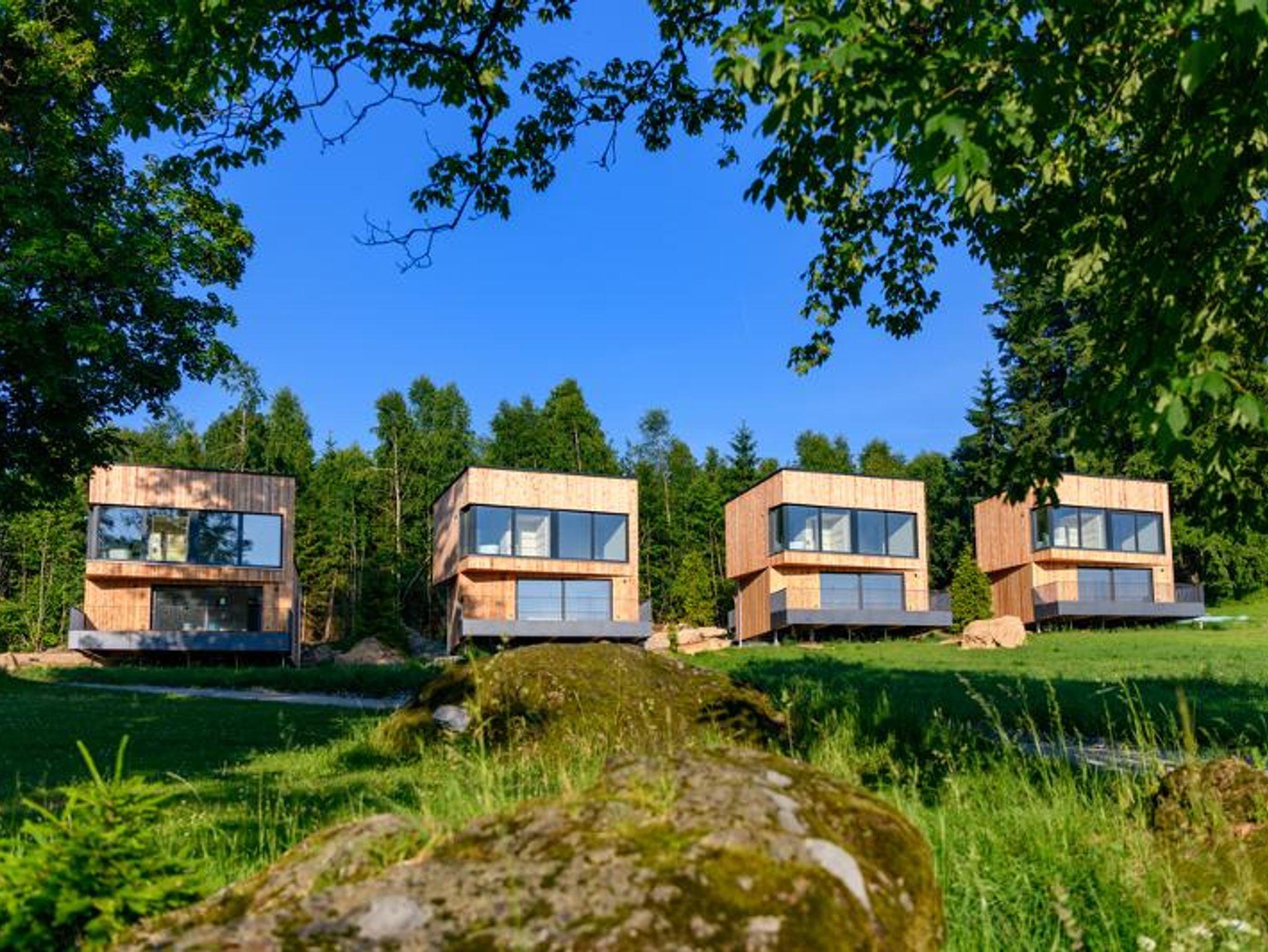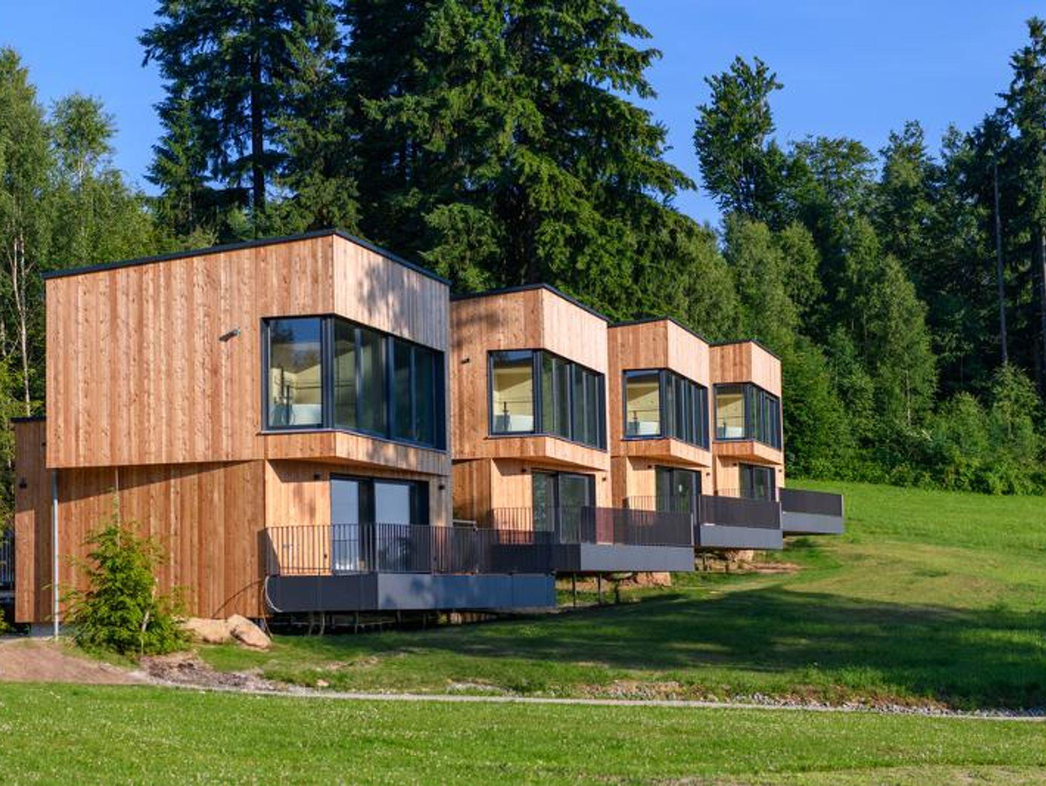 Die vier, zweistöckigen Chalets Reihen sich am oberen Waldrand entlang.