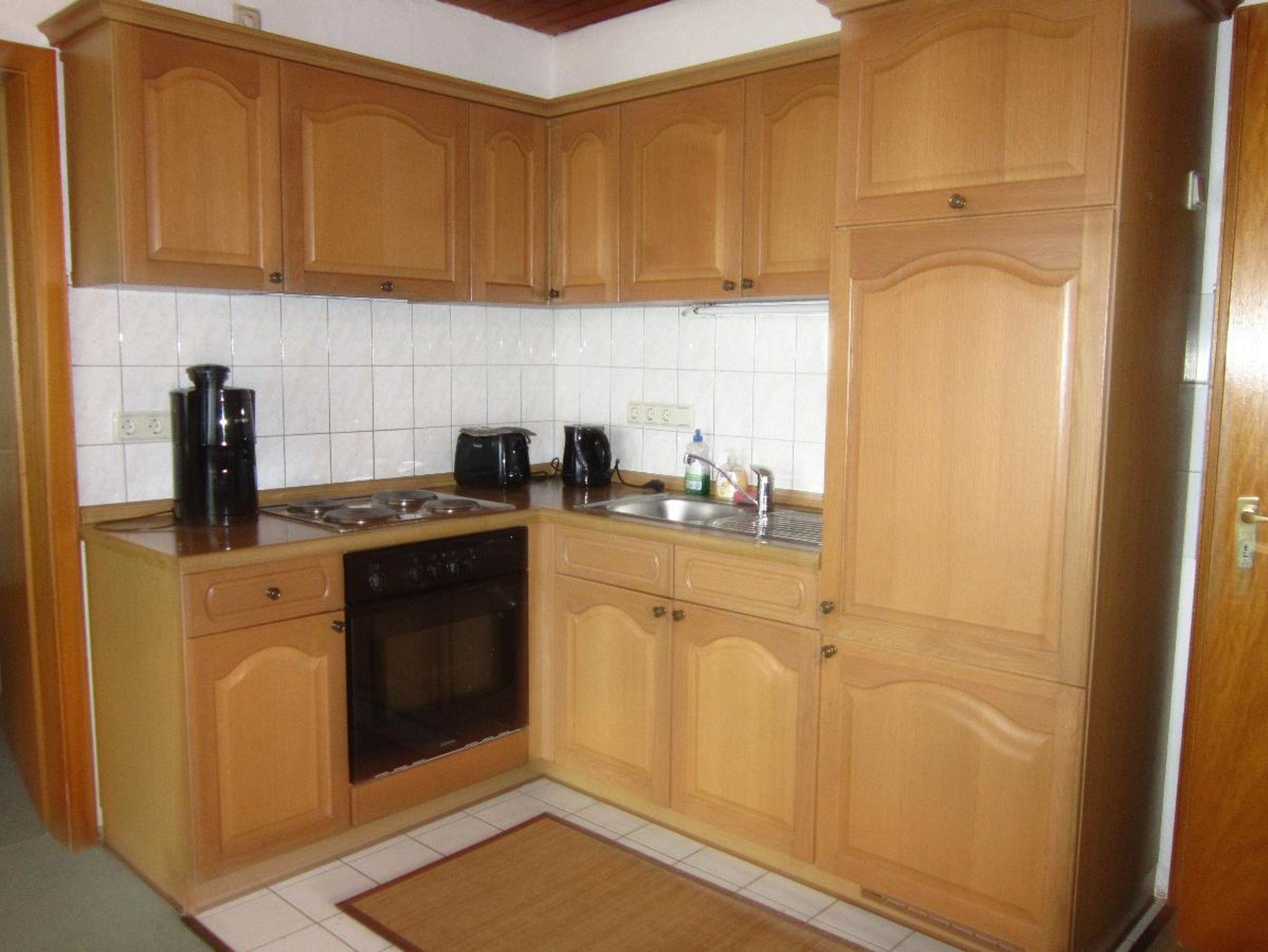 Einbauküche mit Gläsern, Geschirr, Besteck, Kaffemaschine, Toaster, Wasserkocher, Tischwäsche, Geschirrtücher,...