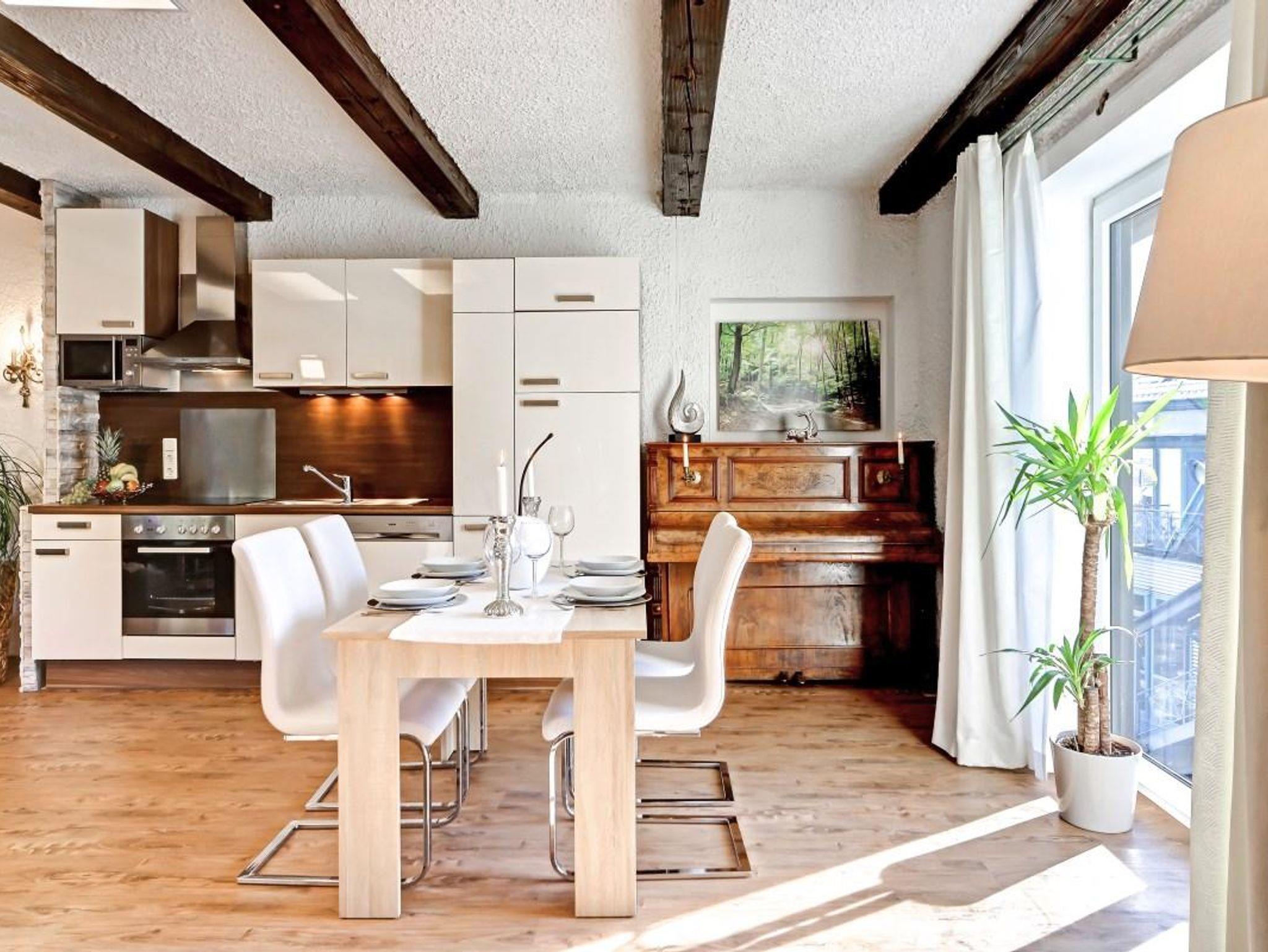 Die Wohnung besteht aus Vorflur, sehr großem Wohnzimmer mit Flach-TV, offenem Kamin, Erker mit gemütlicher Eckbank, Ess-Tisch für 4 Personen, großer moderner Küchenzeile mit Geschirrspüler, großen separaten Schlafzimmer mit Himmelbett und 2. Fernseher, Dusche-WC, ca. 10m Balkon nach hinten zum Garten und vielem mehr . . .