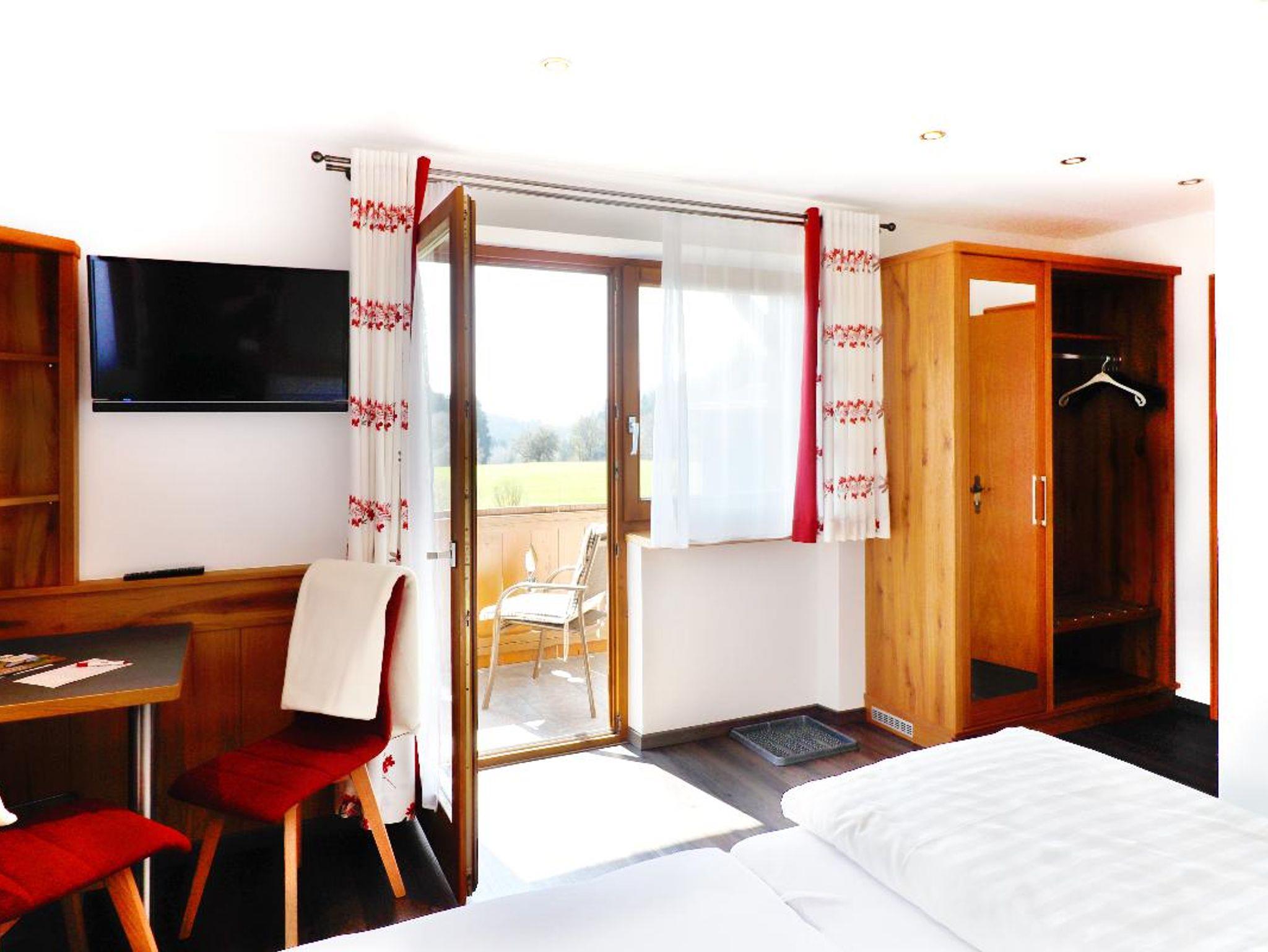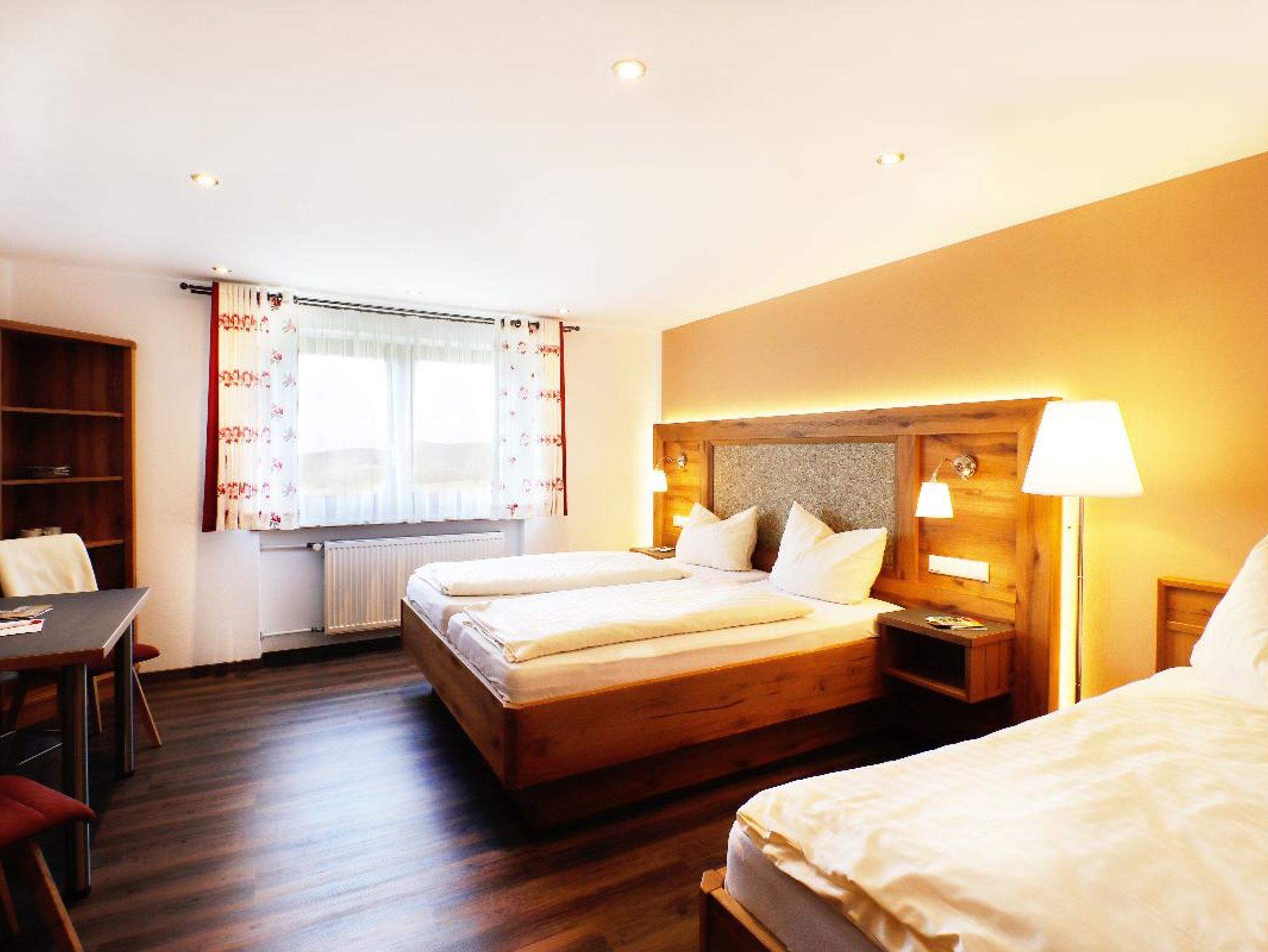 Dreibettzimmer bayerisch-edel, ca. 22m², Tisch mit Stühlen, Kleiderschrank, Bad mit Dusche und WC, Föhn, Kosmetikspiegel, Radio, TV, Wasserkocher, Geschirr.