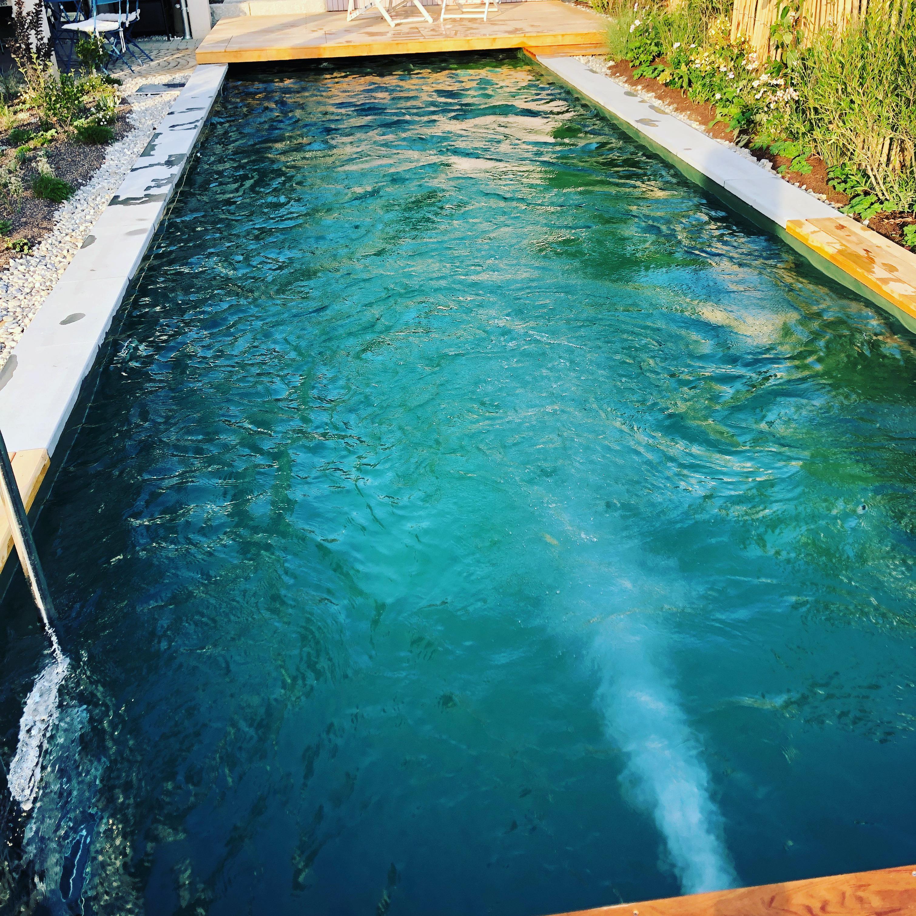 Die Gartenmöbel aus Teakholz sind mit Polstern, Kissen und Decken ausgestattet und sorgen damit für entspannte Stunden auf der Terrasse. Der gemeinsame Garten mit beheiztem Naturpool kann das ganze Jahr zum Auftanken genutzt werden.