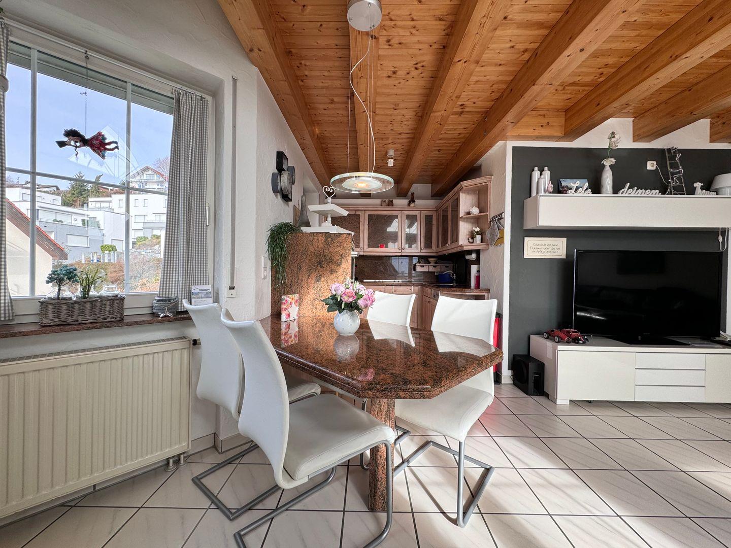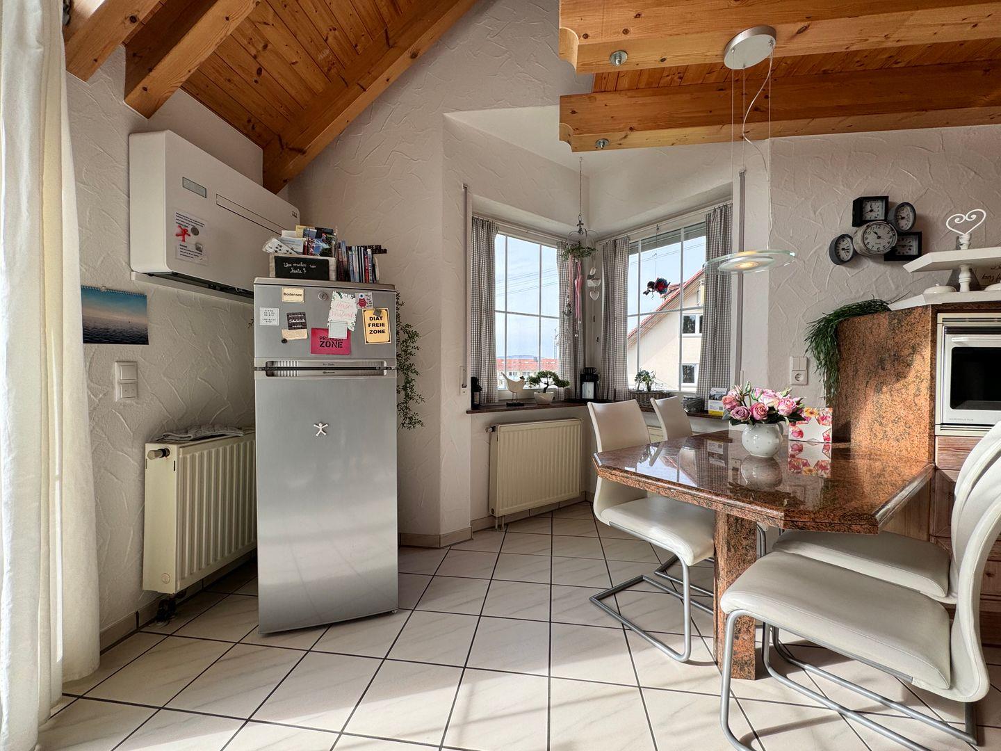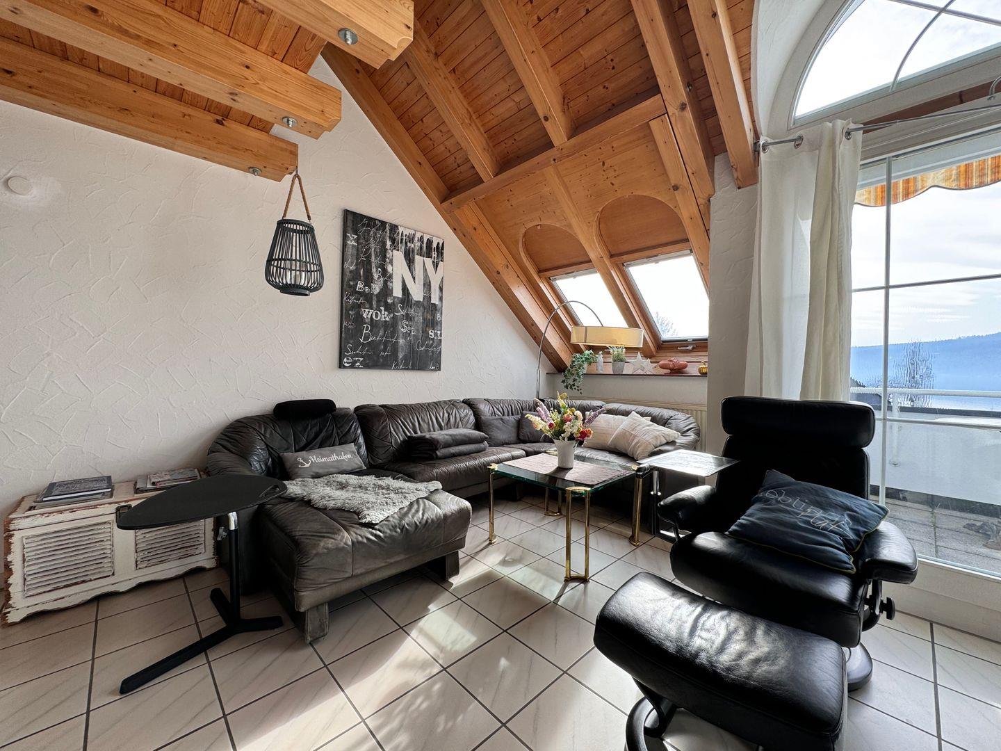 Der großzügige Wohnbereich mit offener Küche lädt zu entspannten Stunden ein. Die gut ausgestattete Küche, integriert in den Wohn- und Essraum, ermöglicht gemeinsame Kocherlebnisse. Der Essbereich mit Seeblick bietet einen besonderen Charme für Frühstück, Mittag- oder Abendessen. Eine Terrasse erweitert den Wohnraum nach Außen.