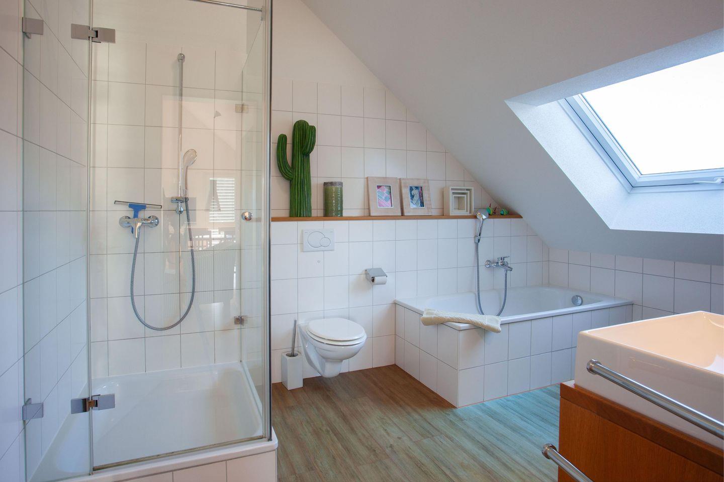 Das moderne Badezimmer verfügt über Dusche und Badewanne und bietet viel Platz für einen angenehmen Start in den Tag oder entspannte Abendstunden.