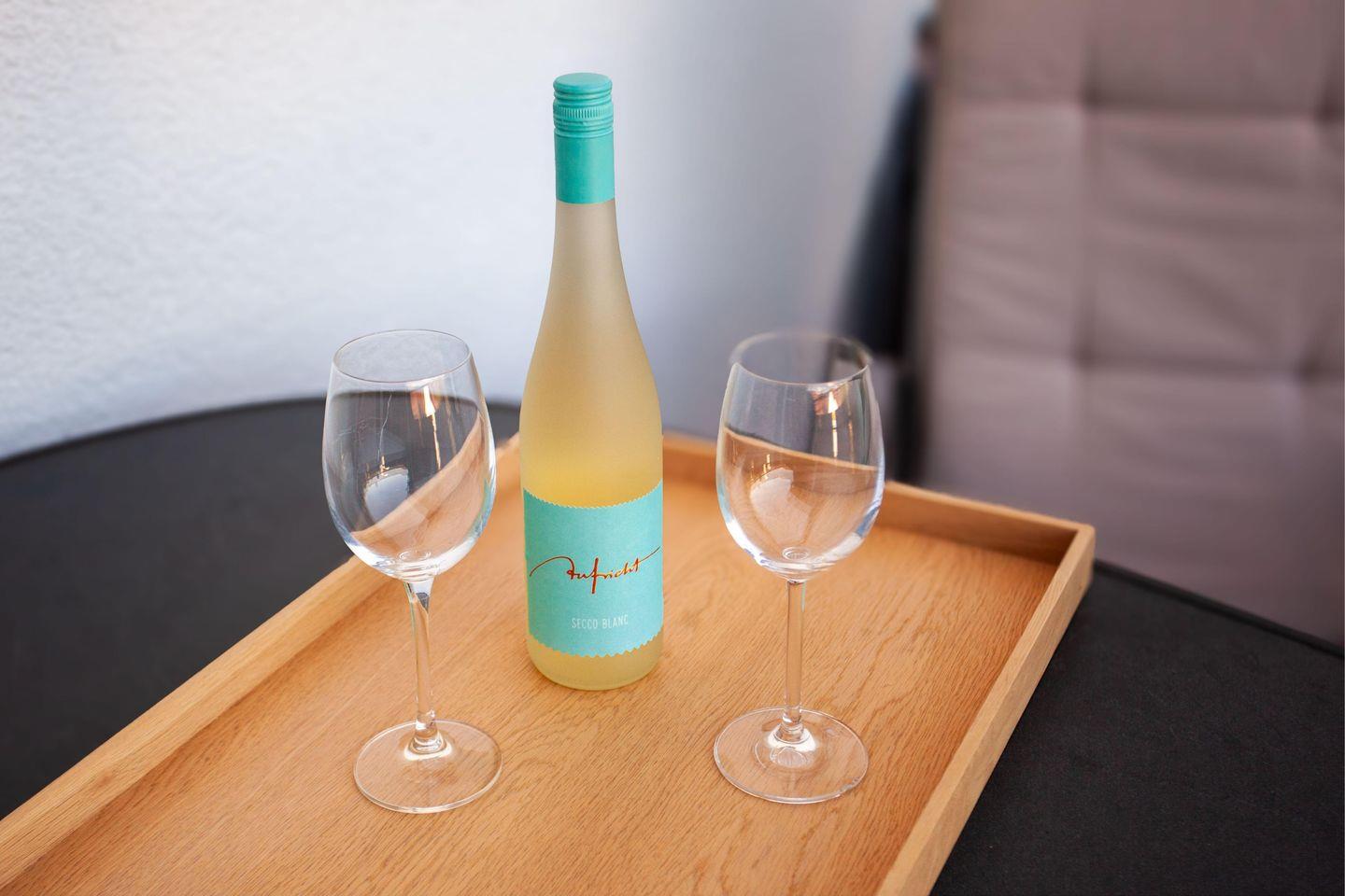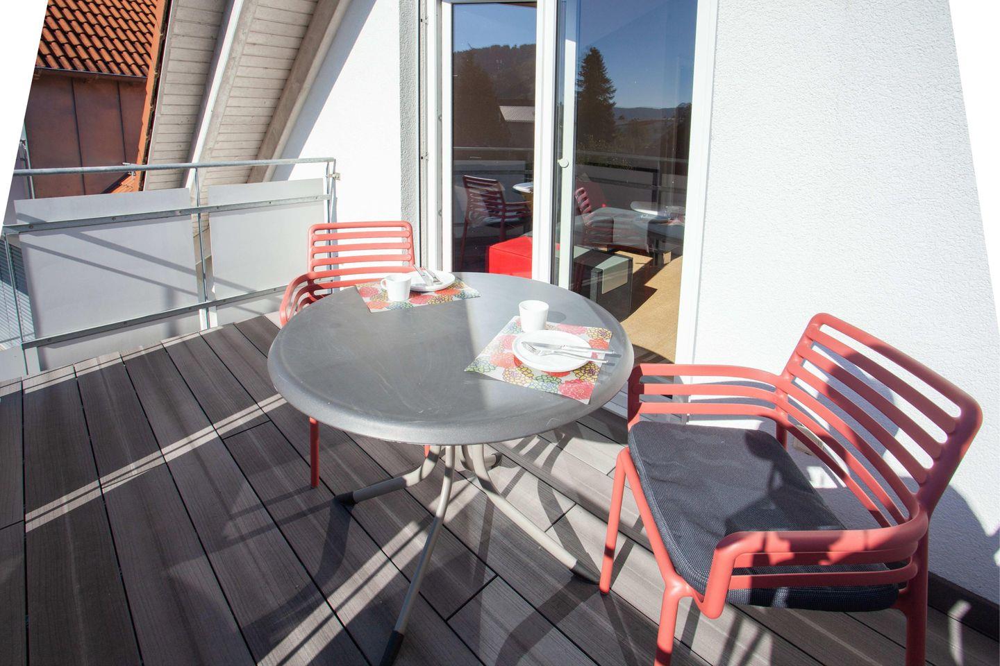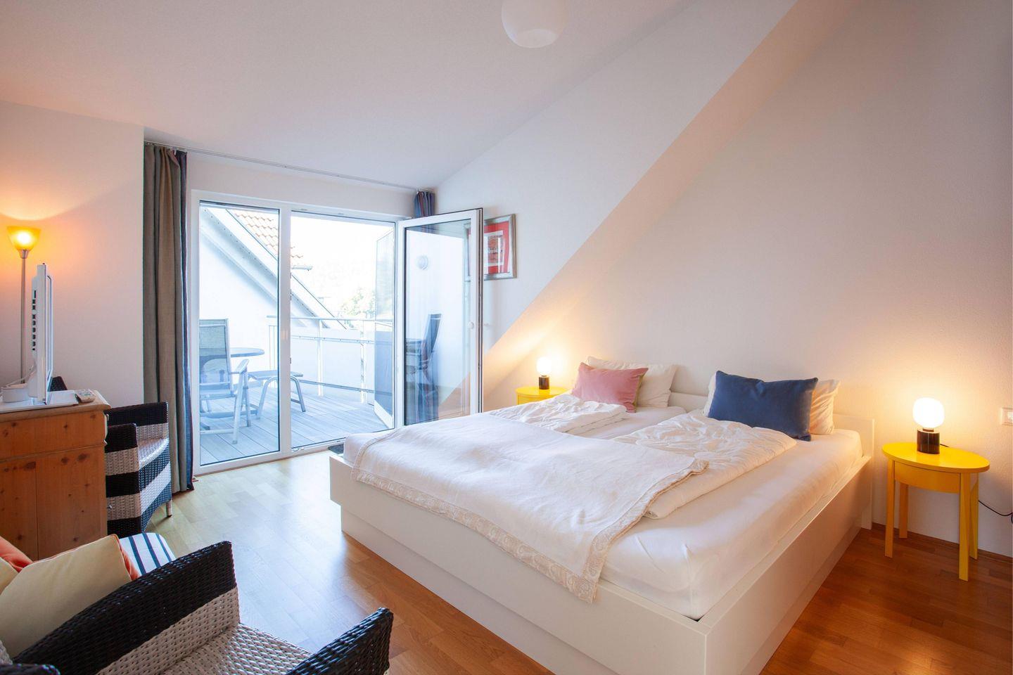 Das Schlafzimmer ist hell und freundlich gestaltet und bietet mit einem komfortablen Doppelbett beste Voraussetzungen für erholsame Nächte. Von hier aus gelangen Sie direkt auf den Balkon, der mit Blick ins Grüne und Richtung Bodensee zu ruhigen Momenten im Freien einlädt.
