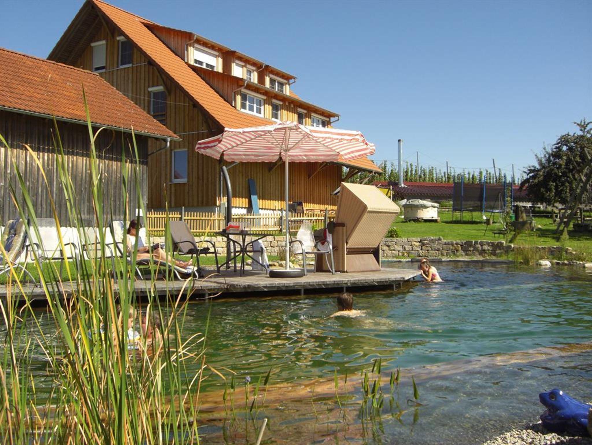 Unser Ferienhof liegt landschaftlich schön gelegen, mit Hopfen, Obst, Pferden und Brennerei. Ein großer Hofraum lädt zum Spielen und Verweilen ein. Ob Familienurlaub oder zu Zweit, bei uns finden Sie neue, komfortabel eingerichtete Ferienwohnungen. Heissbadefass, WLAN, Grill-und Spielplatz, Schwimmteich, Hausprospekt, geführtes Reiten, Kutschfahrten, Brennereiführung mit Verkostung.