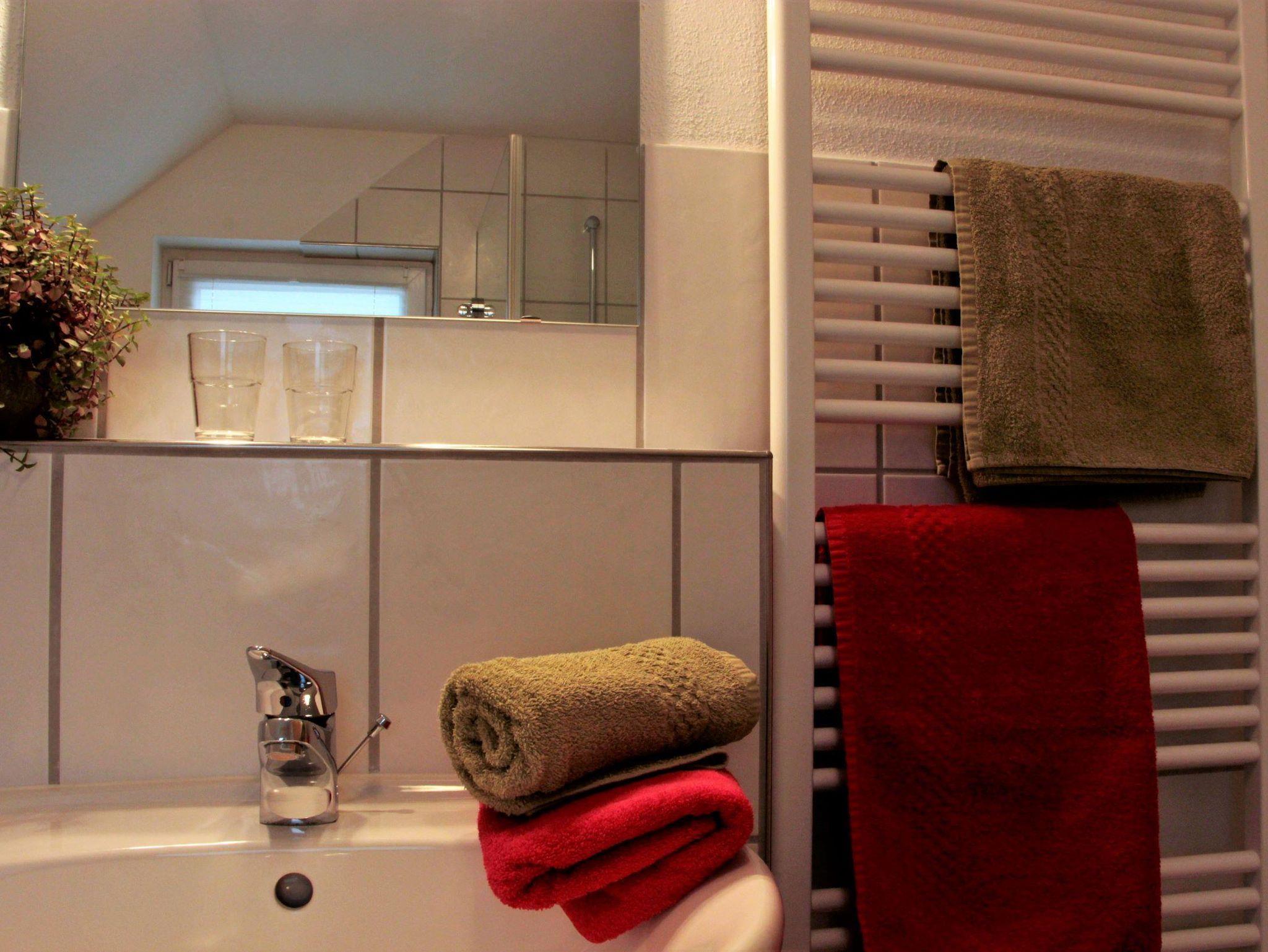 Im Badezimmer mit Außenfenster Dusche, Badewanne und Toilette haben wir Handtücher für Euch bereit gelegt. Seife, verschiedene Hygieneartikel und Toilettenpapier sind für die ersten Urlaubstage vorhanden.
