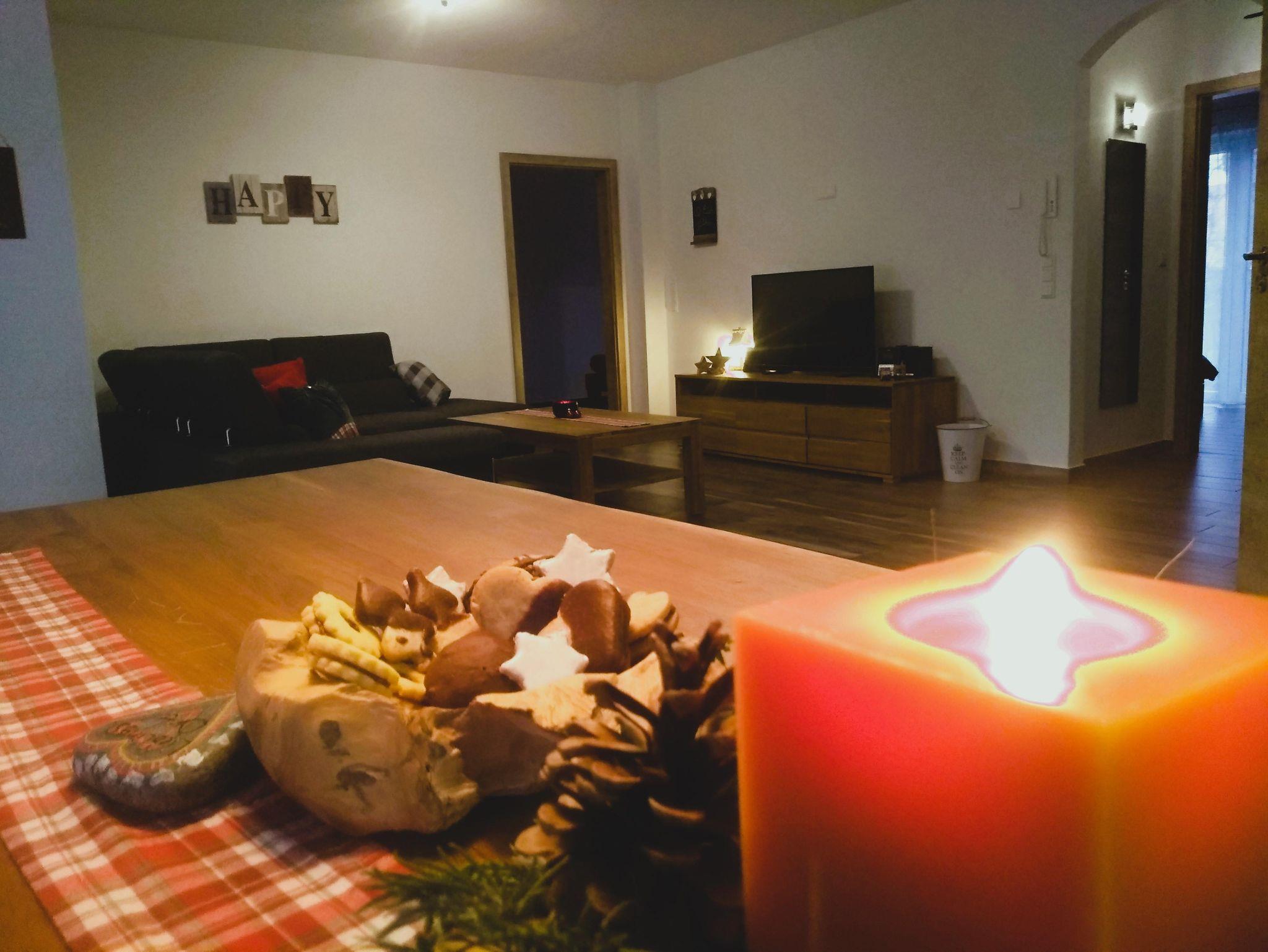 Im hellen Wohnbereich mit komplett ausgestatteter Küchenzeile, Echtholztisch, großem Sofa und Balkonzugang genießt Ihr die Morgensonne zum Frühstücken.