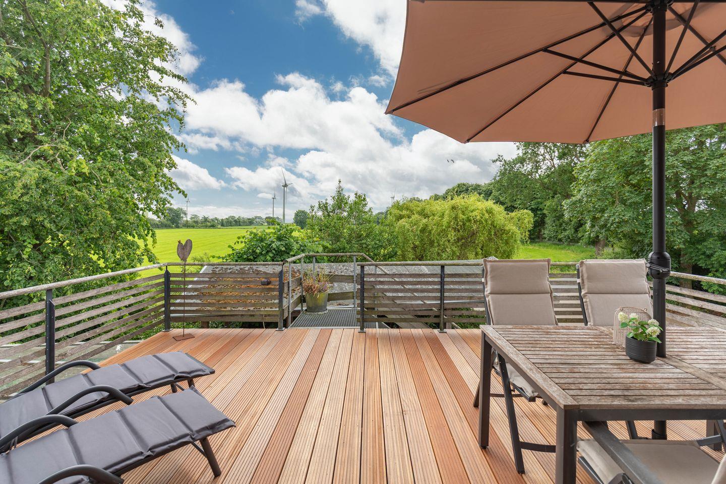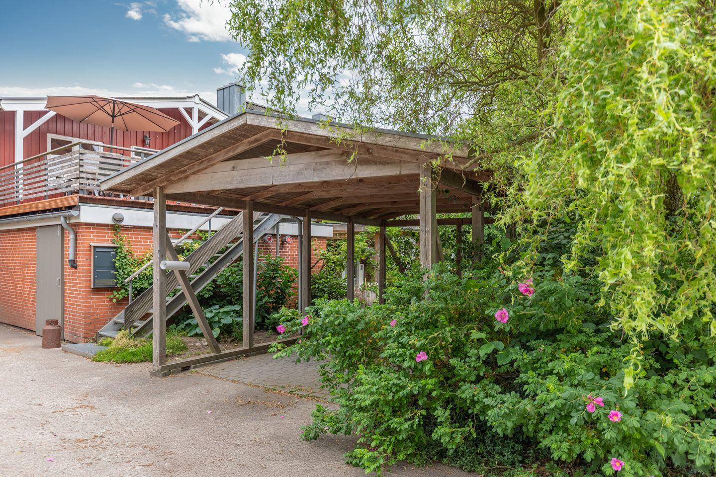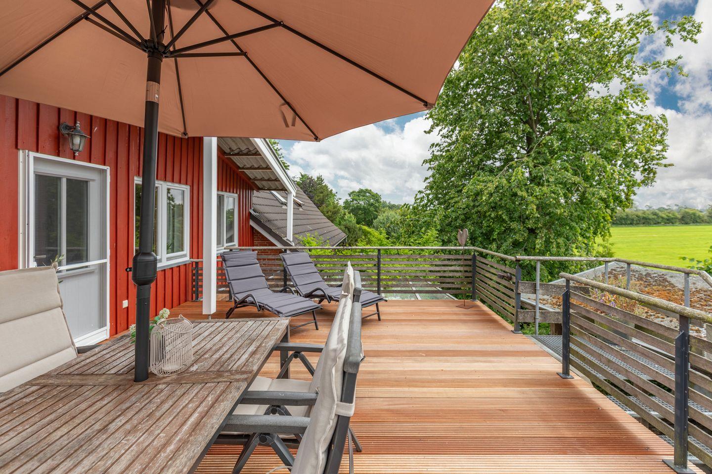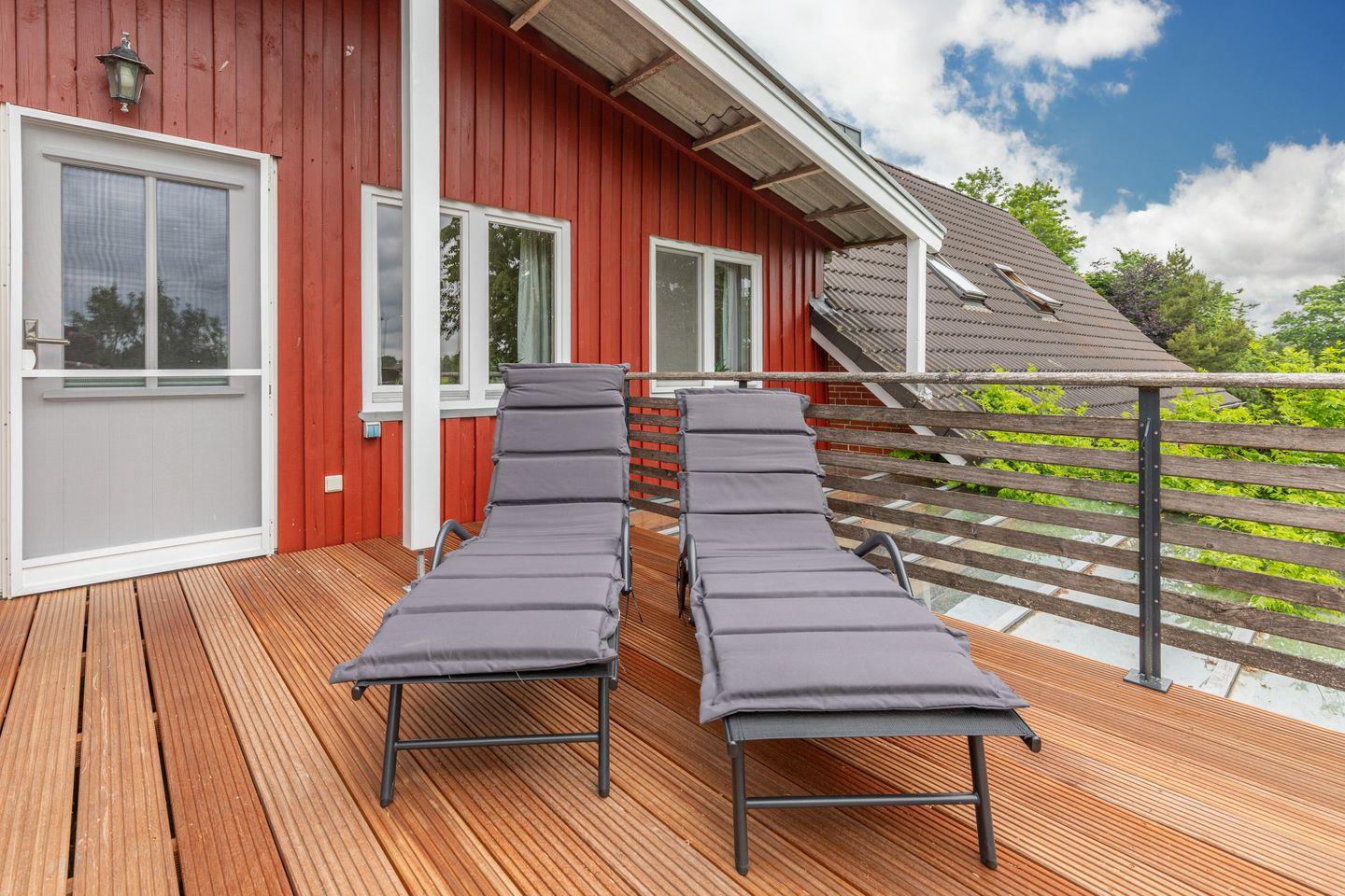 Für entspannte Stunden im Freien lädt ein überdachter Balkon mit Sonnenliegen, Gartenmöbeln und Sonnenschirm zum Verweilen ein. Ein Gasgrill steht für Grillabende bereit. Die ländliche Umgebung eignet sich hervorragend zum Spazierengehen, Radfahren oder einfach zum Genießen der Ruhe. Der hauseigene Privatparkplatz mit Carport bietet einen -sicheren Abstellplatz für Ihr Fahrzeug. E-Bikes können im Schuppen sicher untergestellt und draußen im Raum (links von der Treppe) sicher aufgeladen werden.