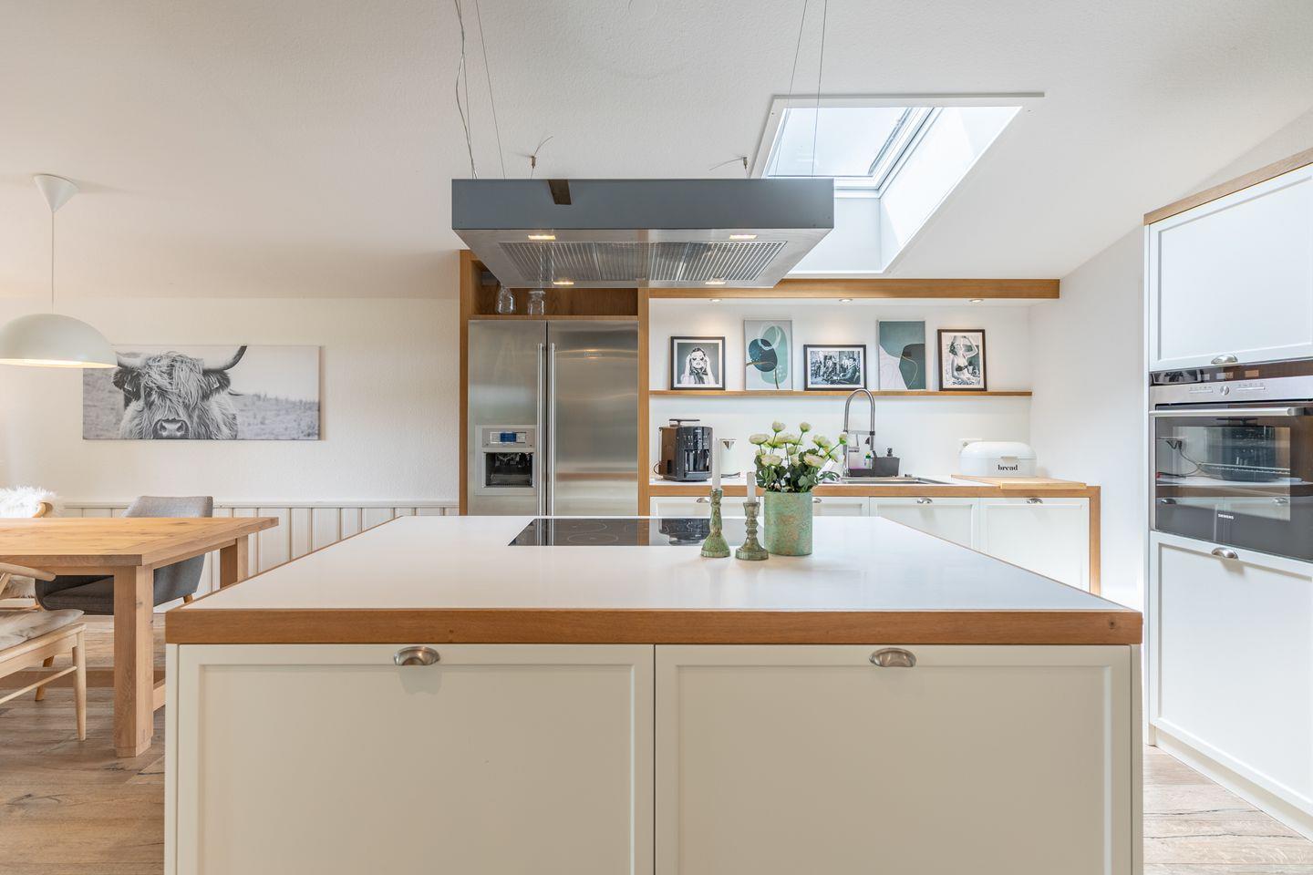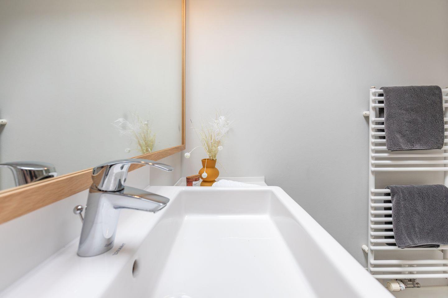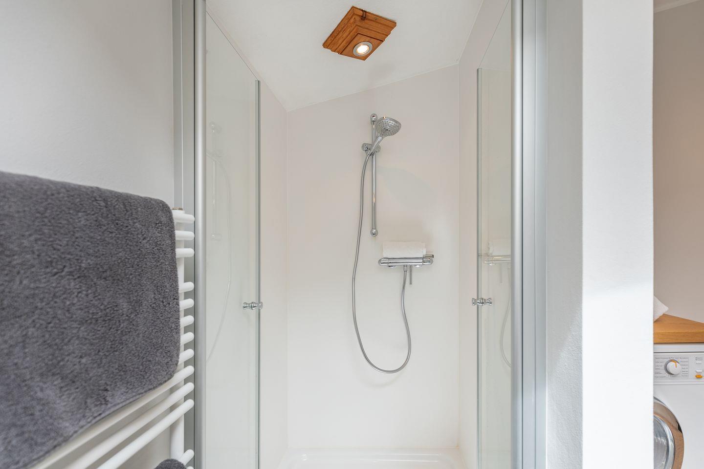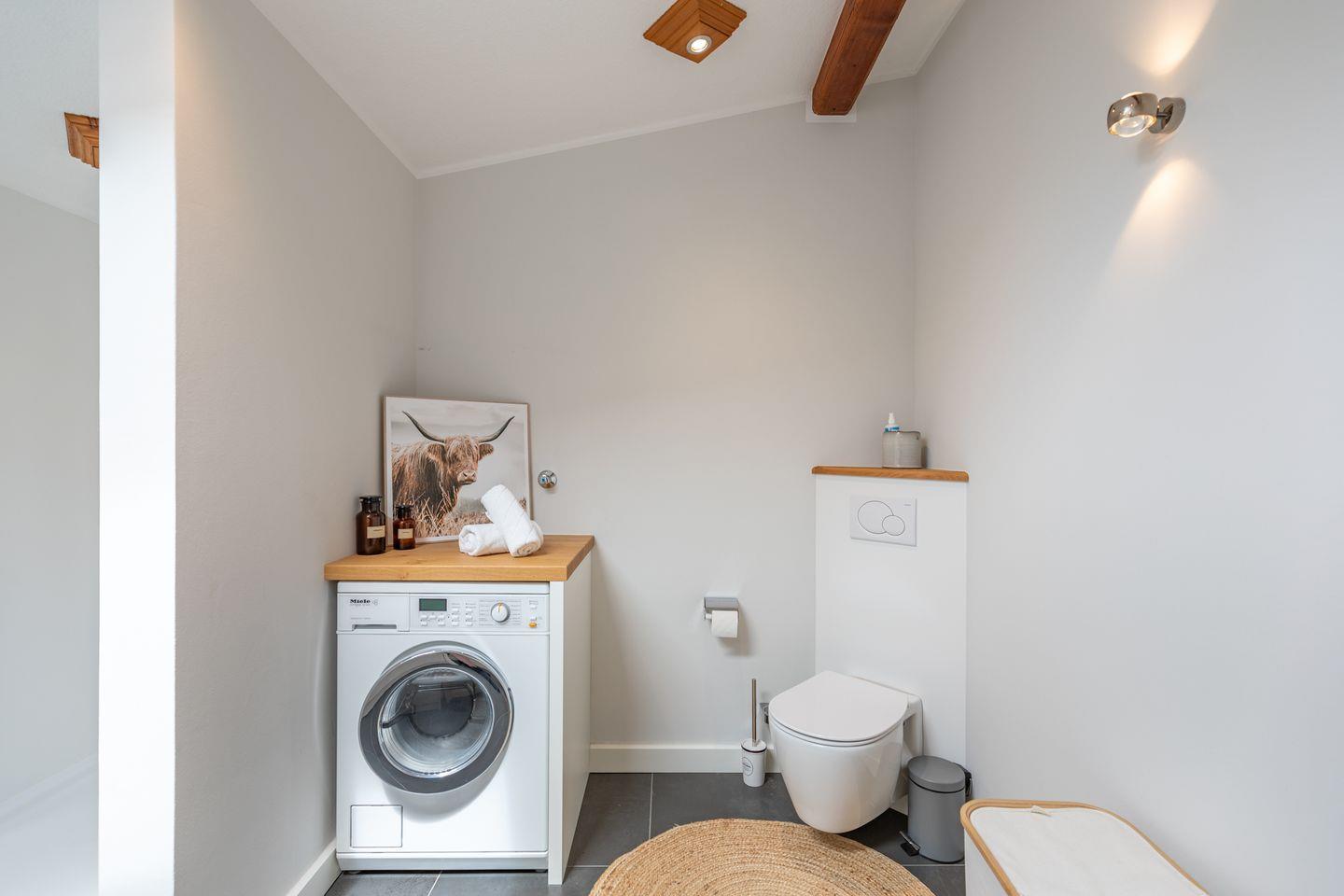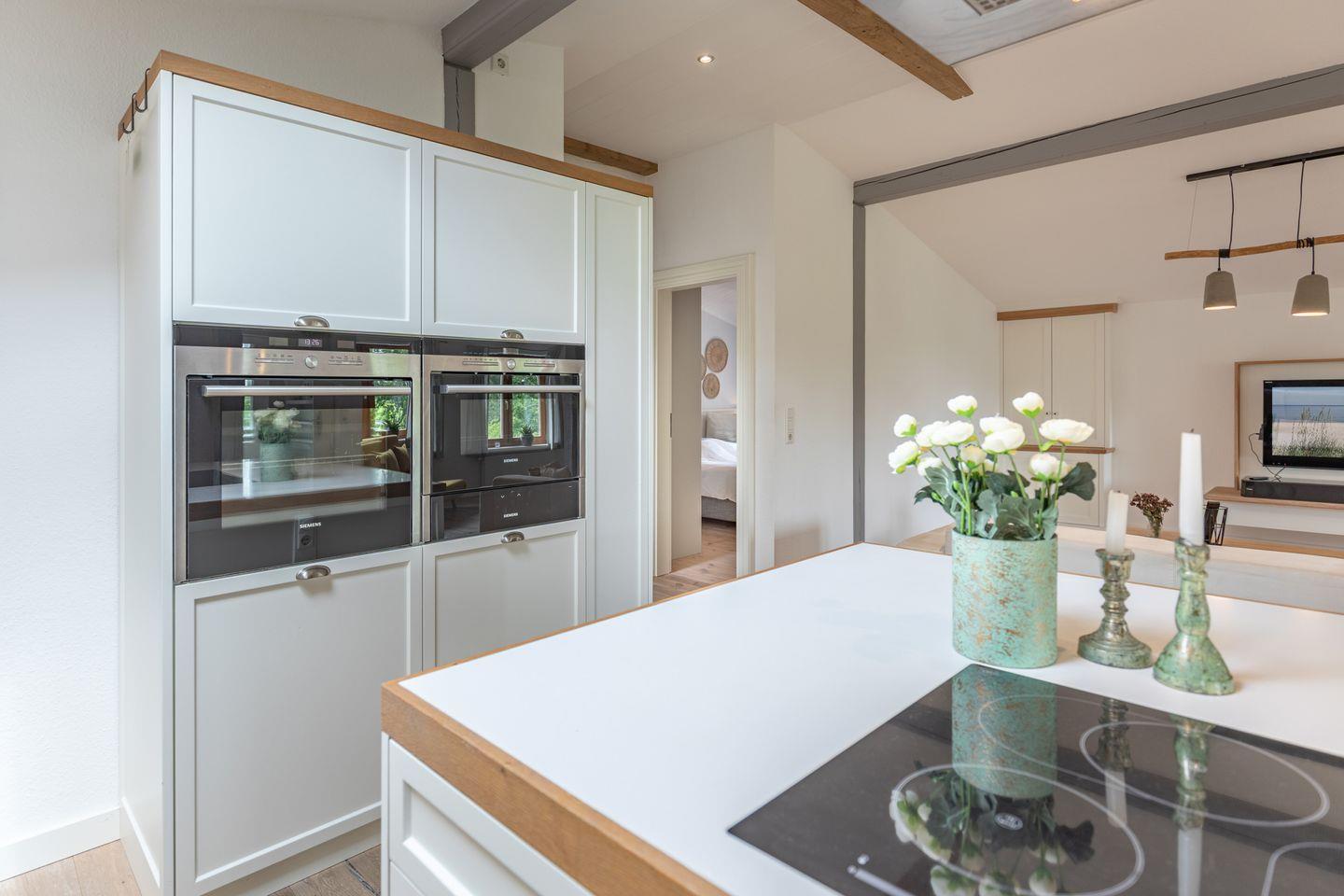 Für Selbstversorger ist die Küche hochwertig und umfassend eingerichtet: Induktionsherd, Backofen, Mikrowelle, Geschirrspüler, Kühlschrank mit Gefrierfach, Kaffeemaschine, Espressomaschine, Wasserkocher, Toaster, Mixer sowie zahlreiche Küchenutensilien und Gewürze sorgen für Wohnkomfort auf hohem Niveau. Ein Kinderhochstuhl steht bereit, sodass auch Familien mit kleinen Kindern bestens umsorgt sind. Das Badezimmer ist mit Dusche, WC, Waschbecken, Haartrockner, und Spiegel ausgestattet. Des Weiteren stehen Waschmaschine, Trockner und Wäscheständer zur Verfügung.