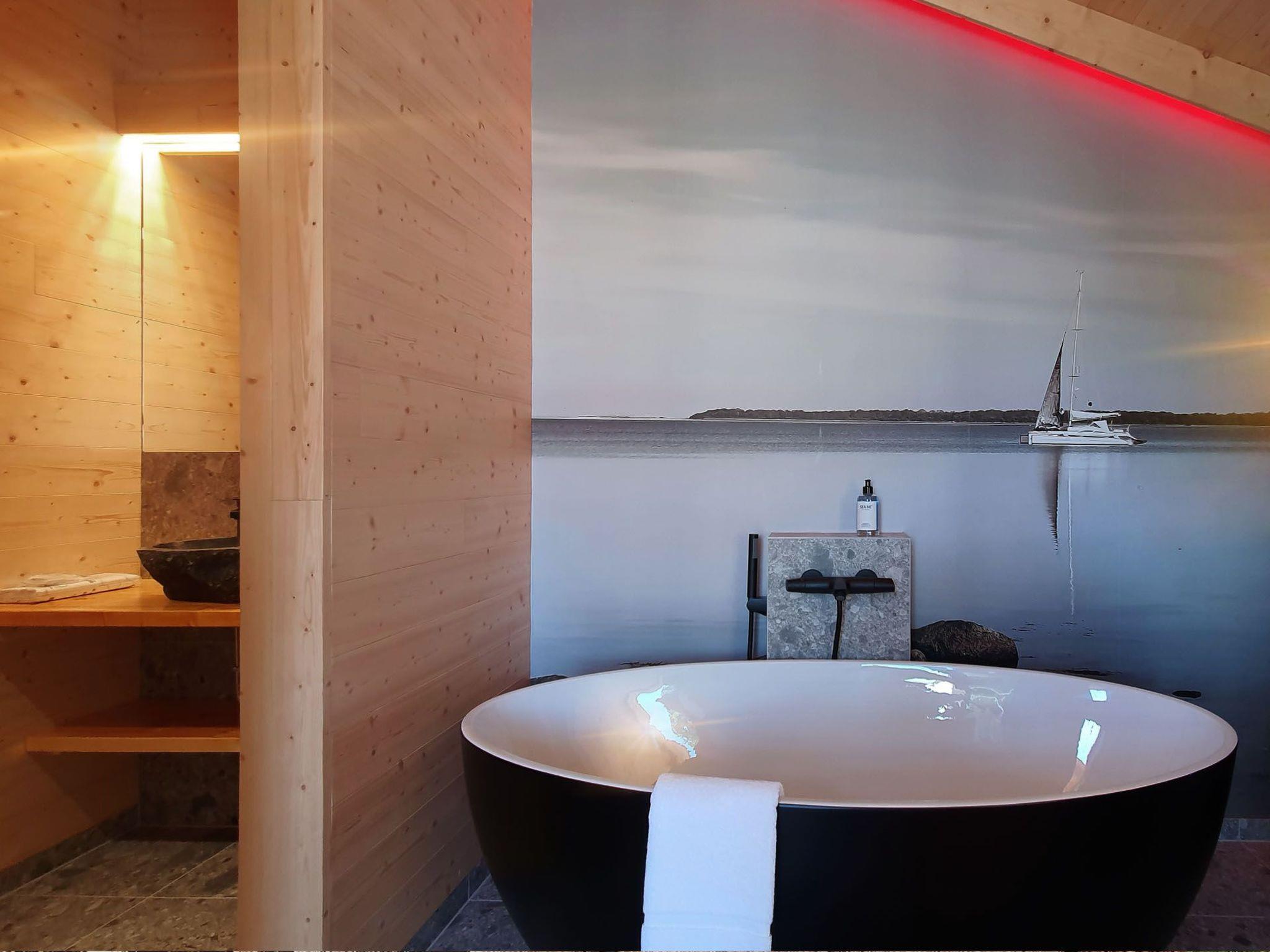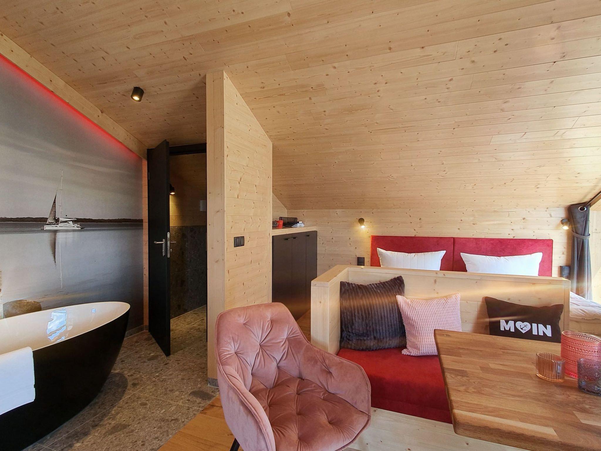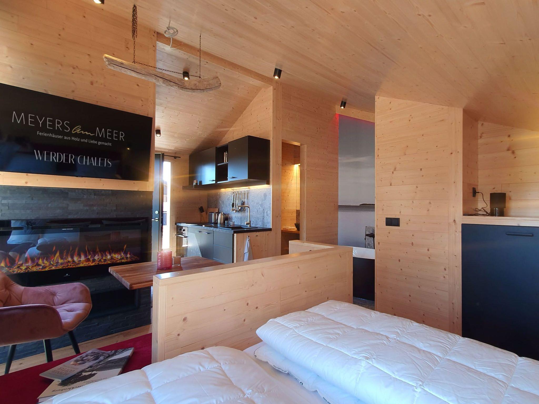 The interior of our holiday home enchants with modern comfort and loving details. A large king-size bed invites you to cosy Netflix nights, while the small, well-equipped kitchen makes self-catering a pleasure. An absolute highlight is the free-standing bathtub, which together with the walk-in shower creates a real spa feeling. The offer is rounded off by the electric fireplace, which provides cosy warmth and romance on chilly evenings.