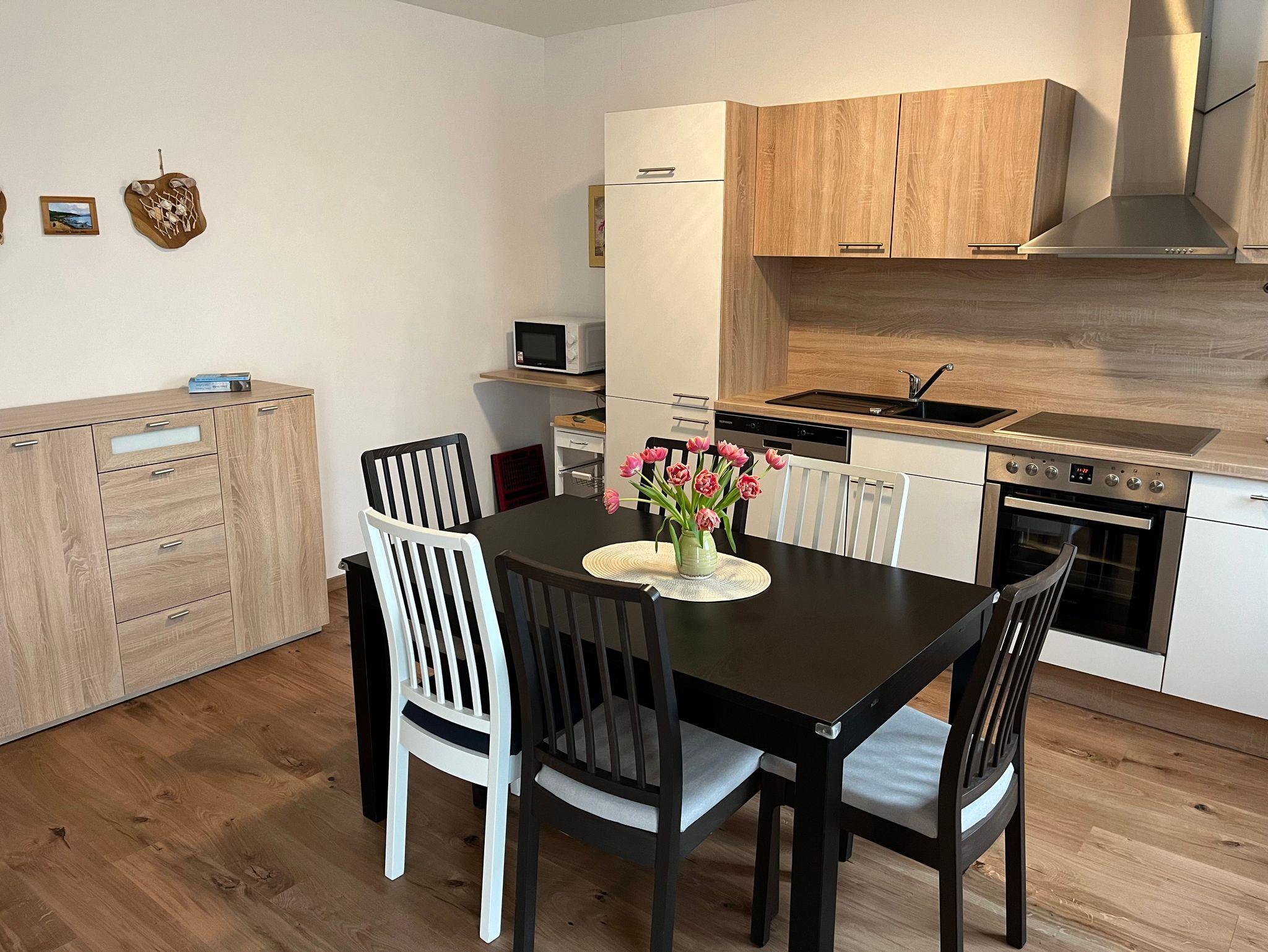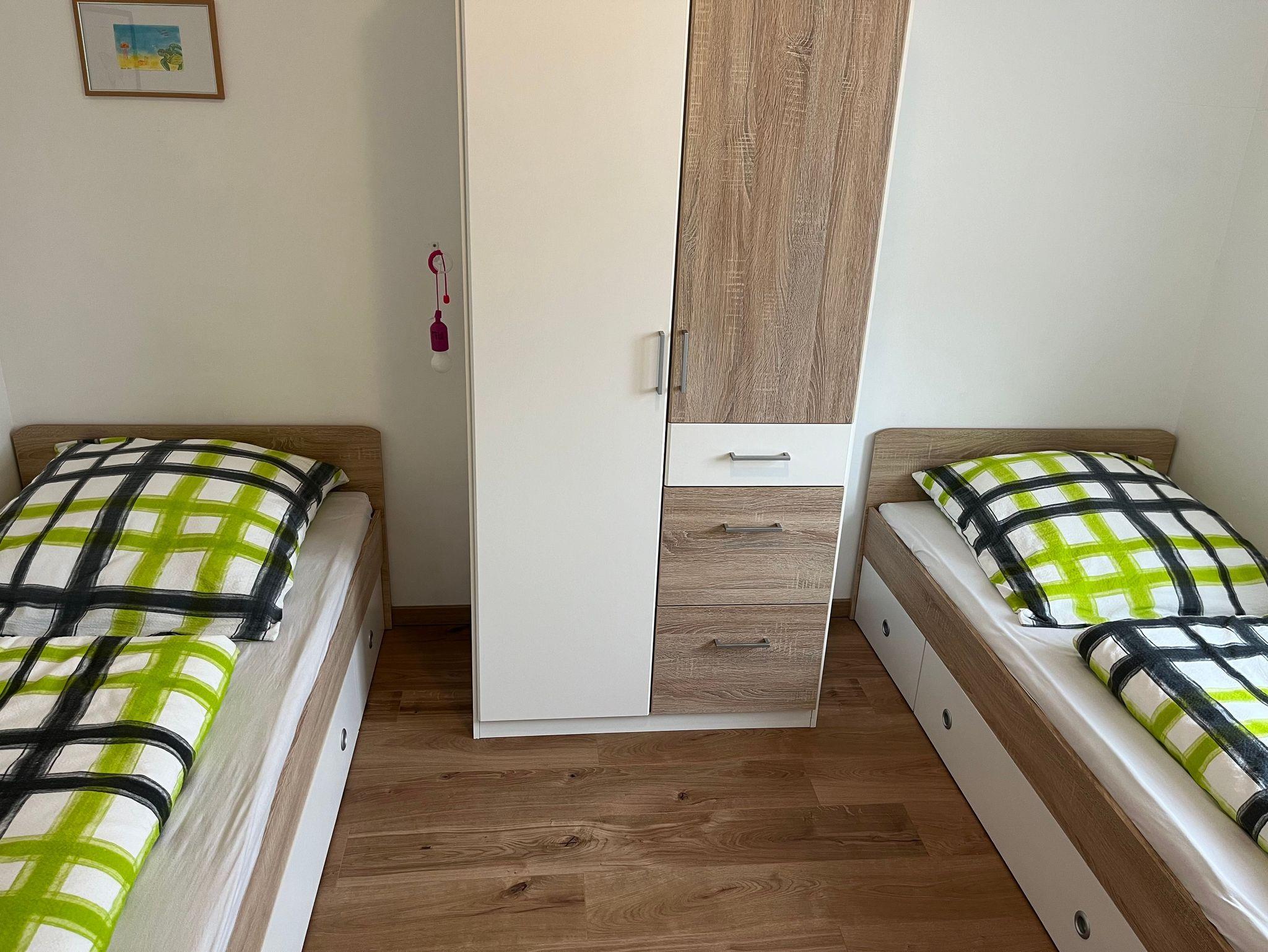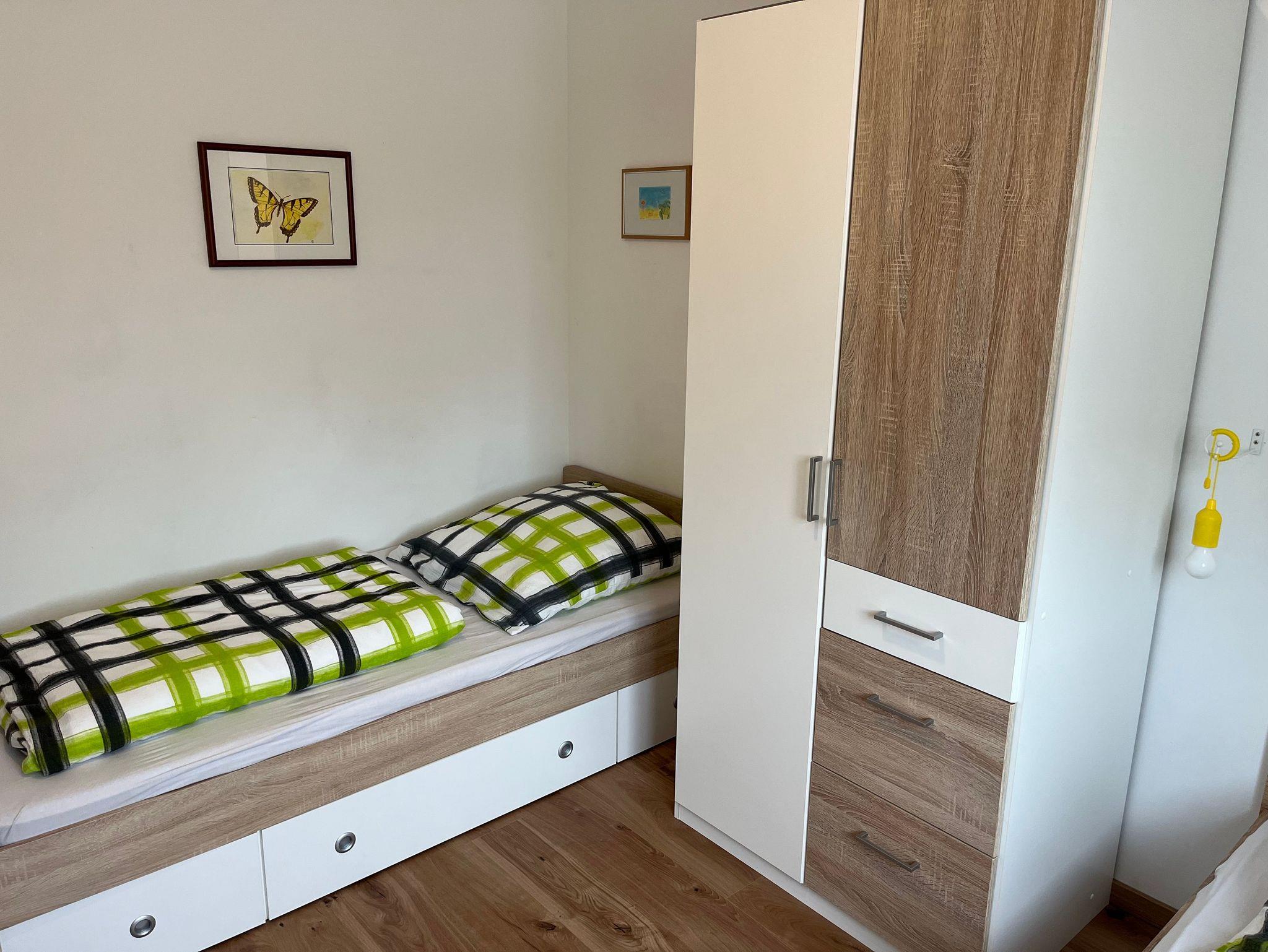 Waschmachine, Kinderreisebett und Kinderhochstuhl sind vorhanden.