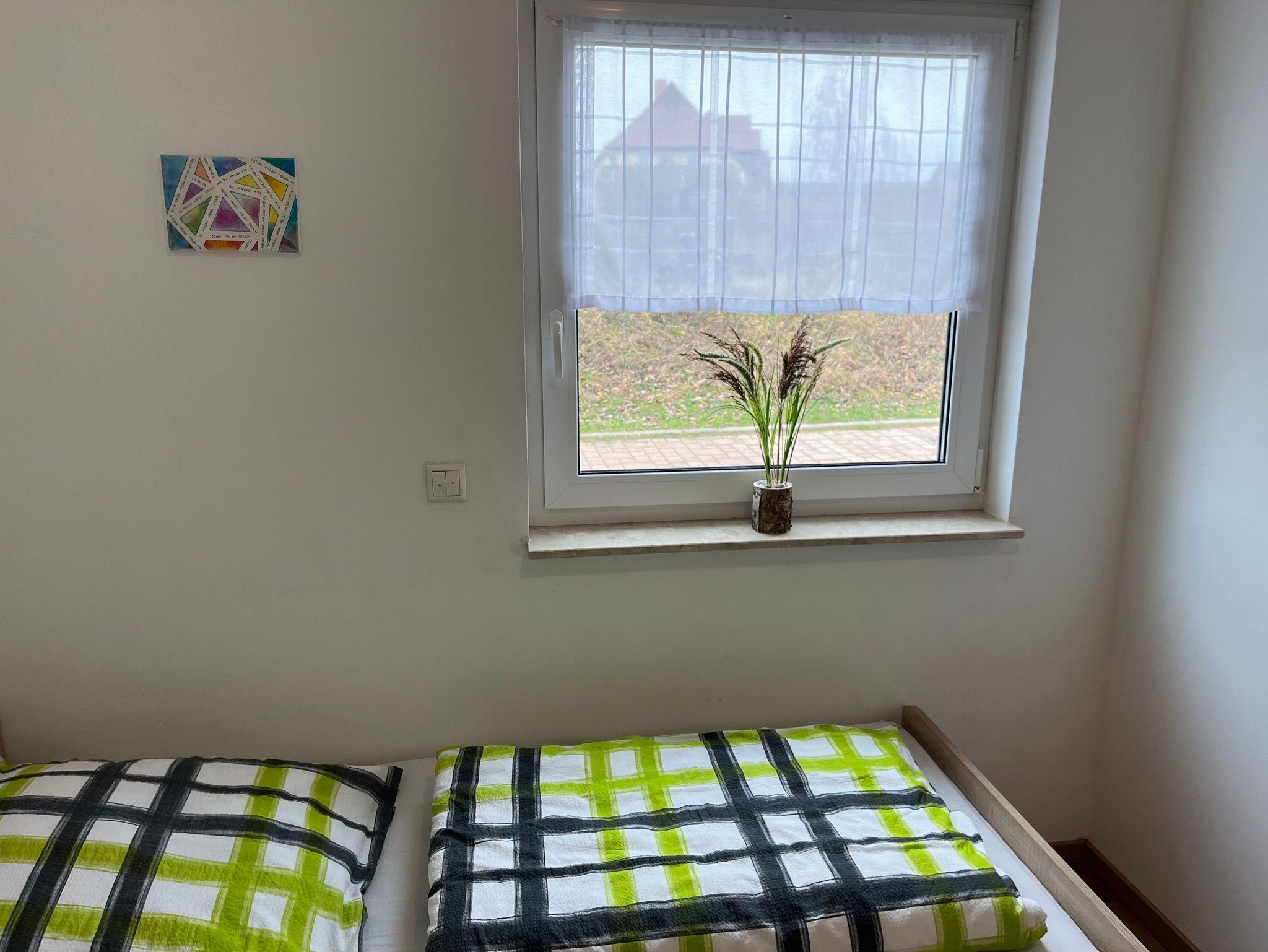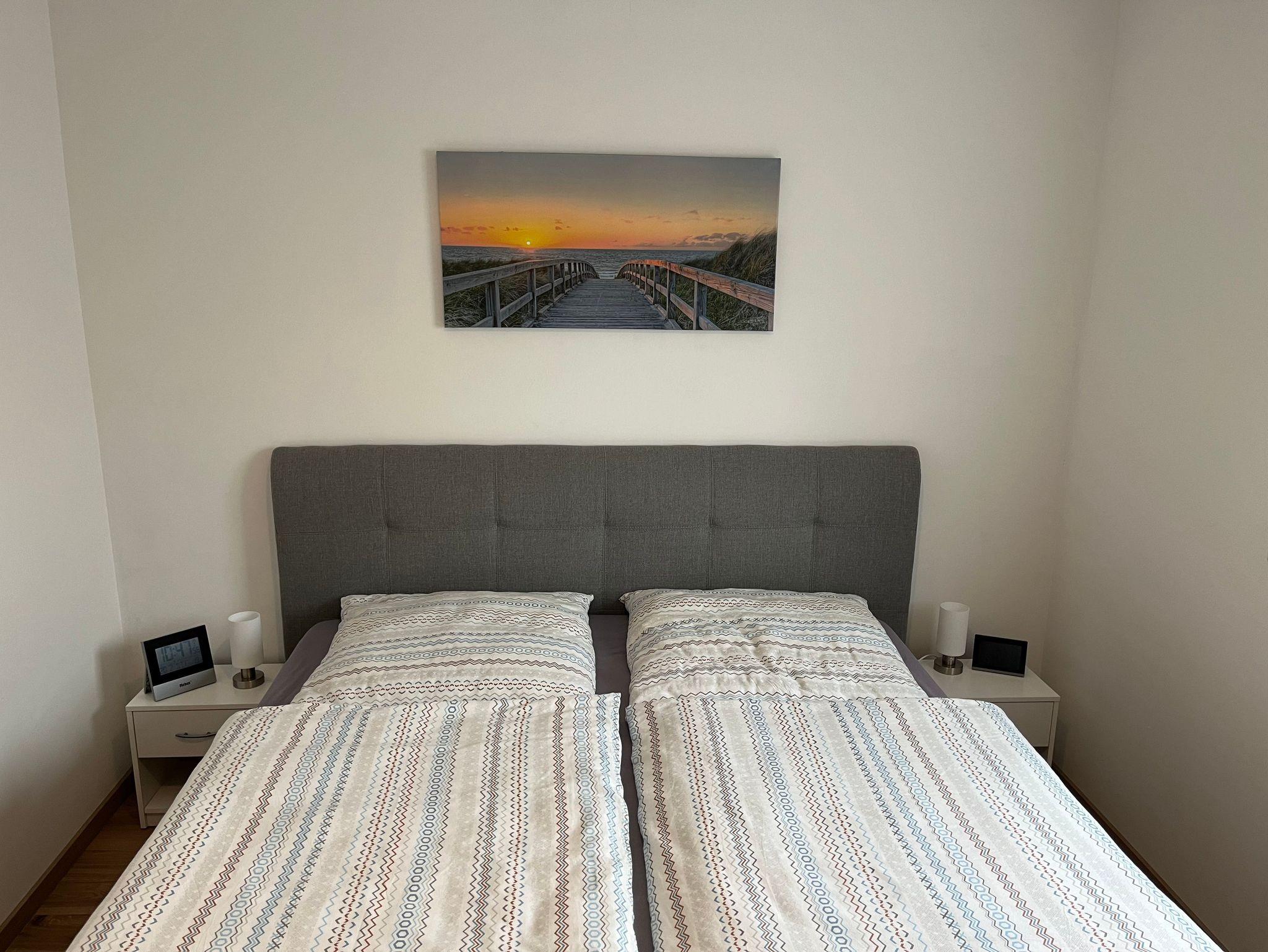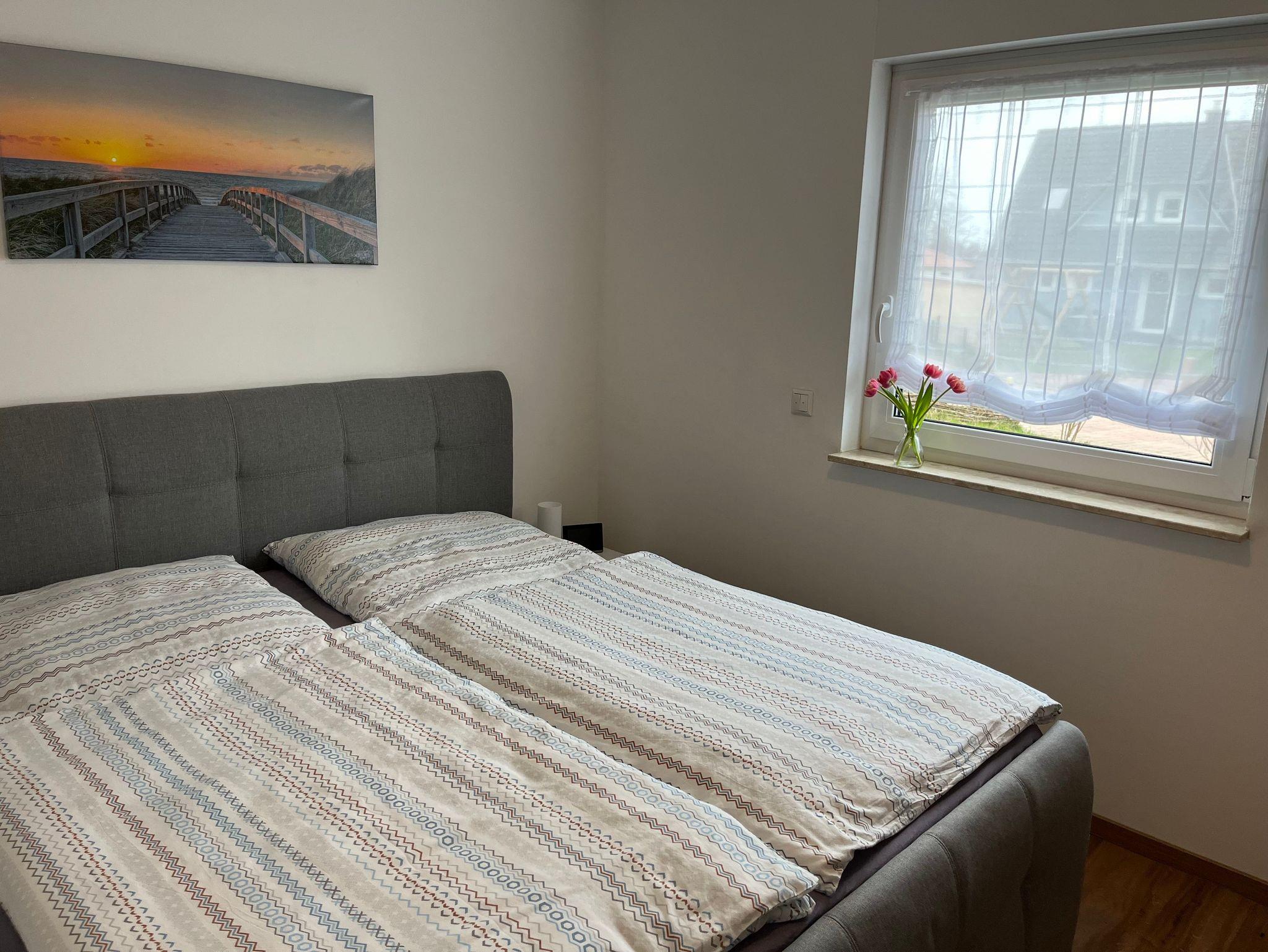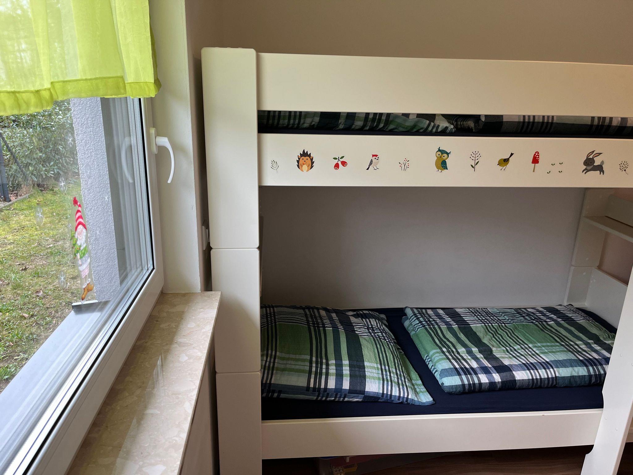 4-Raum-Ferienhaus mit 3 Schlafzimmer. Ferienhaus hat einen Wohnbereich mit gemütliche Sitzecke, Eßtisch und mit voll ausgestatteter Küche. 1 Schlafzimmer mit Doppelbett (Boxspring), 1 Schlafzimmer mit 2 Einzelbetten, 1 Schlafzimmer mit hochwertigem Doppelstockbett. Badezimmer mit Du / WC.