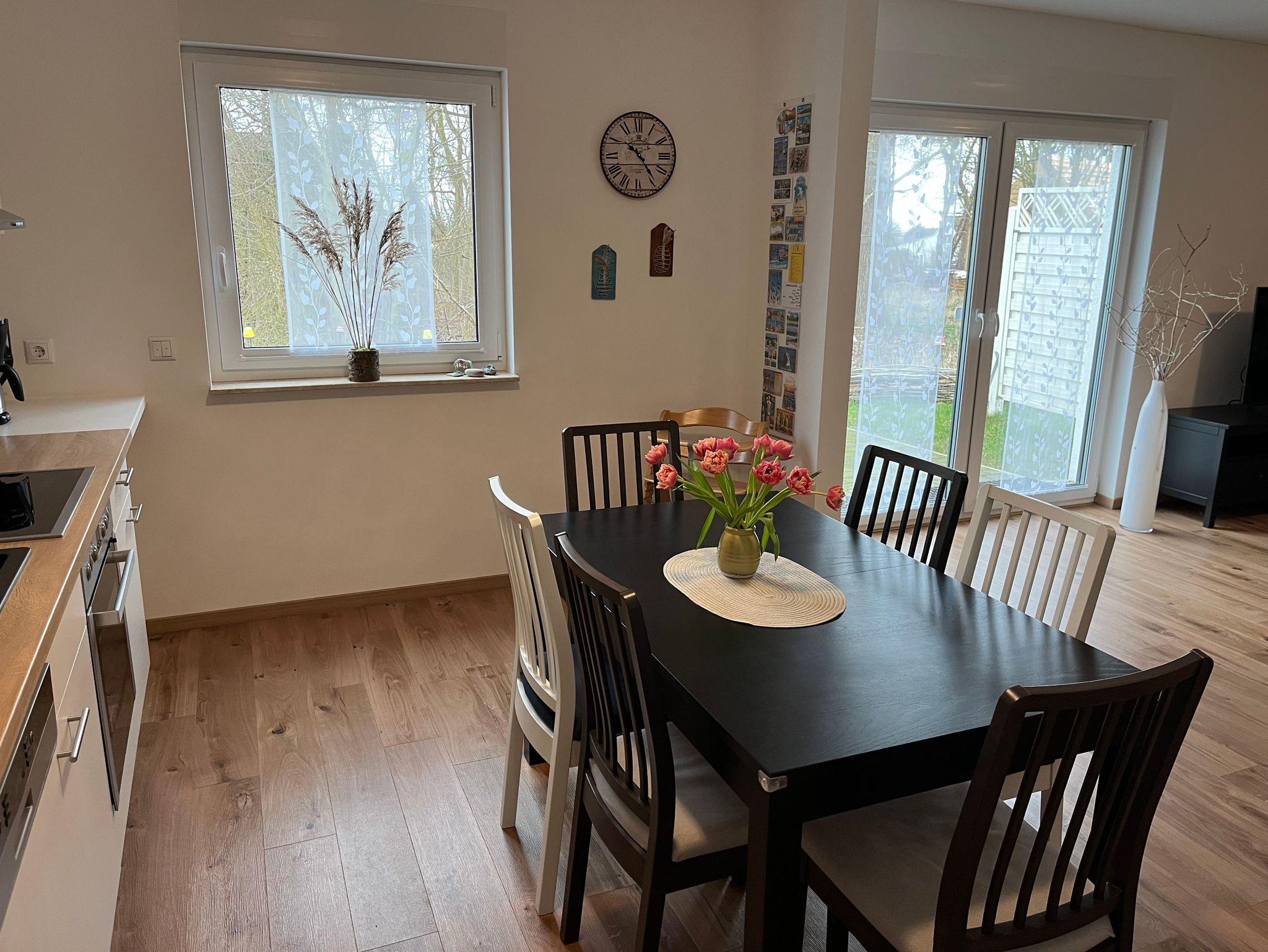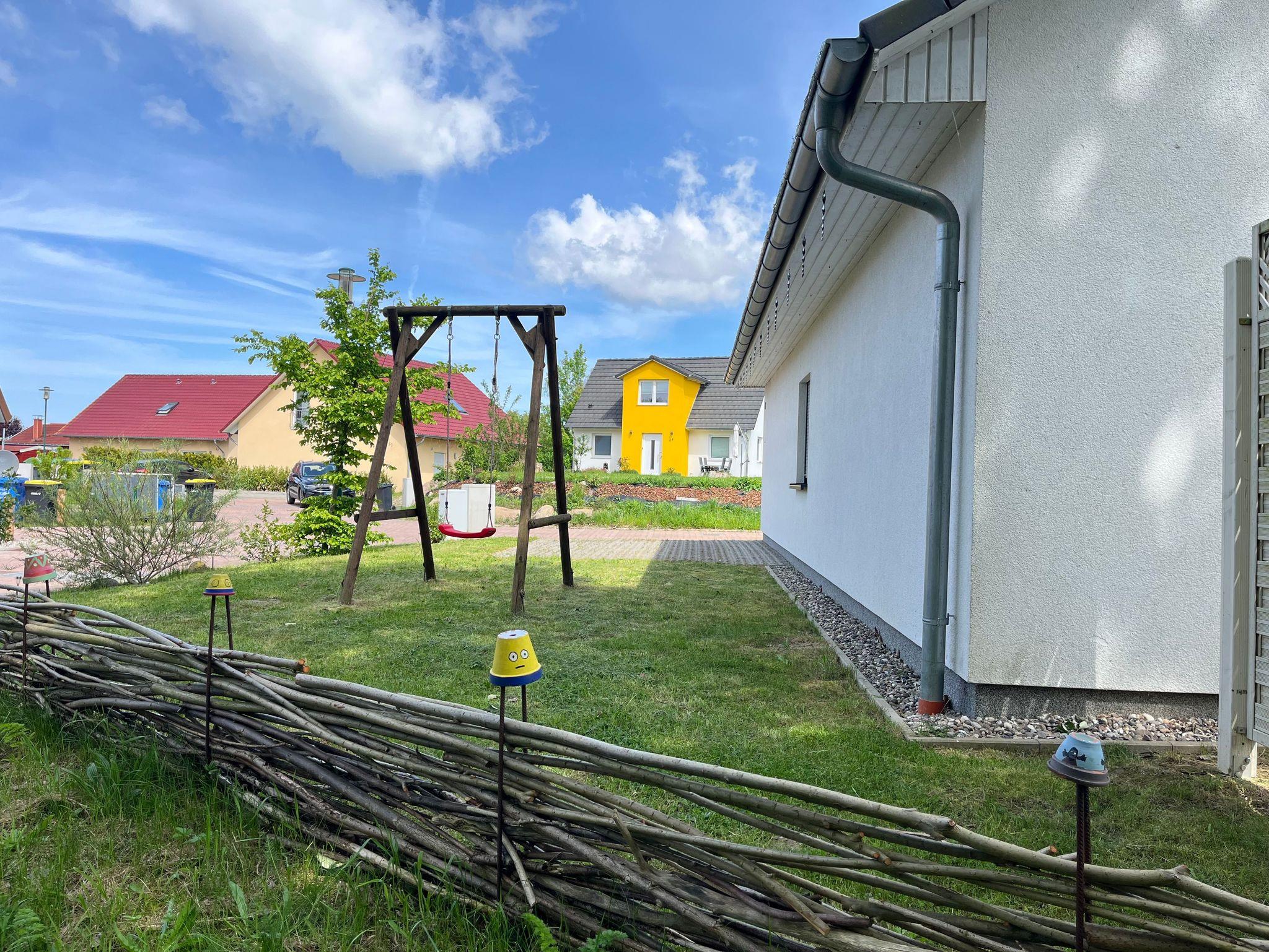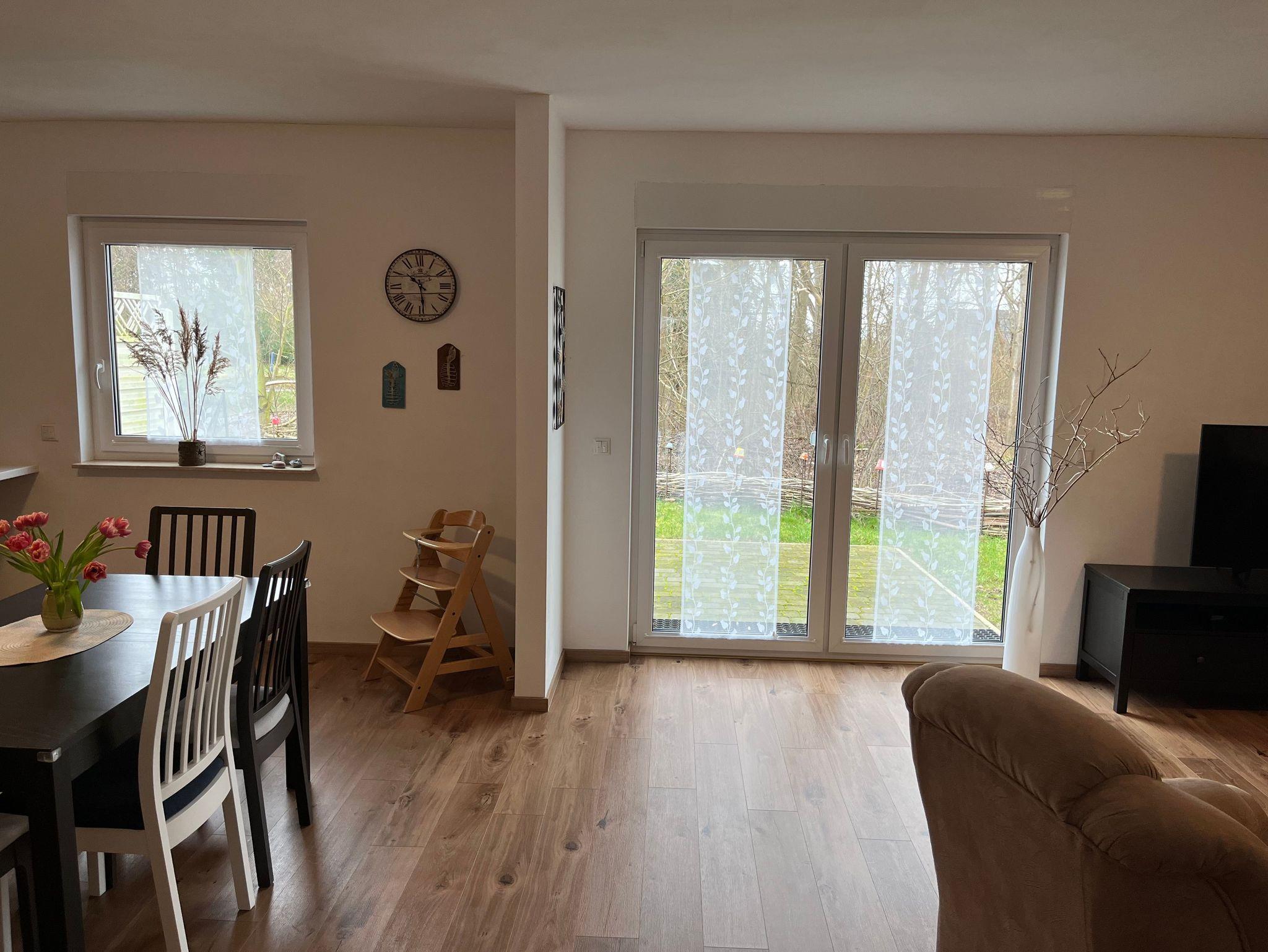 4-Raum-Ferienhaus in Ostseenähe. Wohnbereich mit gemütliche Sitzecke, Eßtisch mit 6 Stühlen und Zugang zur Terrasse. Küche mit Ceranfeld, Backofen, Geschirrspüler, Wasserkocher, Kaffeemaschine, Mikrowelle, Kühlschrank mit Gefrierfach. 1 Schlafzimmer mit Doppelbett (Boxspring), 1 Schlafzimmer mit 2 Einzelbetten und 1 Schlafzimmer mit Etagenbett. Badezimmer mit Dusche und WC. Vom Wohnbereich Zugang zur Terrasse mit Gartenmöbel, Schaukel und Sandmuschel. Kinderausstattung: Babyreisebett & Hochstuhl. Waschmaschine ist vorhanden.