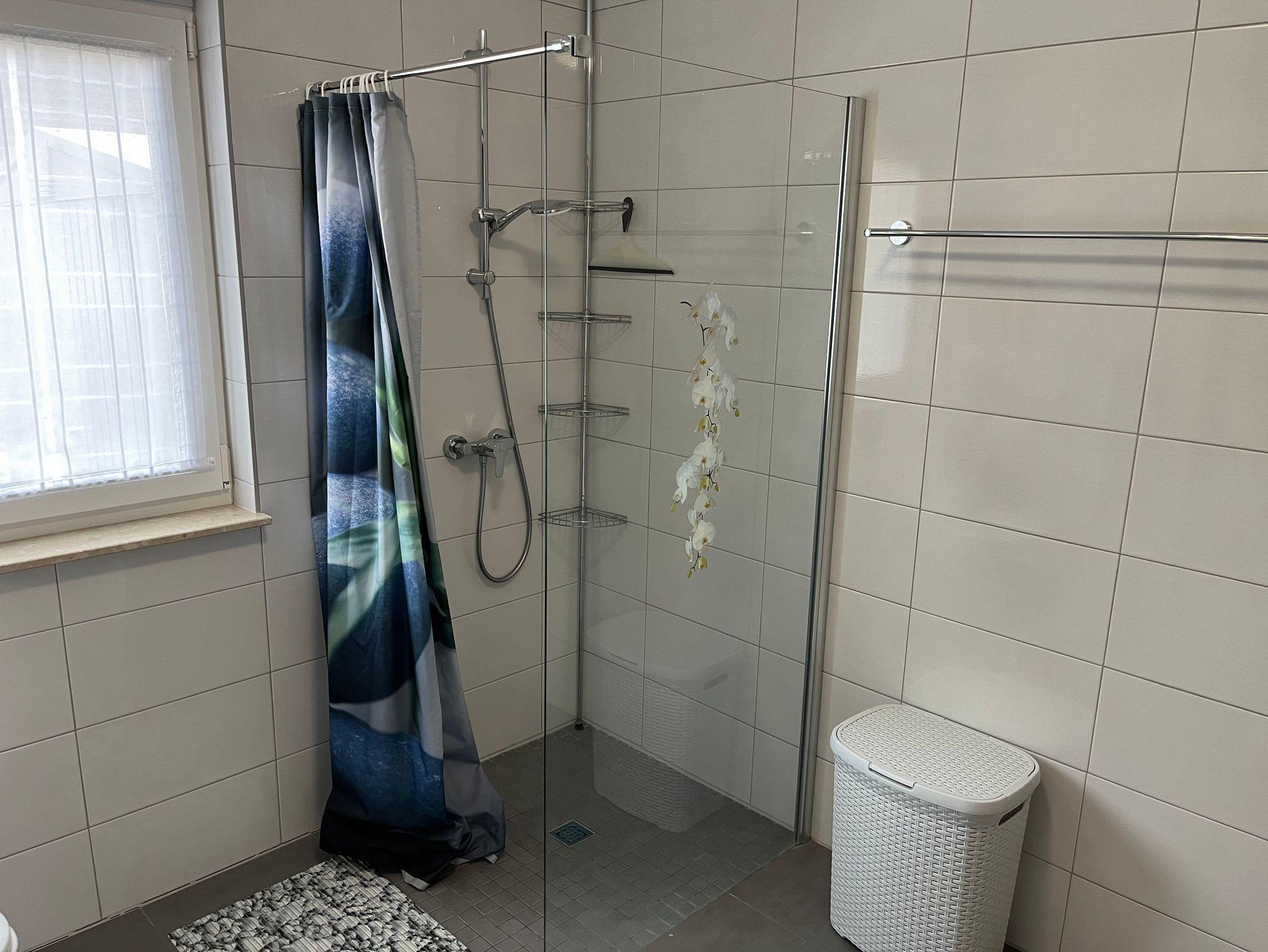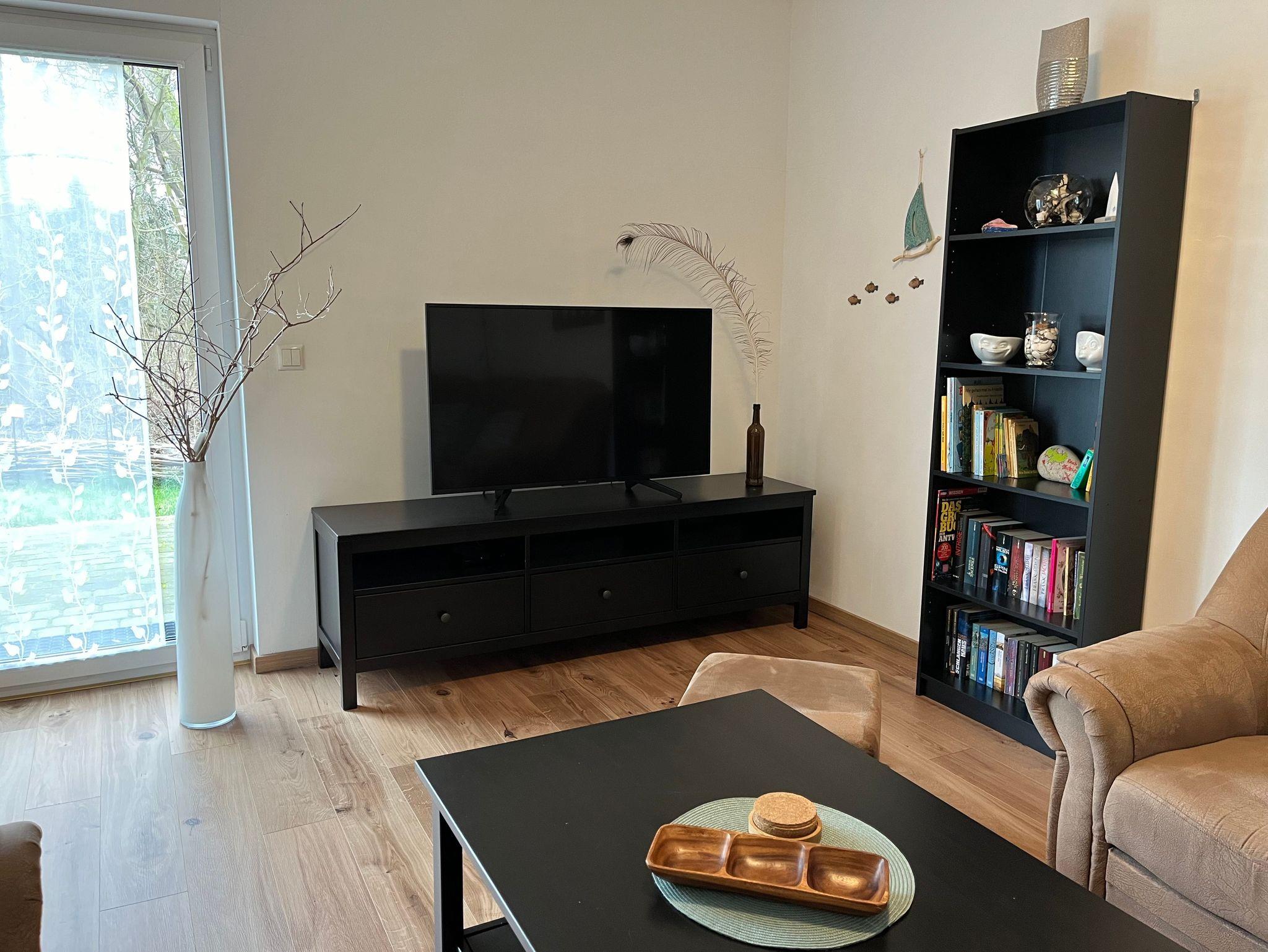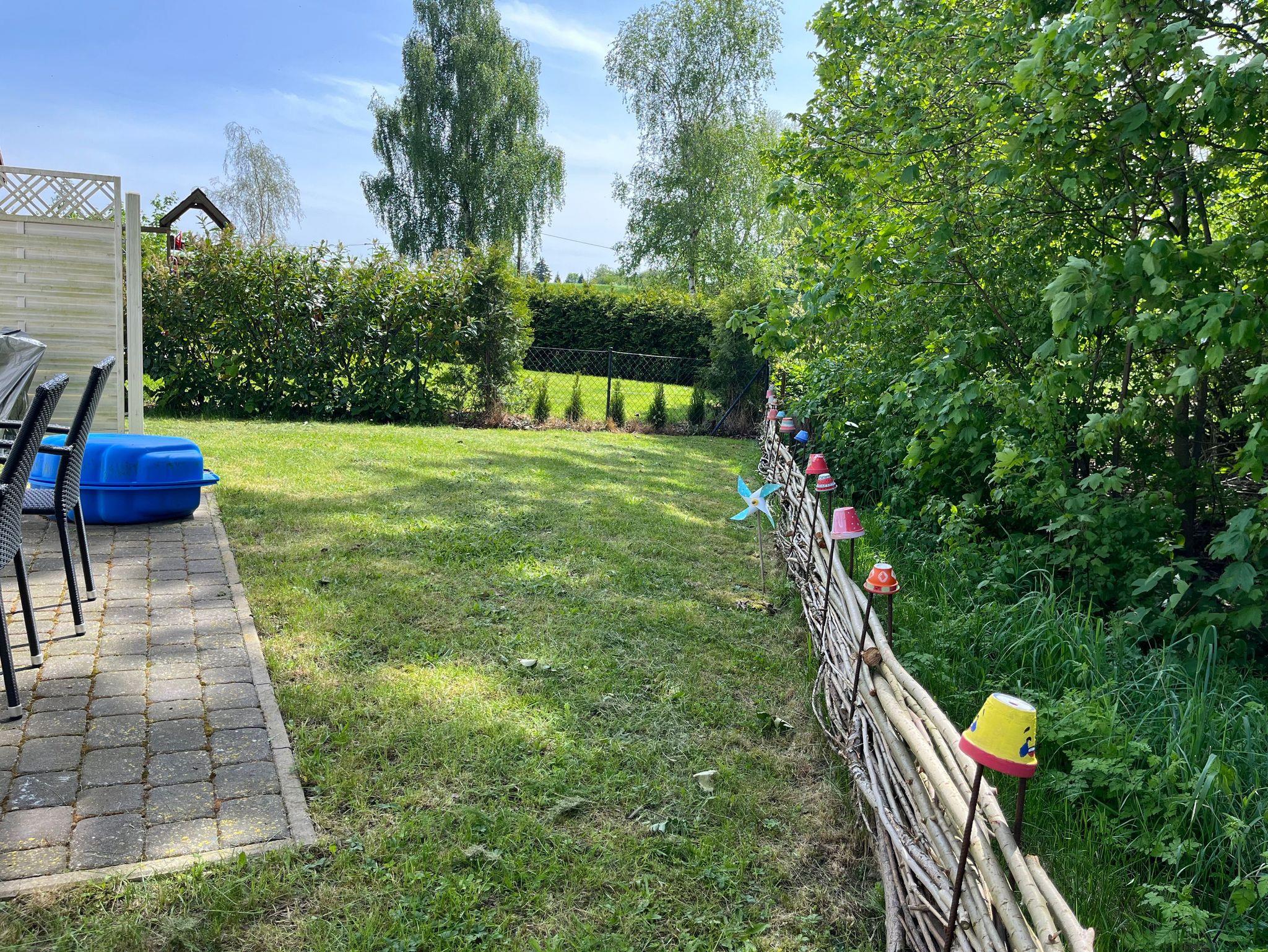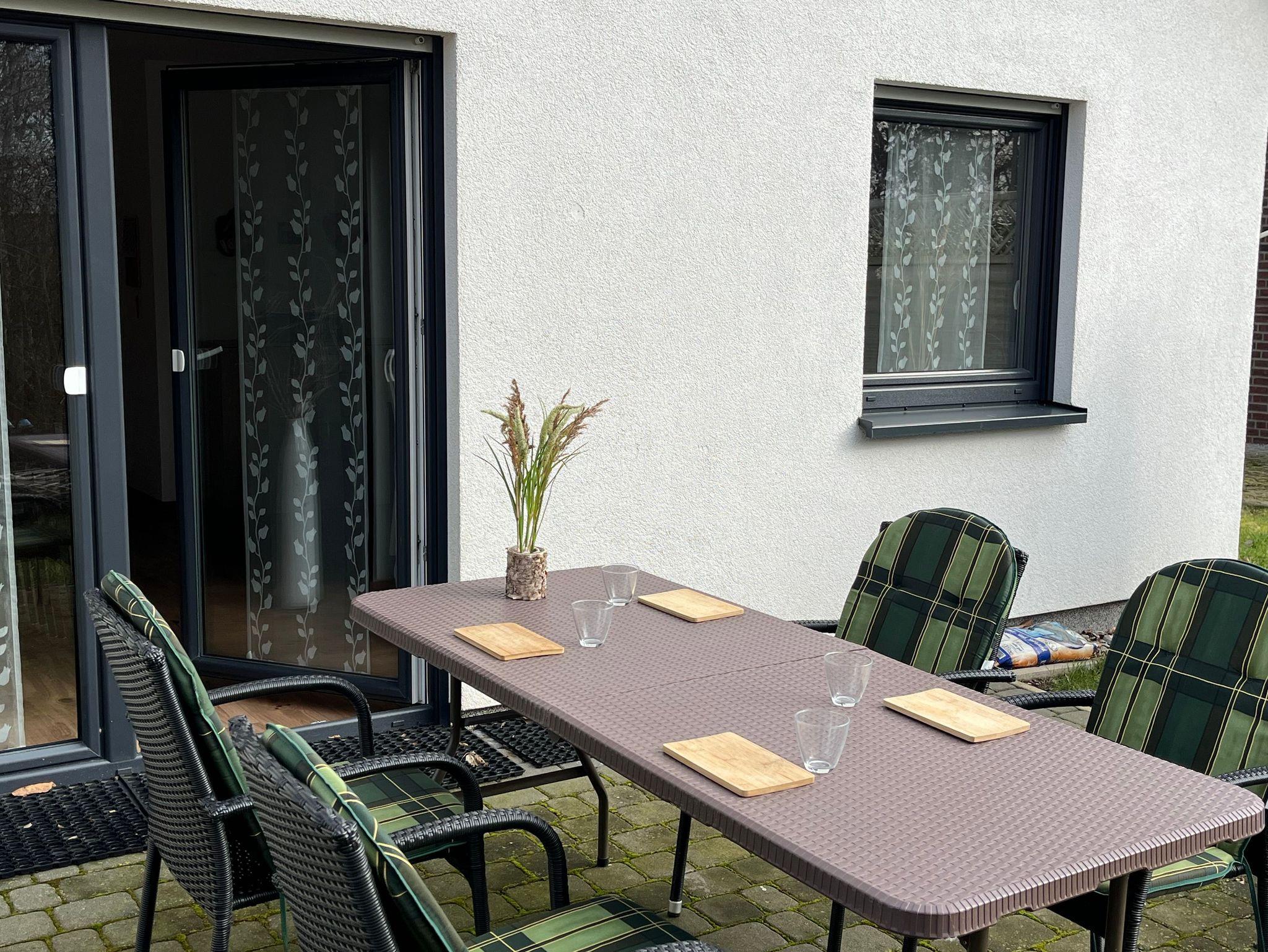 4-Raum-Ferienhaus in Ostseenähe. Wohnbereich mit gemütliche Sitzecke, Eßtisch mit 6 Stühlen und Zugang zur Terrasse. Küche mit Ceranfeld, Backofen, Geschirrspüler, Wasserkocher, Kaffeemaschine, Mikrowelle, Kühlschrank mit Gefrierfach. 1 Schlafzimmer mit Doppelbett (Boxspring), 1 Schlafzimmer mit 2 Einzelbetten und 1 Schlafzimmer mit Etagenbett. Badezimmer mit Dusche und WC. Vom Wohnbereich Zugang zur Terrasse mit Gartenmöbel, Schaukel und Sandmuschel. Kinderausstattung: Babyreisebett & Hochstuhl. Waschmaschine ist vorhanden.