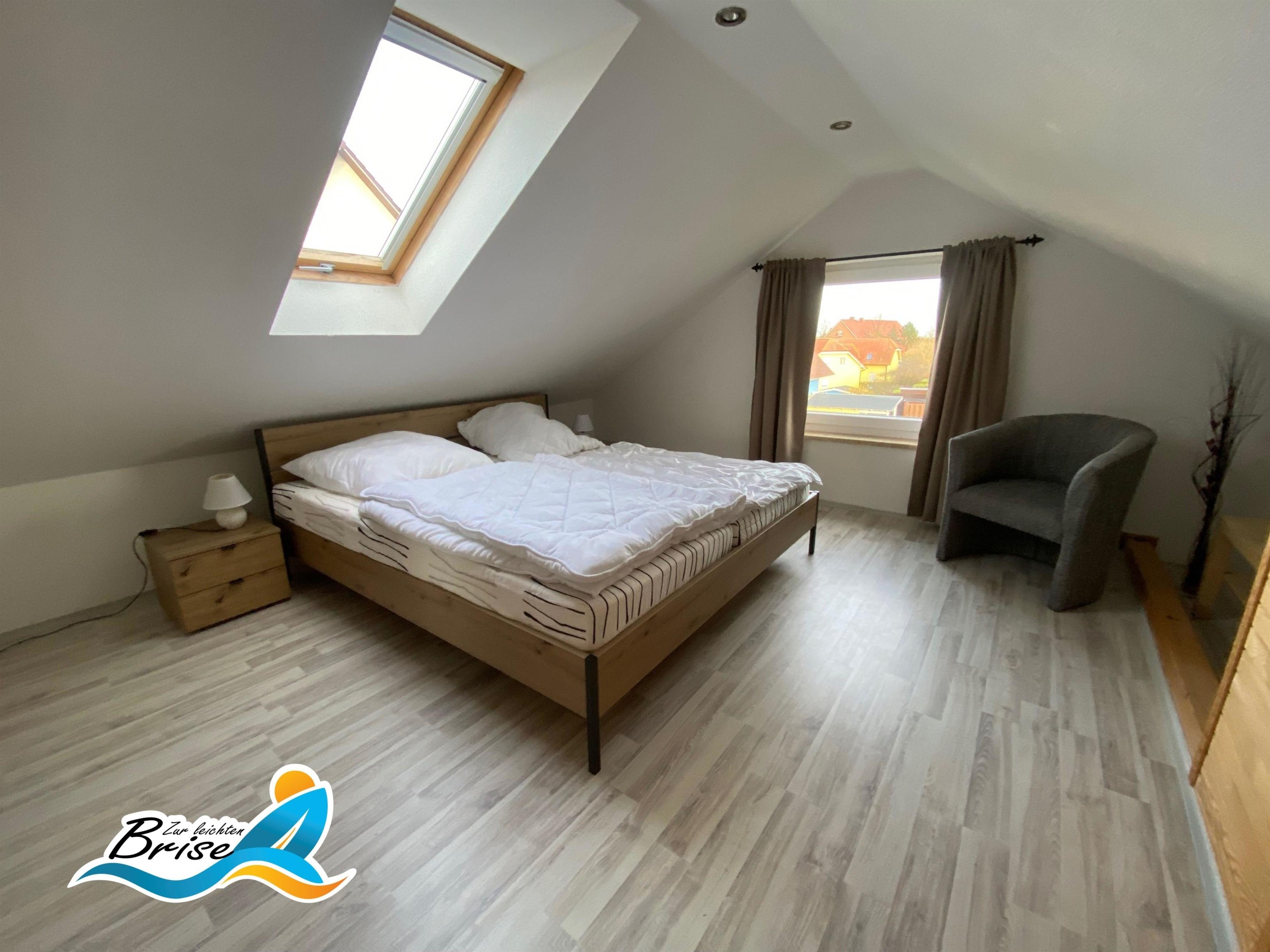 Im Obergeschoss stehen Ihnen 2 Schlafzimmer zur Verfügung. In einem Schlafzimmer steht für Sie ein Doppelbett 1,80x2,00m bereit. Hier bietet Ihnen ein großes Fenster den Blick auf das Salzhaff und die Ostsee mit Ihren Kite Surfern und dem abendlichen Sonnenuntergang am Horizont. Im zweiten Schlafzimmer haben Sie ebenfalls ein Doppelbett 1,80x2,00m. Hier können Sie sich vom Sonnenaufgang wecken lassen. Zur Sicherung des Obergeschosses ist die Treppe mit einem Kindergitter versehen, welches Sie bei Bedarf nutzen können. Außerdem steht ein Kinderbett zur Verfügung.