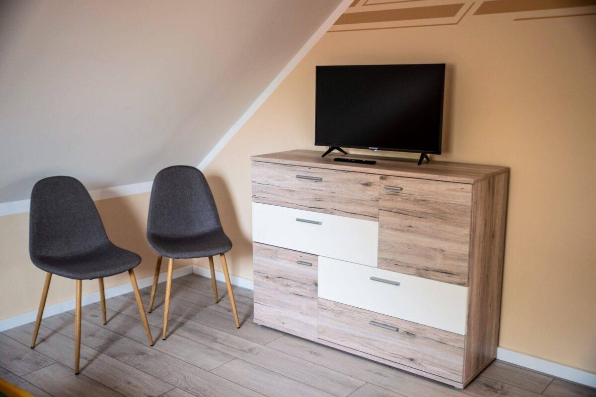 Im Erdgeschoss bildet die große Wohnküche, mit Zugang zur Terrasse, den zentralen Ort des Beisammenseins. Gemeinsam Kochen, vor dem Kamin sitzen und plaudern oder am großen Tisch gemeinsam spielen, alles ist möglich. Des weiteren befinden sich im Erdgeschoss ein Badezimmer sowie ein Schlafzimmer. Im Obergeschoss finden Sie drei weitere Schlafzimmer sowie ein zweites Badezimmer. Für digitale Unterhaltung sorgen WLAN und 2x SAT-TV. Die hauseigene Sauna und der Kamin sorgen für gemütliche Wellness-Abende.