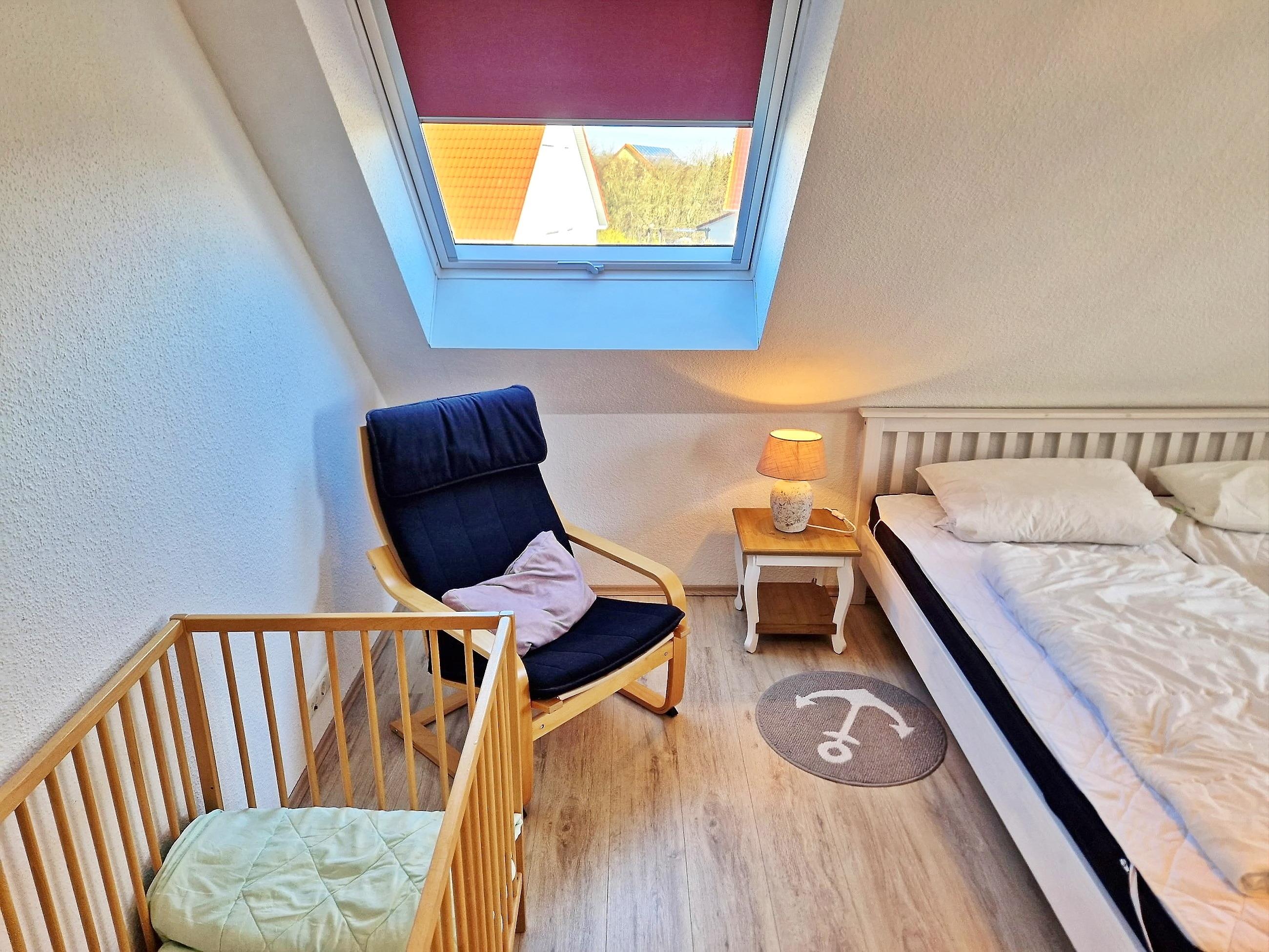 Über die Treppe erreichen Sie das Dachgeschoss mit drei Schlafzimmern. Schlafzimmer 1: ein Doppelbett (1,80 x 2,00 m) Schlafzimmer 2: drei Einzelbetten (0,90 x 2,00 m) Schlafzimmer 3: zwei Einzelbetten (0,80 x 2,00 m) mit Balkon und Seeblick auf die Ostsee. Alle Zimmer sind mit Mücken-Gase und verdunklungsfähigen Vorhängen ausgestattet. Kinderbett und Hochstuhl sind vorhanden.