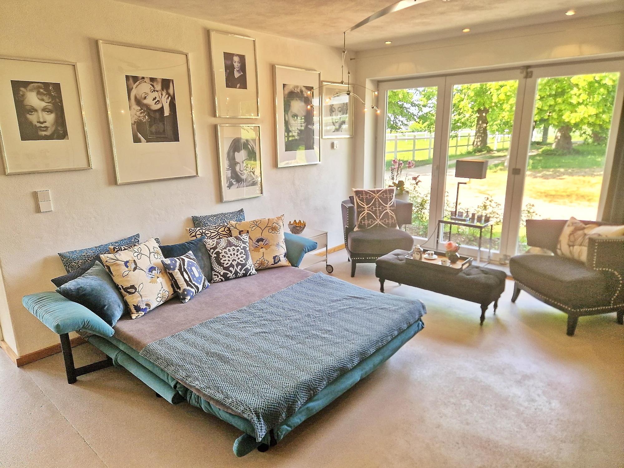 Sofa (umfunktionierbar zur Schlafcouch), Fernsehsessel mit Hocker, 2 Stühle, TV, Hifi-Anlage, Essbereich für 4 Personen