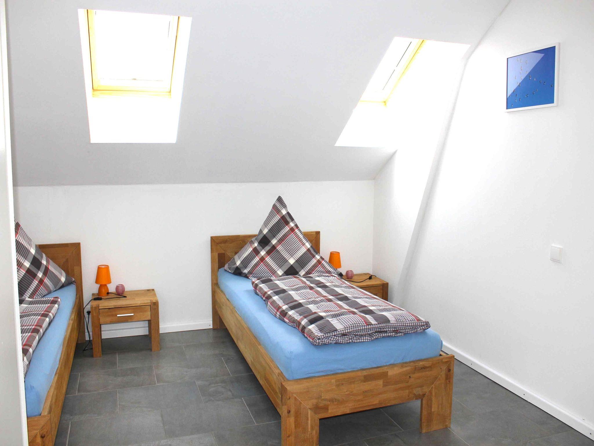 Im Obergeschoss ein Zimmer mit zwei Einzelbetten und Bad