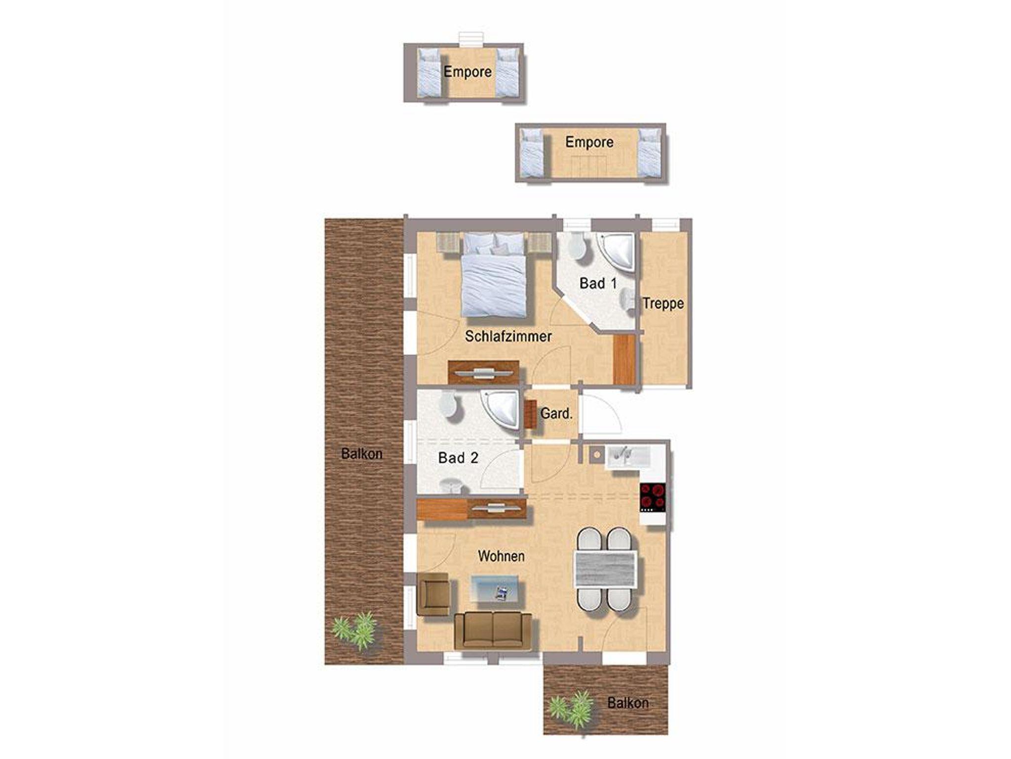 Große Ferienwohnung (ca. 70 qm) mit einem Schlafzimmer mit Doppelbett, Wohnraum und zwei Bädern. Zusätzlich hat die Ferienwohnung zwei Schlafgalerien mit jeweils zwei einzelnen Betten. Die Schlafgalerien sind einmal vom Schlafzimmer und einmal vom Wohnraum aus zu erreichen.