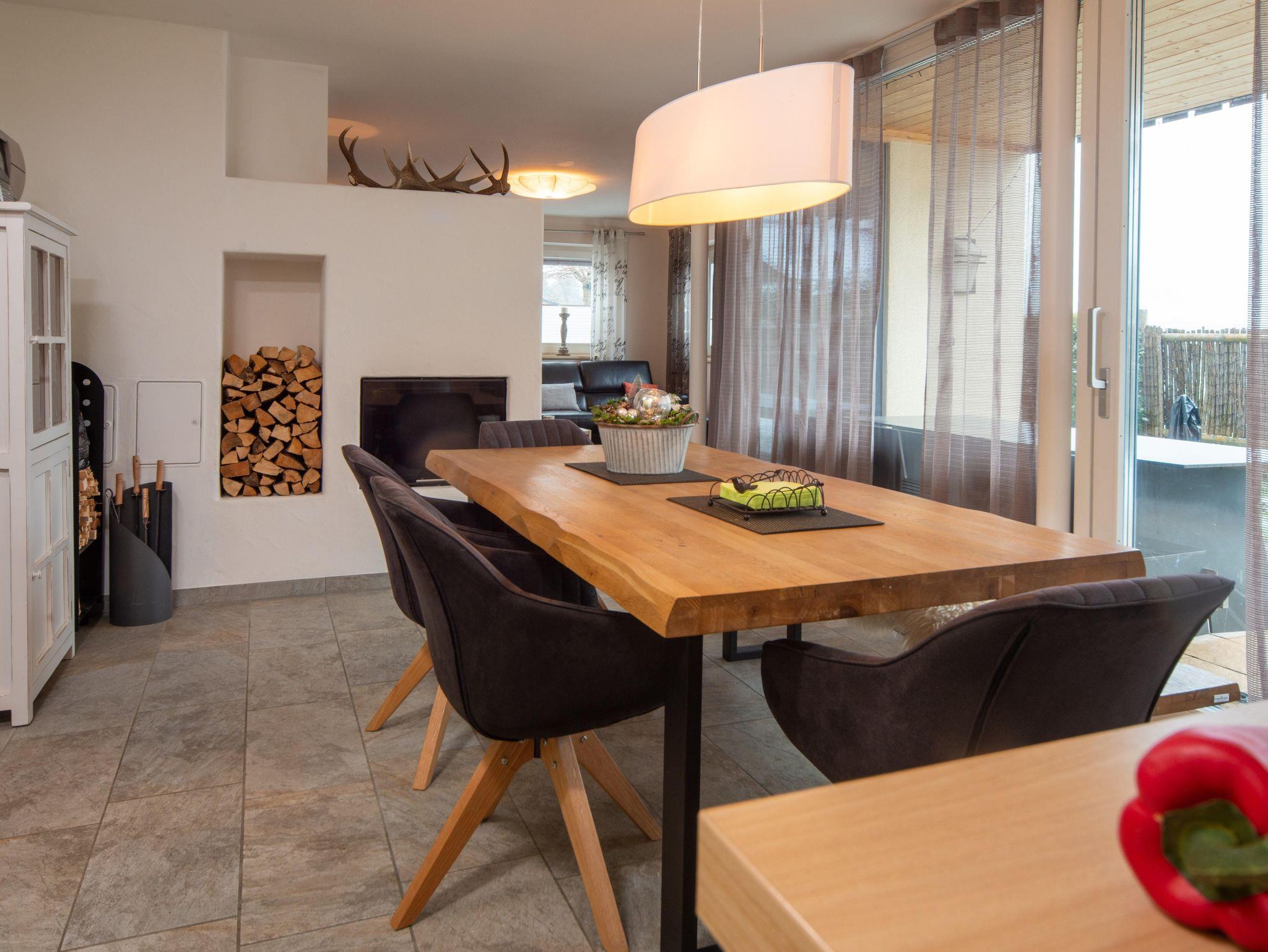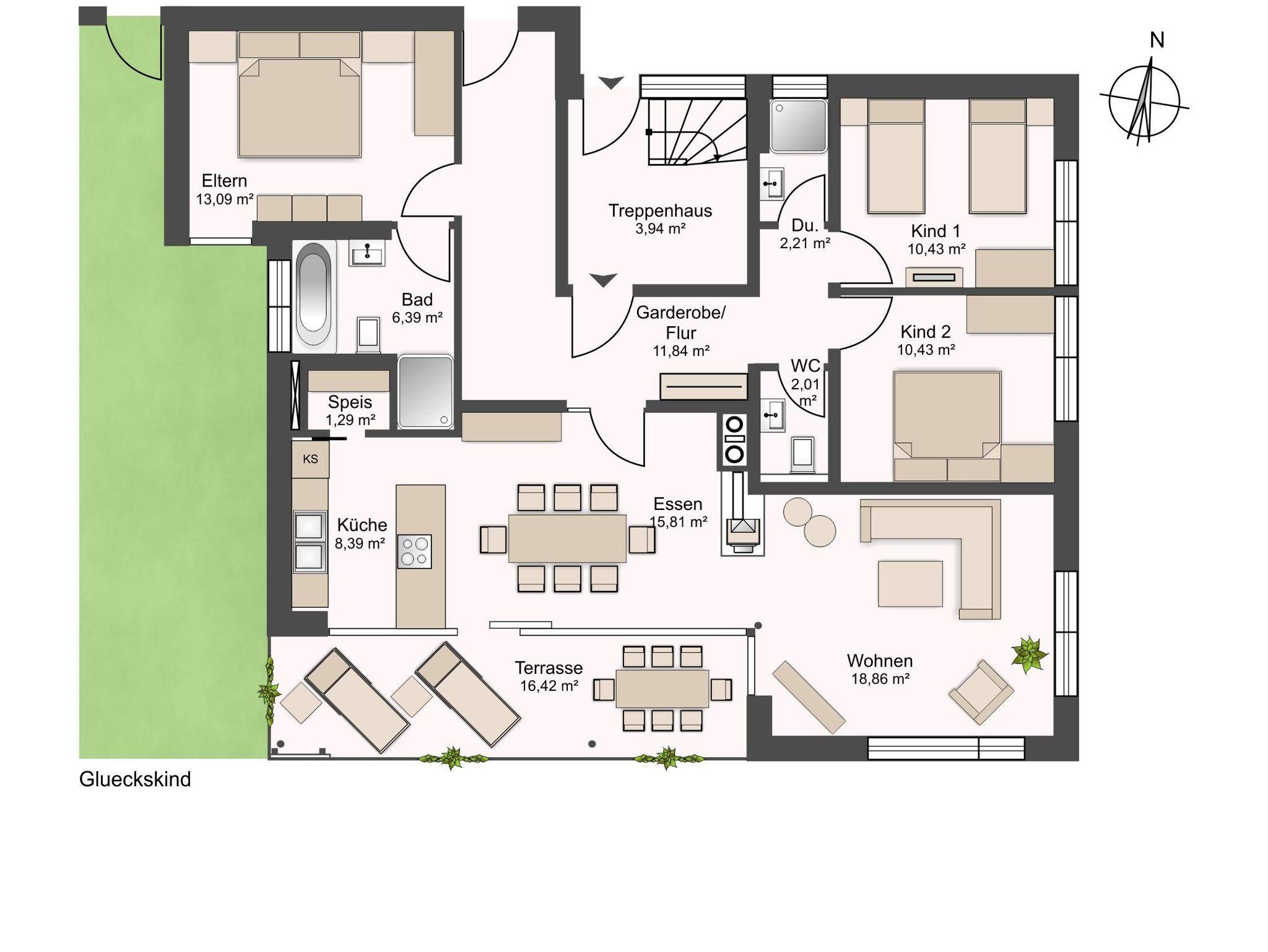Unsere 4-Raum-Suite Glückskind im EG bietet auf 120 qm eine exklusive Ausstattung im modernen Alpin-Look. Der lichtdurchflutete Wohnraum ist modern und gemütlich eingerichtet und verfügt über einen Kamin mit sichtbarer Feuerstelle. Am großen Essplatz vor der offenen vollausgestatteten Traumküche genießen Sie Ihr Frühstück. 3 Schlafzimmer mit Boxspringbetten (Babybett zustellbar) und 2 Bäder mit ebener Dusche/2 WCs (für Rollstuhlfahrer geeignet) bieten viel Komfort. Eine eigene überdachte Terrasse mit Garten und Aussicht auf den Alpenhauptkamm lädt zum Relaxen ein.