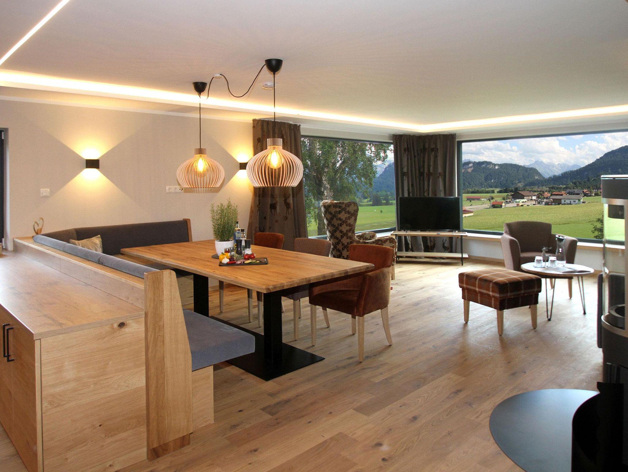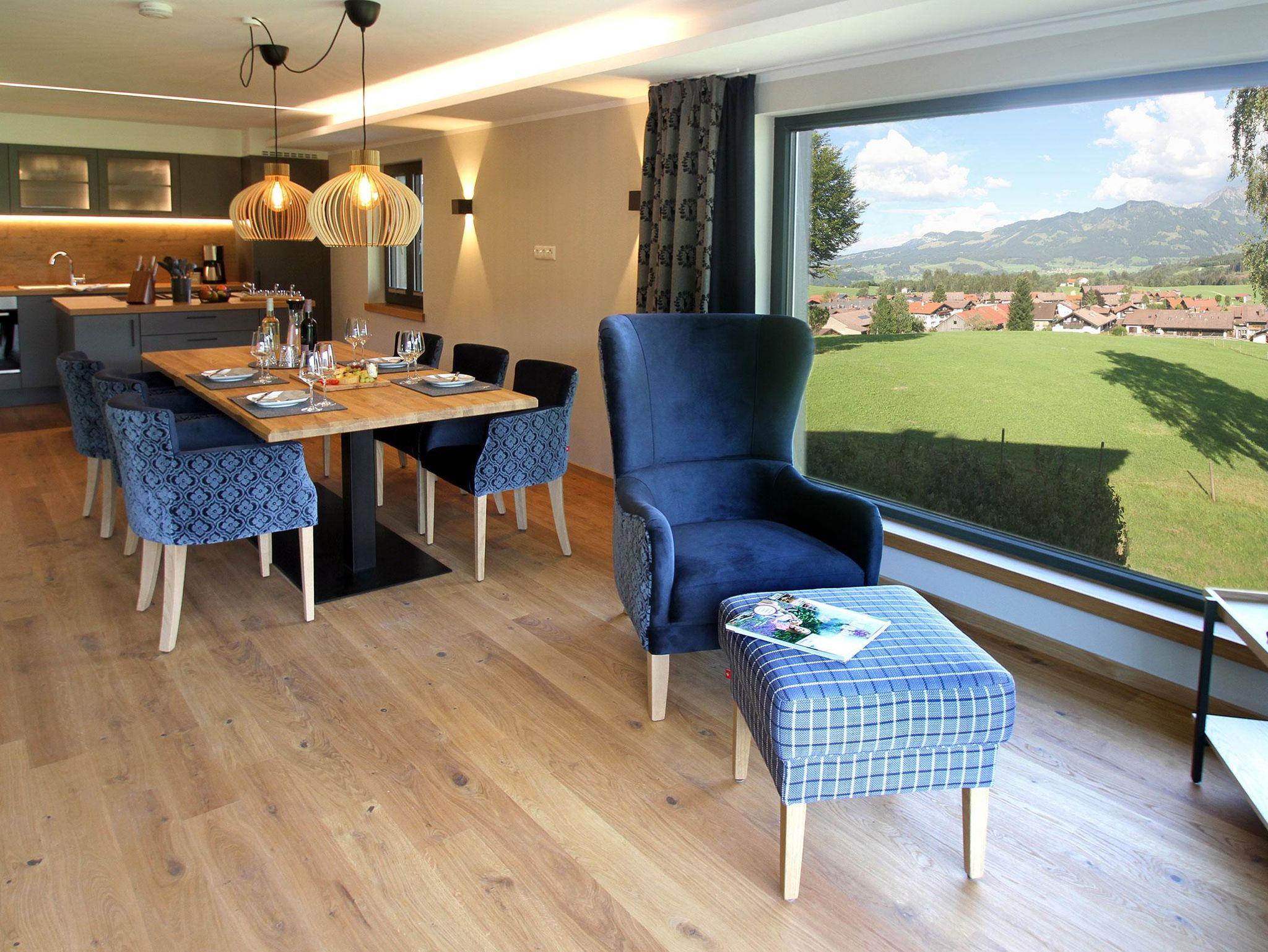 Das 94 qm große 3-Raum-Chalet Alpencharme befindet sich im Obergeschoss. Bei der Ausstattung wurden modern-alpine Stilelemente mit wertigen Materialien wie Echtholzböden, Altholzwänden und Holzunikaten harmonisch verbunden. Die voll ausgestattete Küche mit Kochinsel und gemütlichem Essbereich ist ein Wohlfühlort mit räumlicher Großzügigkeit. Das Highlight ist der großzügige lichtdurchflutete Wohn-Essbereich. Er lädt dazu ein neben dem knisternden Kaminofen zu verweilen und den Blick durch die 30qm großen Panoramafenster schweifen zu lassen. Flat-TV, WLAN und persönliche Musikwahl über Bluetooth runden das Angebot ab. Zwei Schlafräume mit jeweils eigenem Bad incl. Regendusche/WC sowie einer privaten Infrarotsauna für 2 Personen runden einen aktiven Bergtag mit Wärme, Ruhe und Wohlgefühl ab. Alle Wohn- und Schlafräume haben einen Zugang zum 11 qm großen Südbalkon und bergzauberhaften Blick in die Allgäuer Bergwelt. Geeignet für Paare, Freunde, Familie sowie 3-Generationen-Urlauber.
