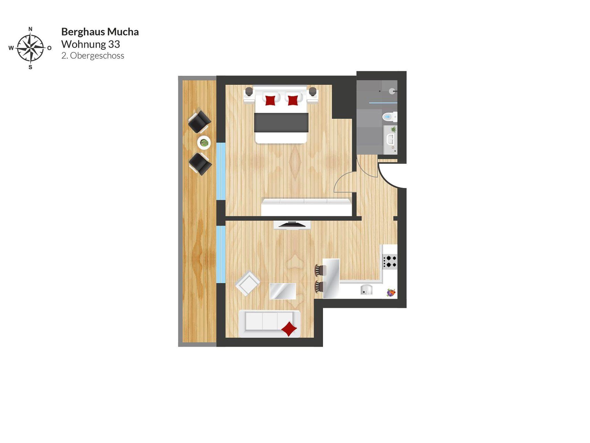 Die Wohnung im 2. Obergeschoss mit 40 m² verfügt über einen Wohnraum mit einer komplett ausgestatteten Küche, einem Esstisch, einer Sitzecke, Sat-TV, ein Schlafzimmer, Westbalkon und ein Bad mit Dusche und Toilette.
