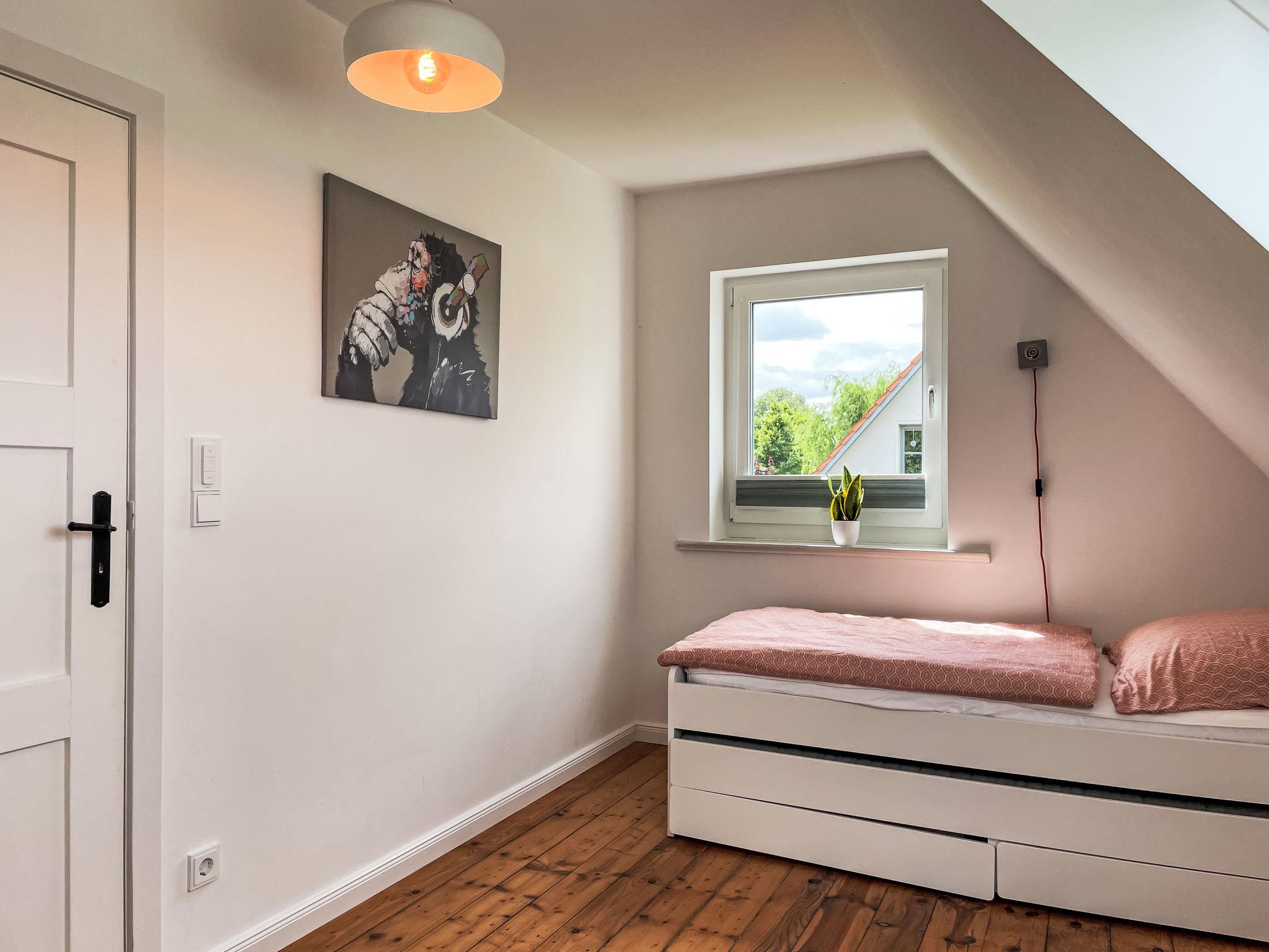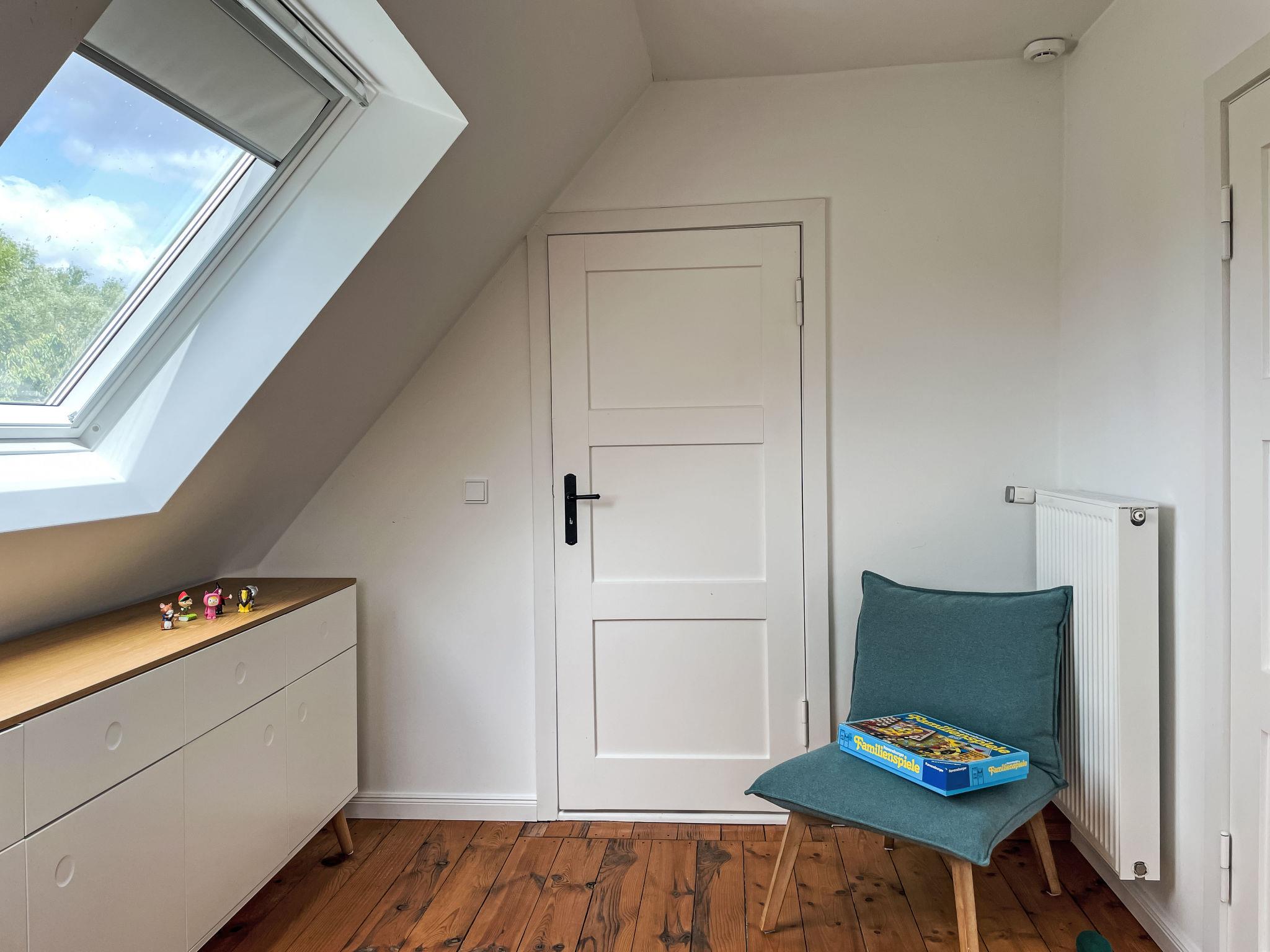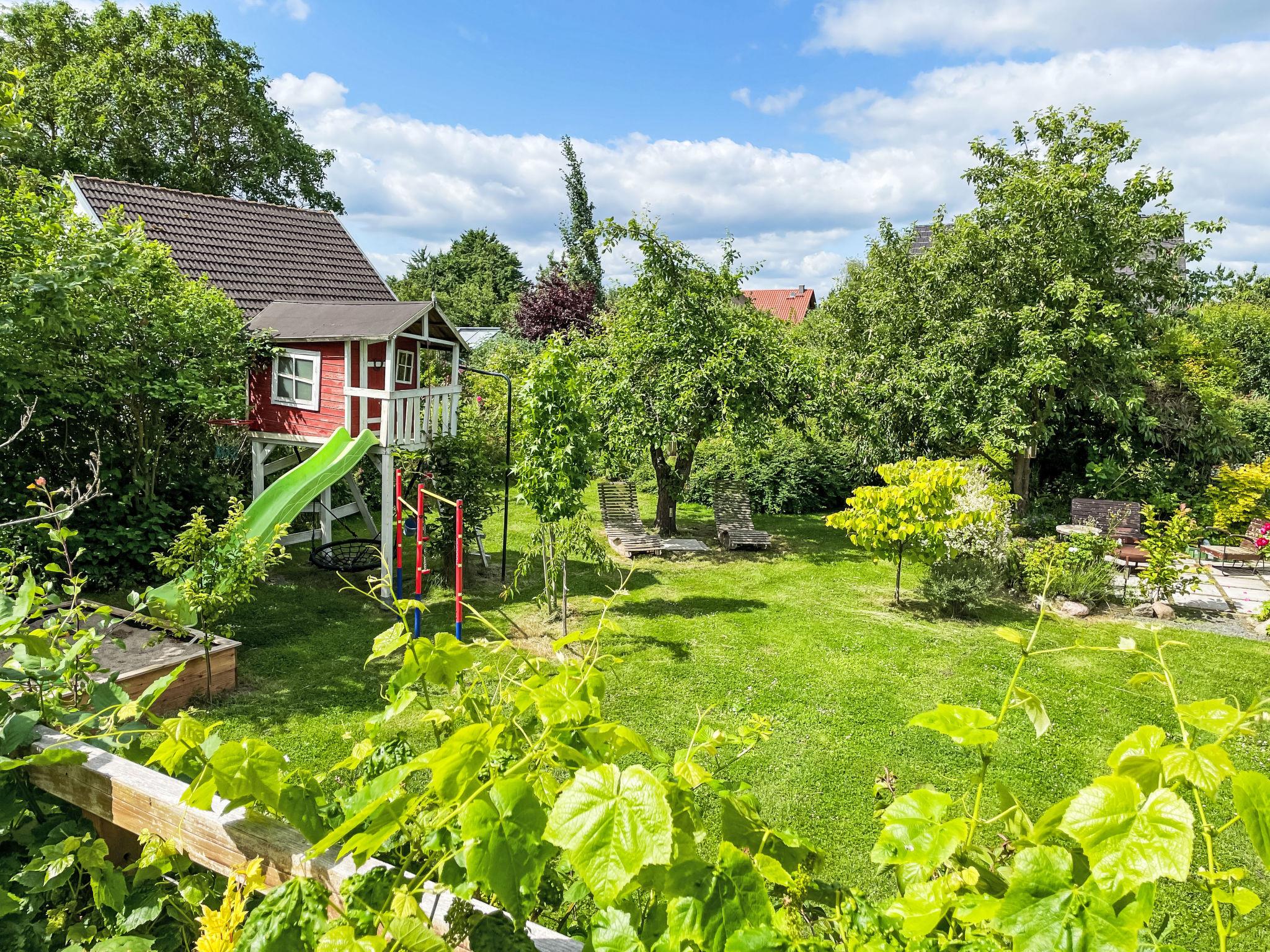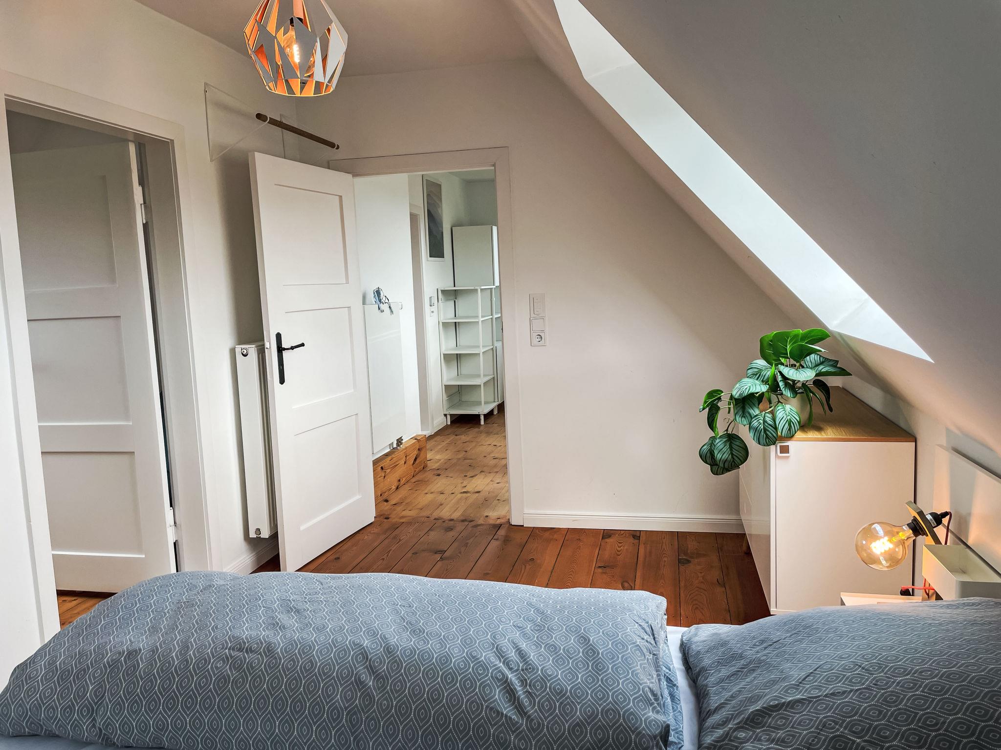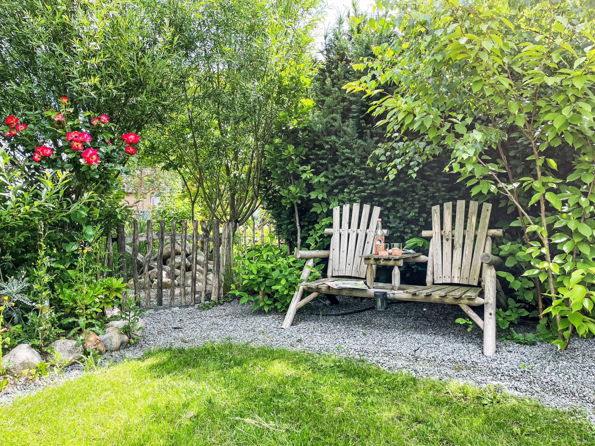 4-room house 114 m2 on 2 levels. Spacious and bright, modern and cosy furnishings: living room with digital TV and radio. Open kitchen (oven, dishwasher, 4 induction hot plates, toaster, kettle, electric coffee machine) with dining table. Exit to the garden, to the terrace. Shower/WC. Heating. Upper floor: 1 room with sloping ceilings with 1 double bed (180 cm, length 200 cm). 2 rooms with sloping ceilings, each room with 1 pull-out bed (2 pers. 2 x 80 cm, length 200 cm). Wooden floors. Large terrace. Terrace furniture. Beautiful view of the garden. Facilities: washing machine, dryer, iron. Internet (WiFi, free). Parking (1 car) at the house. Please note: suitable for families. Non-smoking house. Maximum 2 pets/ dogs allowed. Smoke alarm. The living room features a bright bay window that serves as a reading corner. The kitchen features a BORA cooktop and a Quooker faucet.