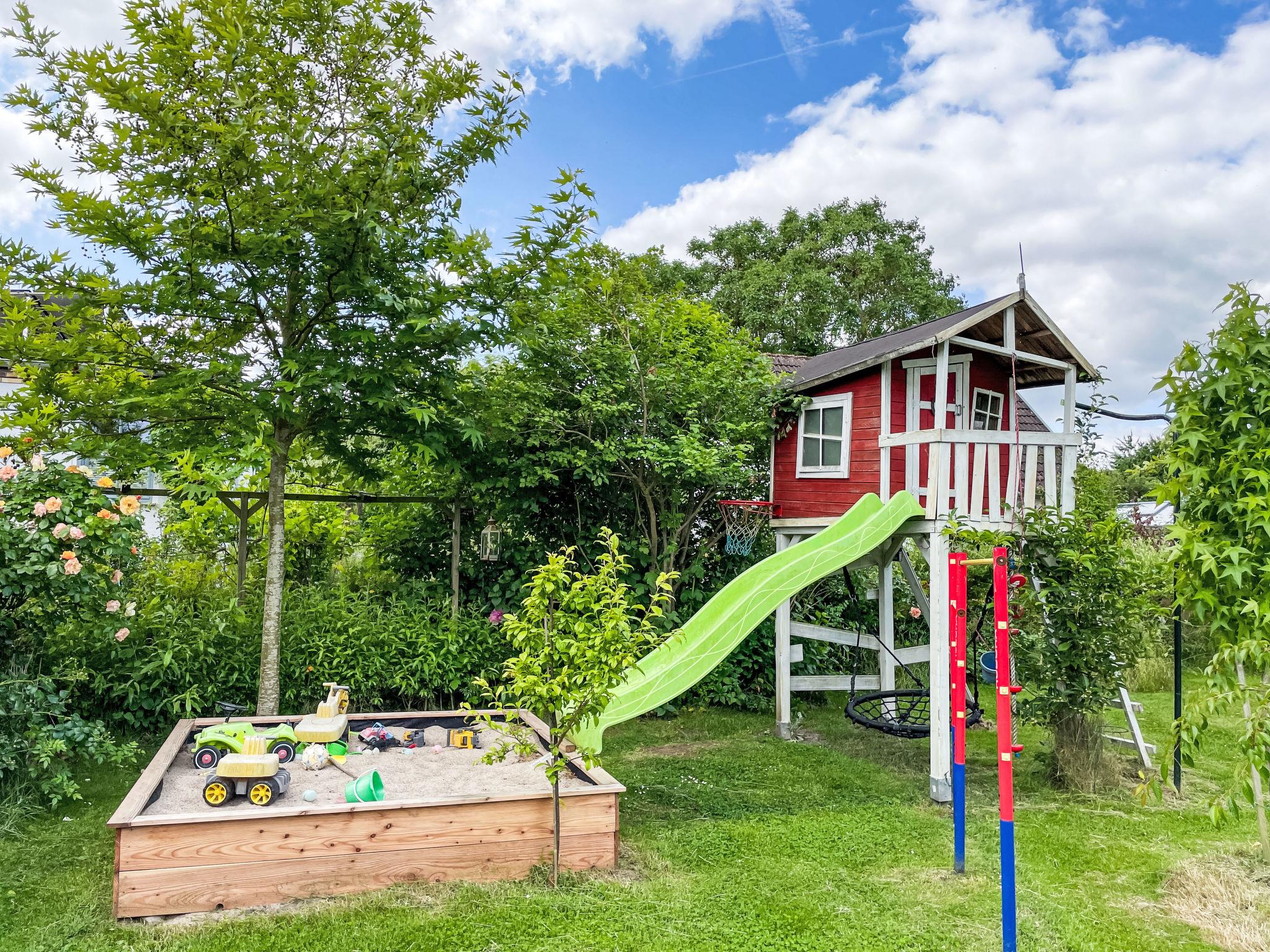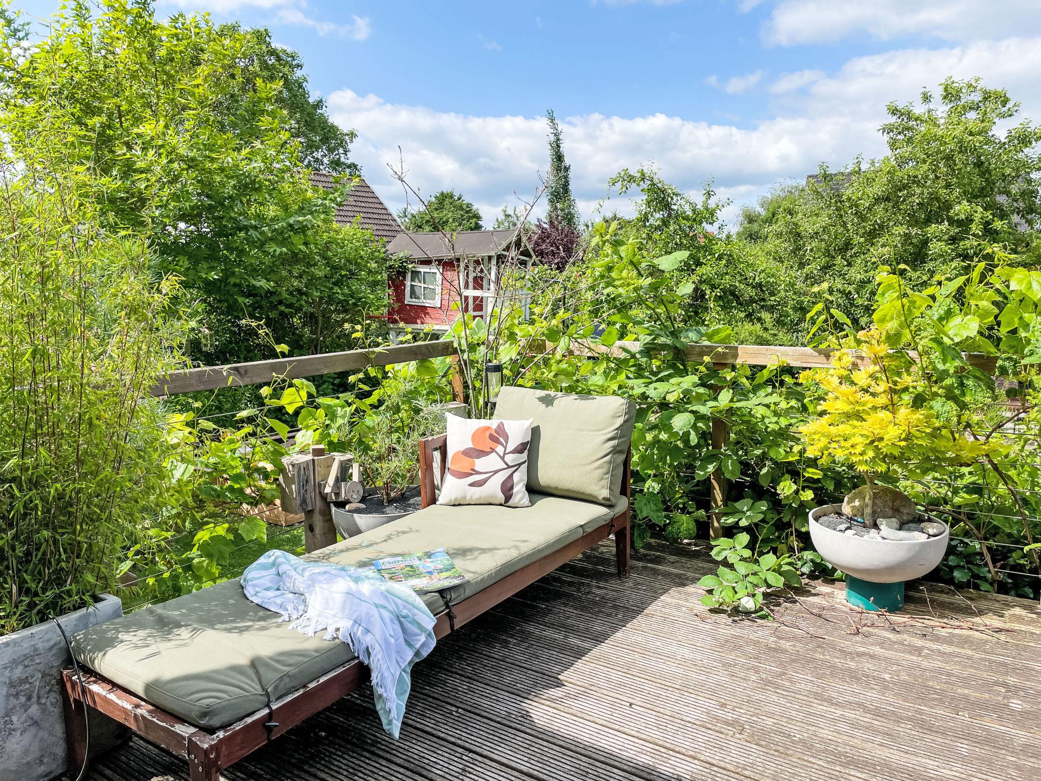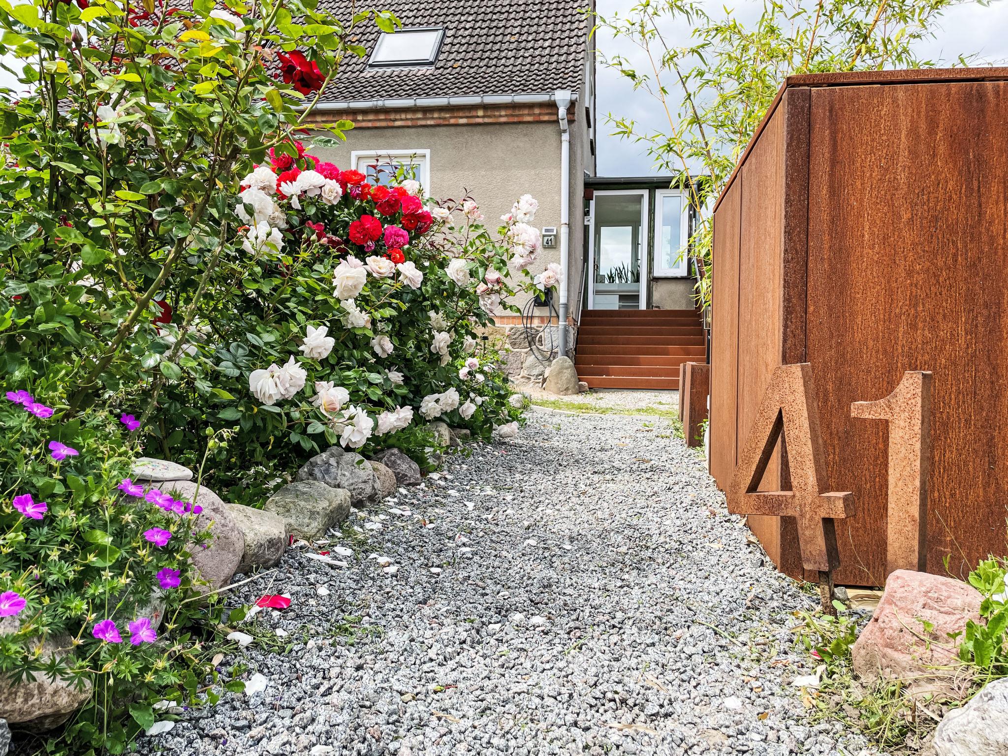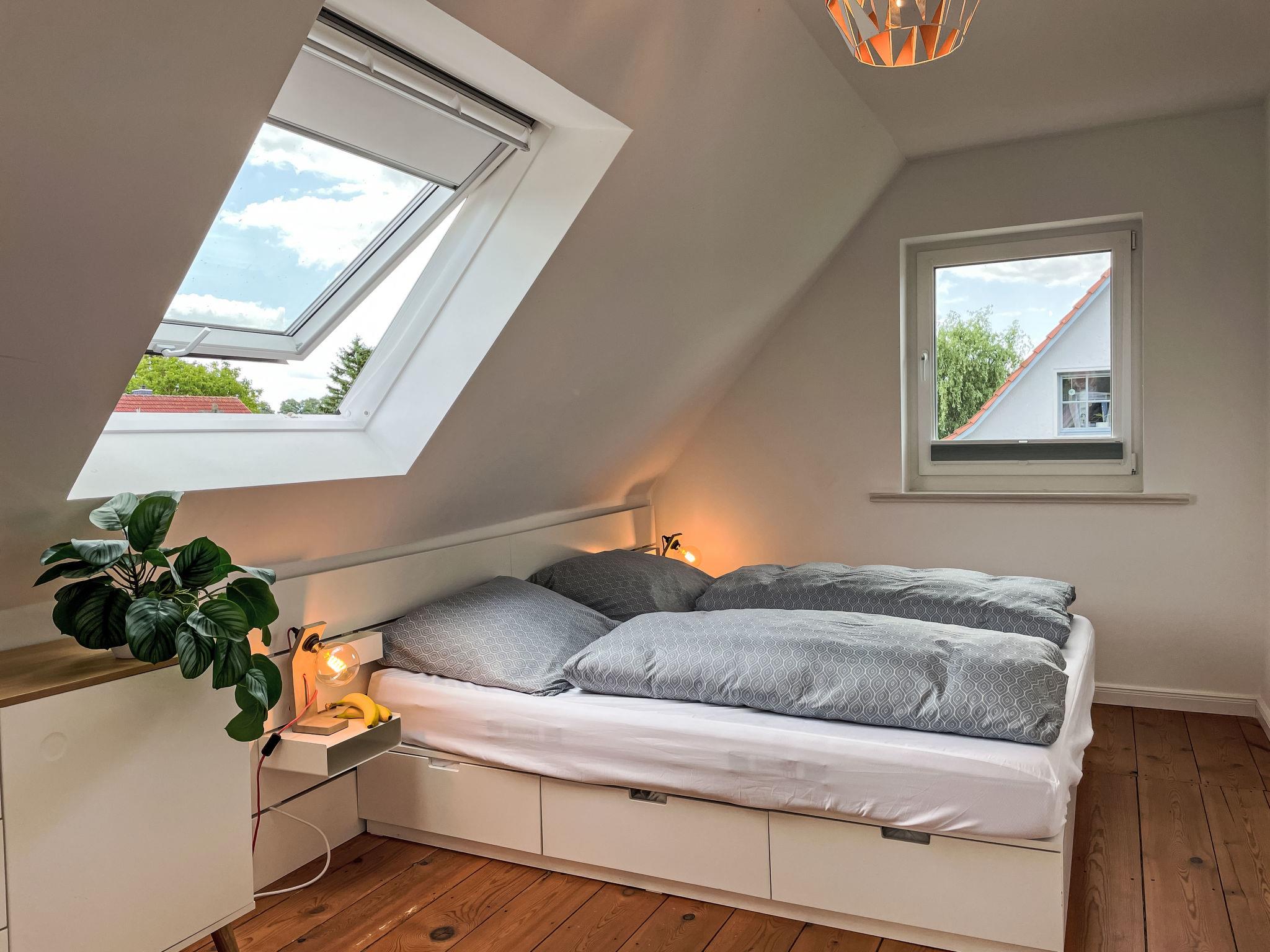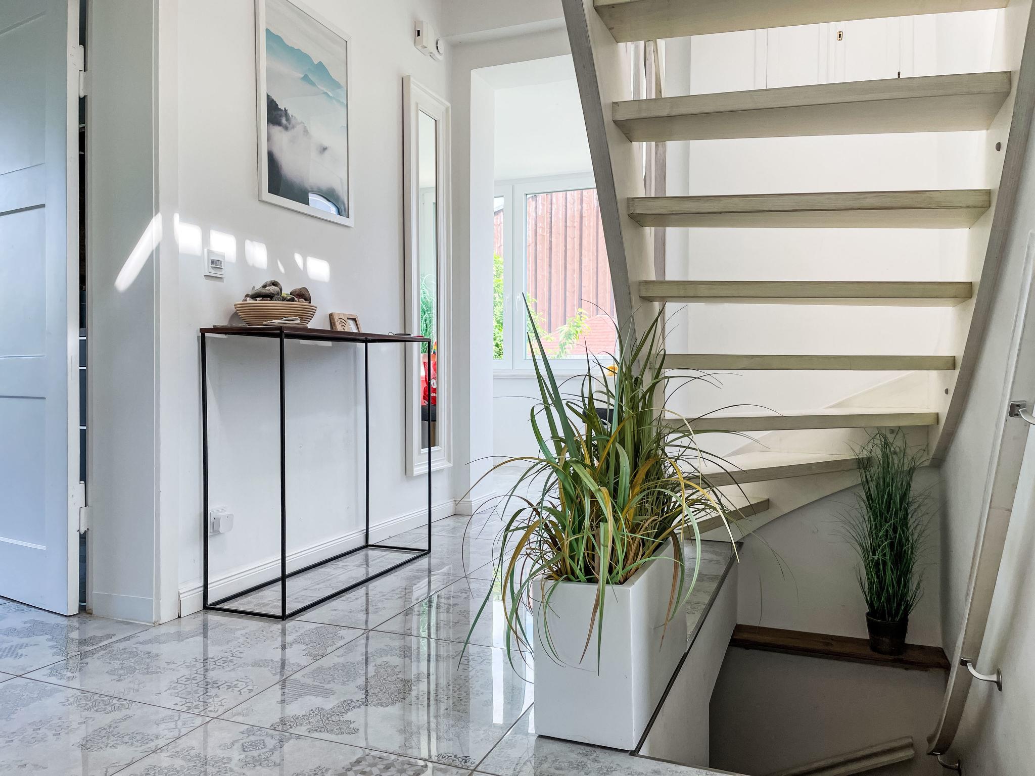 4-room house 114 m2 on 2 levels. Spacious and bright, modern and cosy furnishings: living room with digital TV and radio. Open kitchen (oven, dishwasher, 4 induction hot plates, toaster, kettle, electric coffee machine) with dining table. Exit to the garden, to the terrace. Shower/WC. Heating. Upper floor: 1 room with sloping ceilings with 1 double bed (180 cm, length 200 cm). 2 rooms with sloping ceilings, each room with 1 pull-out bed (2 pers. 2 x 80 cm, length 200 cm). Wooden floors. Large terrace. Terrace furniture. Beautiful view of the garden. Facilities: washing machine, dryer, iron. Internet (WiFi, free). Parking (1 car) at the house. Please note: suitable for families. Non-smoking house. Maximum 2 pets/ dogs allowed. Smoke alarm. The living room features a bright bay window that serves as a reading corner. The kitchen features a BORA cooktop and a Quooker faucet.