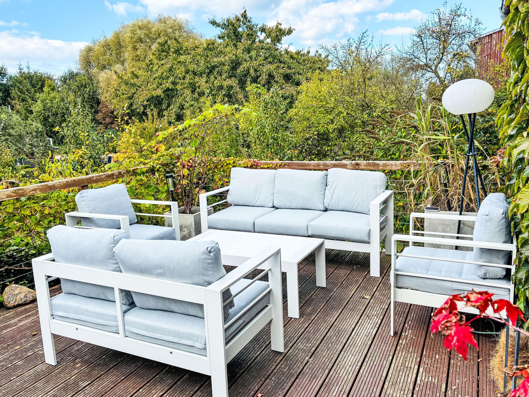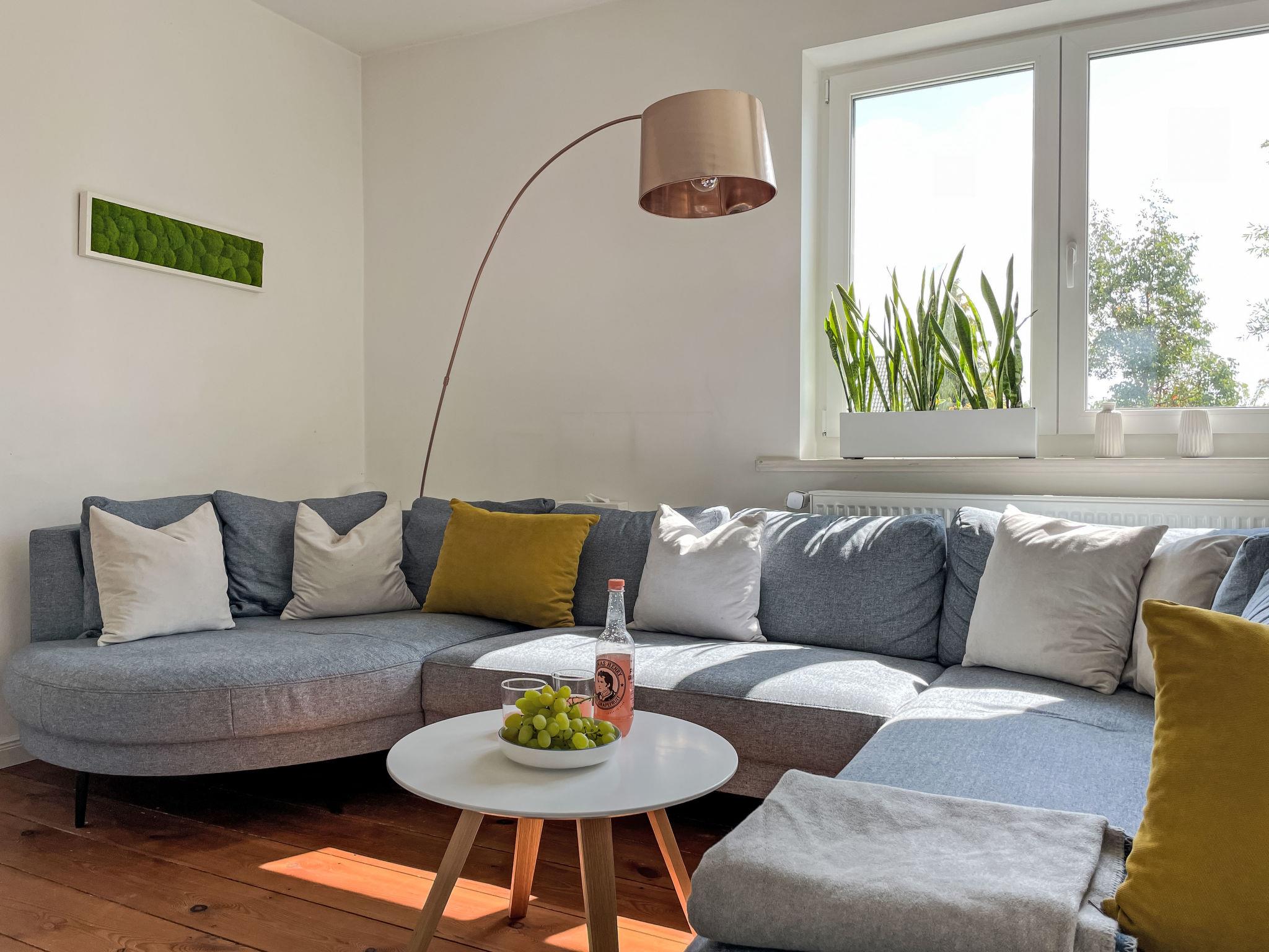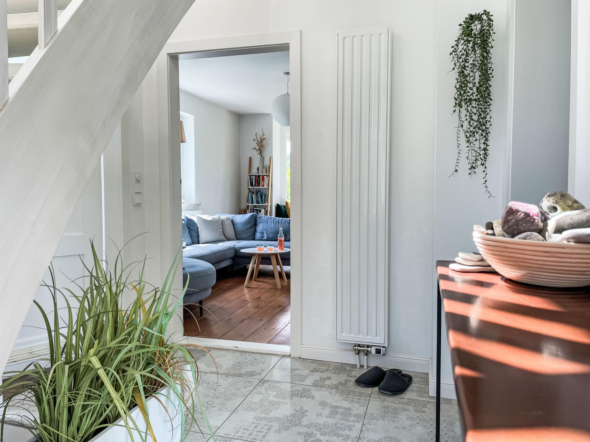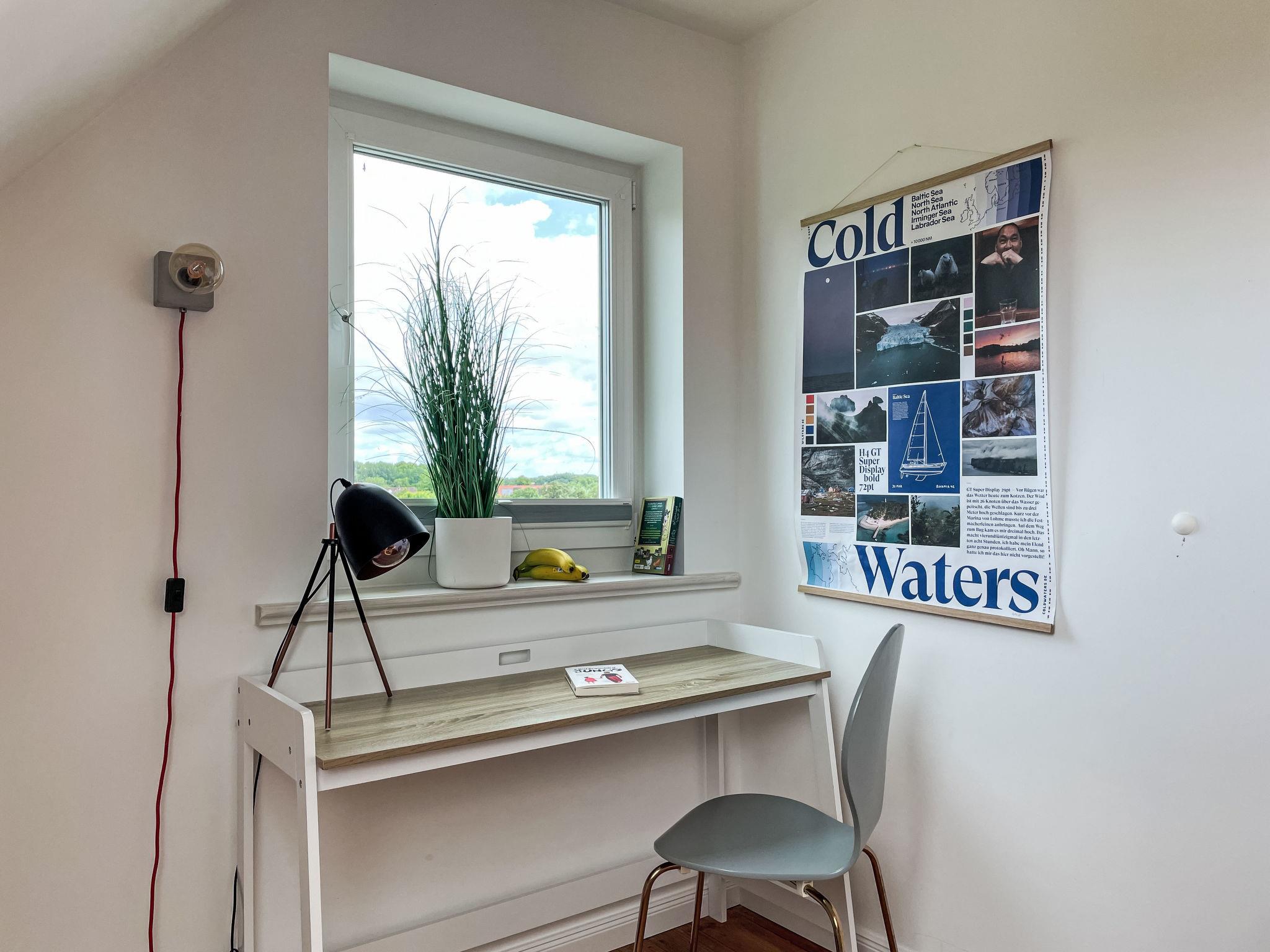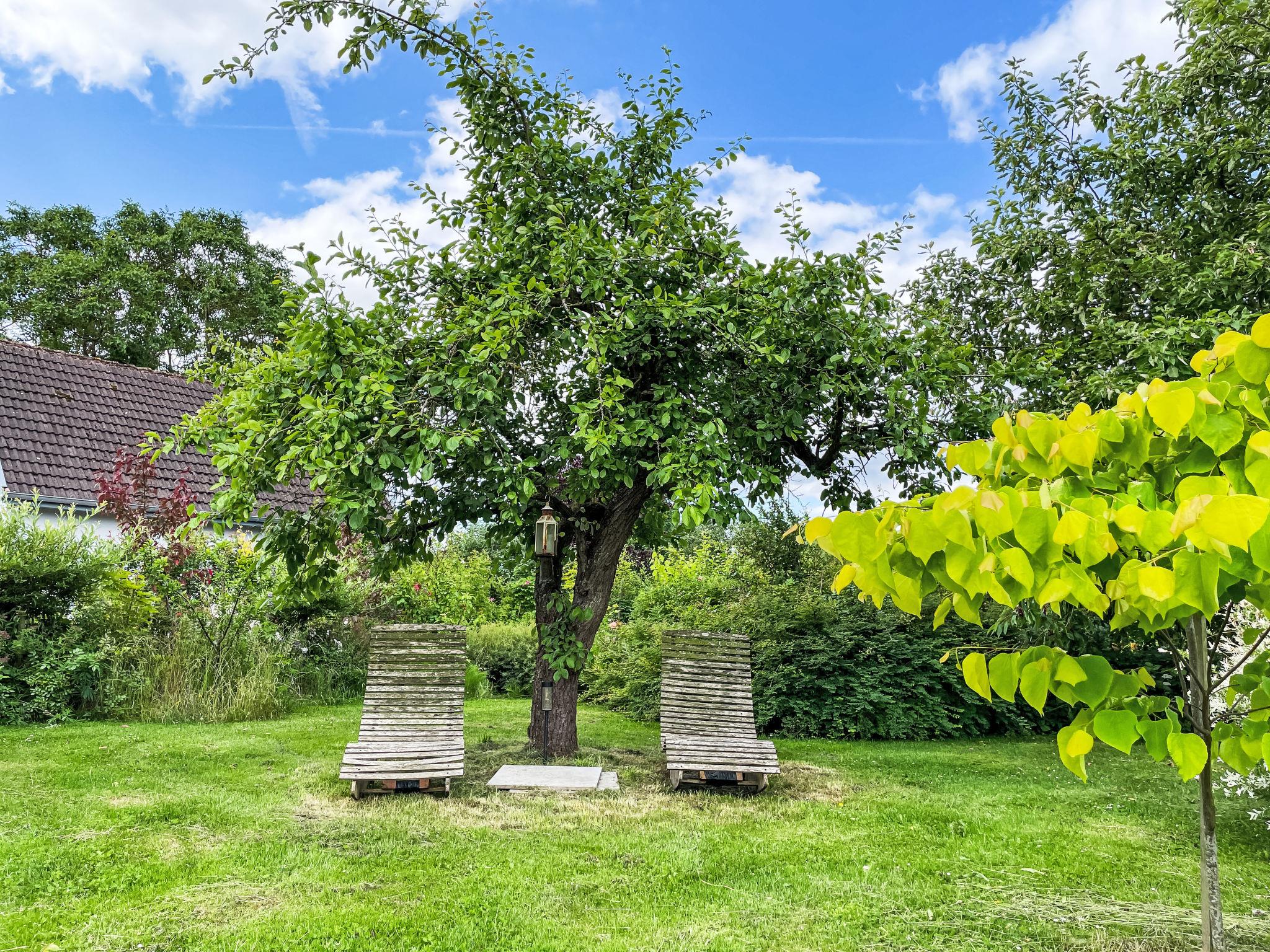 4-room house 114 m2 on 2 levels. Spacious and bright, modern and cosy furnishings: living room with digital TV and radio. Open kitchen (oven, dishwasher, 4 induction hot plates, toaster, kettle, electric coffee machine) with dining table. Exit to the garden, to the terrace. Shower/WC. Heating. Upper floor: 1 room with sloping ceilings with 1 double bed (180 cm, length 200 cm). 2 rooms with sloping ceilings, each room with 1 pull-out bed (2 pers. 2 x 80 cm, length 200 cm). Wooden floors. Large terrace. Terrace furniture. Beautiful view of the garden. Facilities: washing machine, dryer, iron. Internet (WiFi, free). Parking (1 car) at the house. Please note: suitable for families. Non-smoking house. Maximum 2 pets/ dogs allowed. Smoke alarm. The living room features a bright bay window that serves as a reading corner. The kitchen features a BORA cooktop and a Quooker faucet.