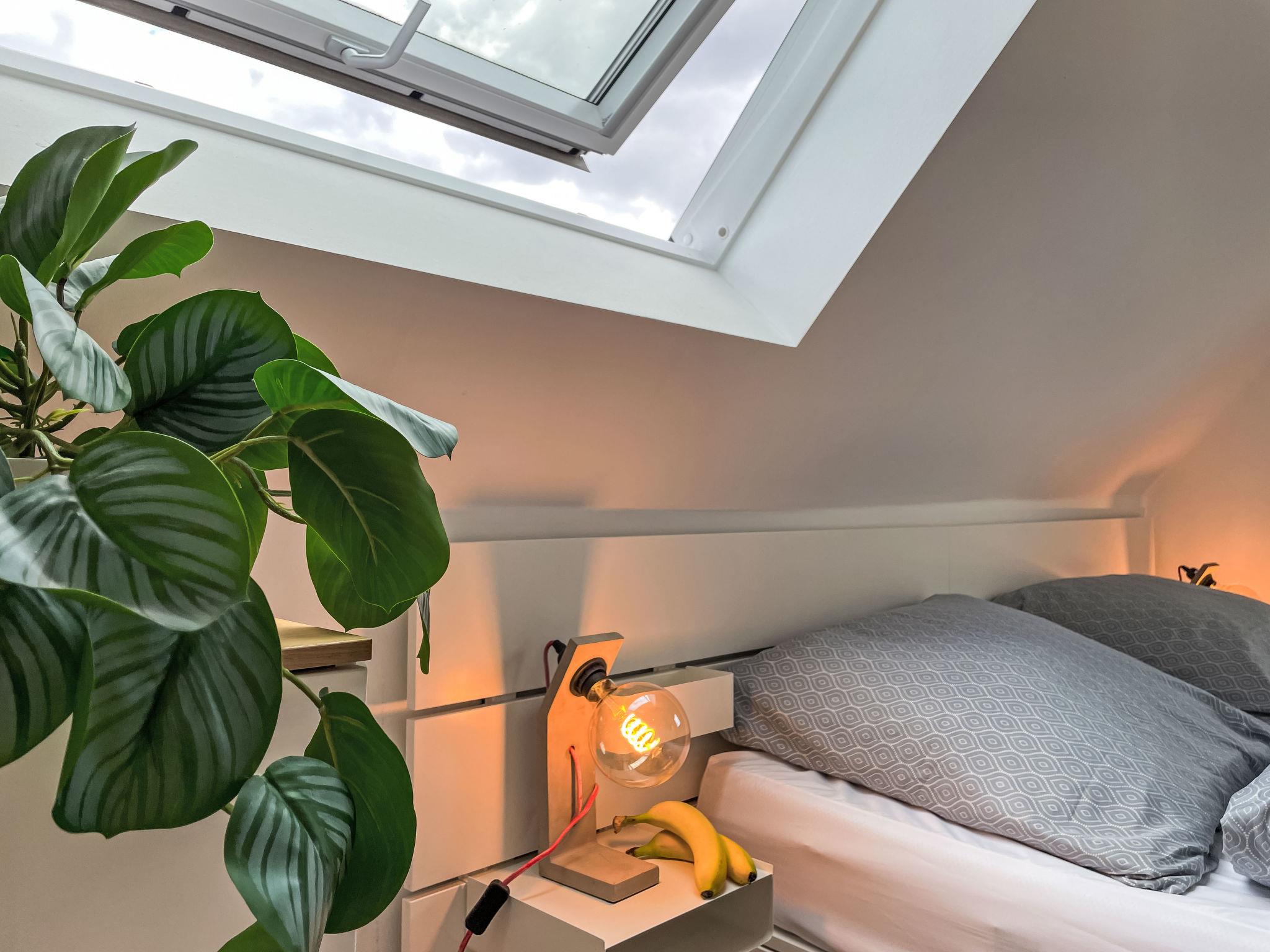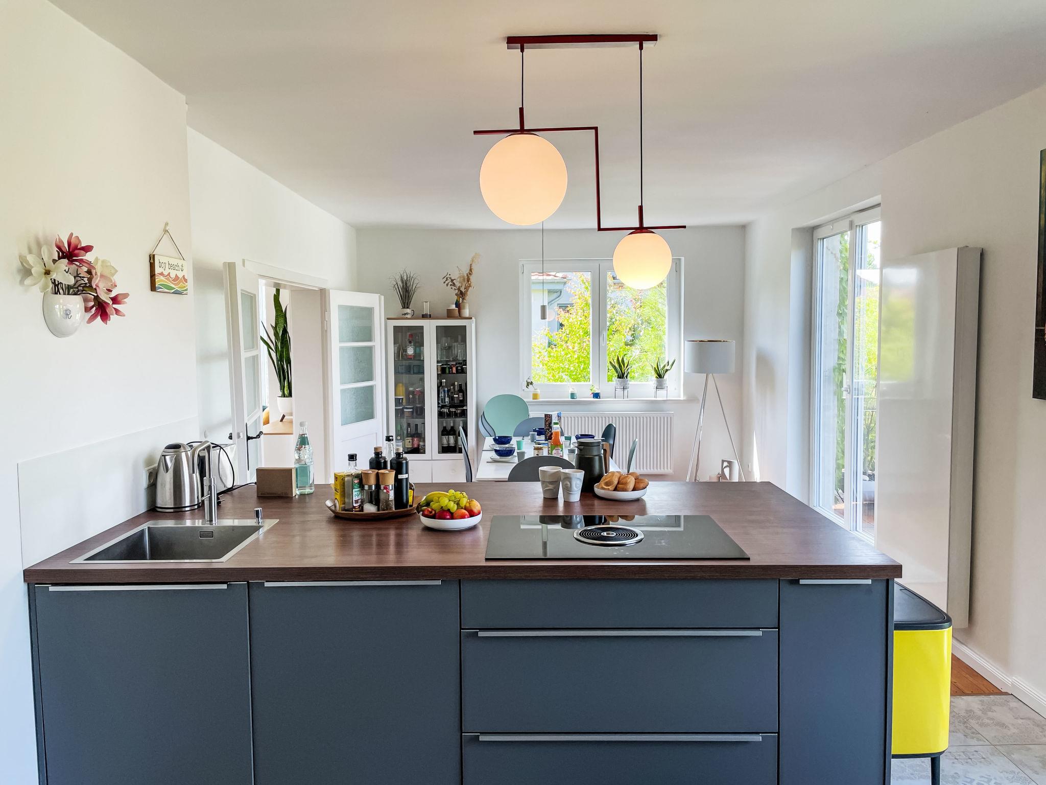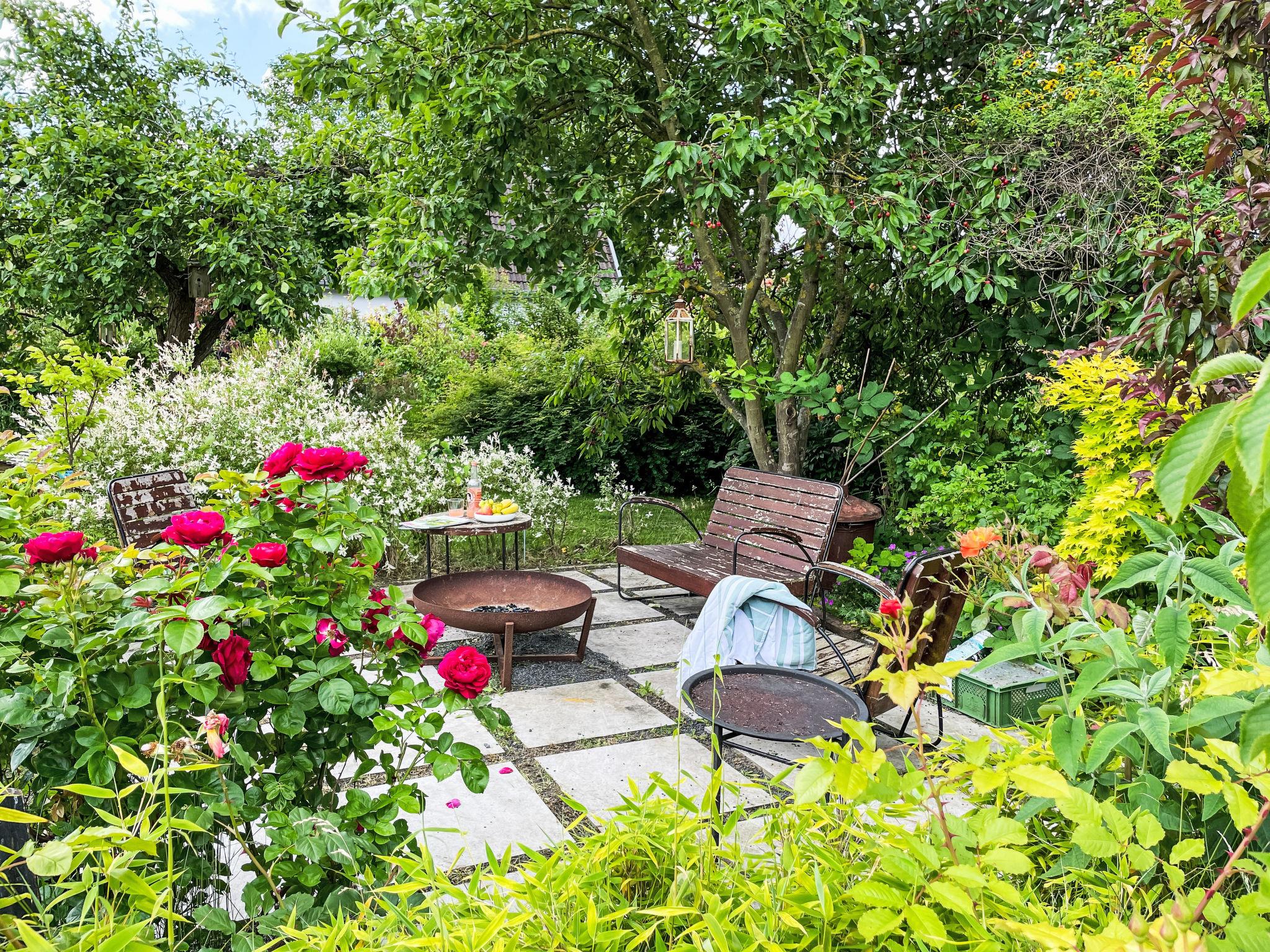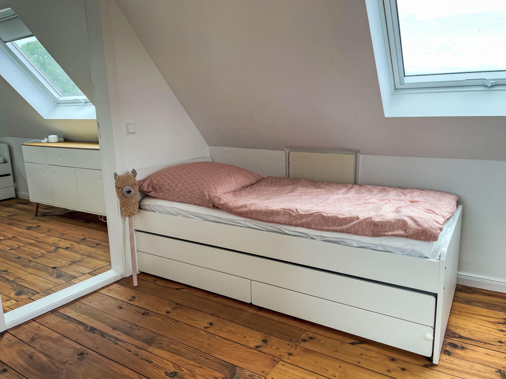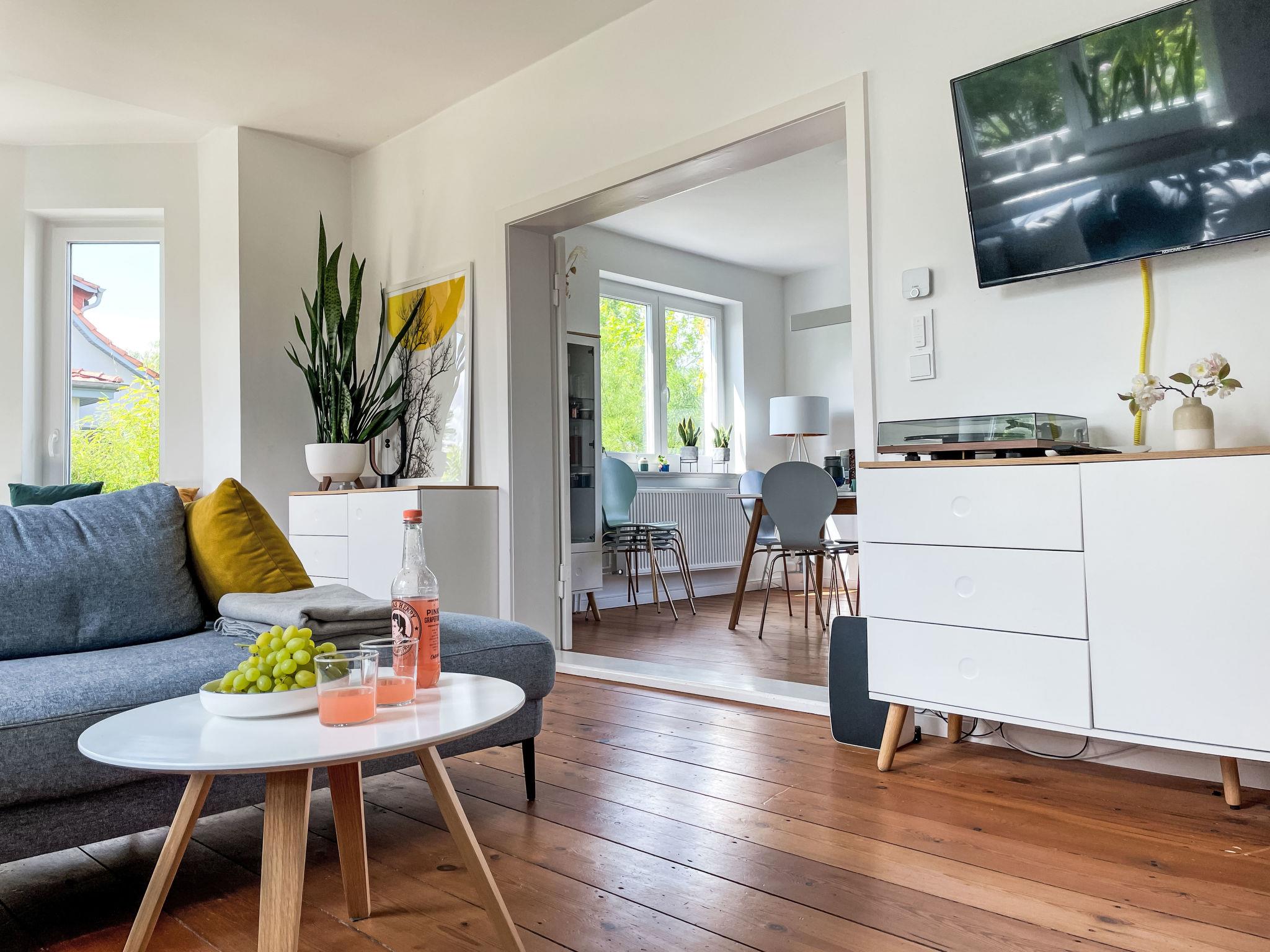 4-room house 114 m2 on 2 levels. Spacious and bright, modern and cosy furnishings: living room with digital TV and radio. Open kitchen (oven, dishwasher, 4 induction hot plates, toaster, kettle, electric coffee machine) with dining table. Exit to the garden, to the terrace. Shower/WC. Heating. Upper floor: 1 room with sloping ceilings with 1 double bed (180 cm, length 200 cm). 2 rooms with sloping ceilings, each room with 1 pull-out bed (2 pers. 2 x 80 cm, length 200 cm). Wooden floors. Large terrace. Terrace furniture. Beautiful view of the garden. Facilities: washing machine, dryer, iron. Internet (WiFi, free). Parking (1 car) at the house. Please note: suitable for families. Non-smoking house. Maximum 2 pets/ dogs allowed. Smoke alarm. The living room features a bright bay window that serves as a reading corner. The kitchen features a BORA cooktop and a Quooker faucet.