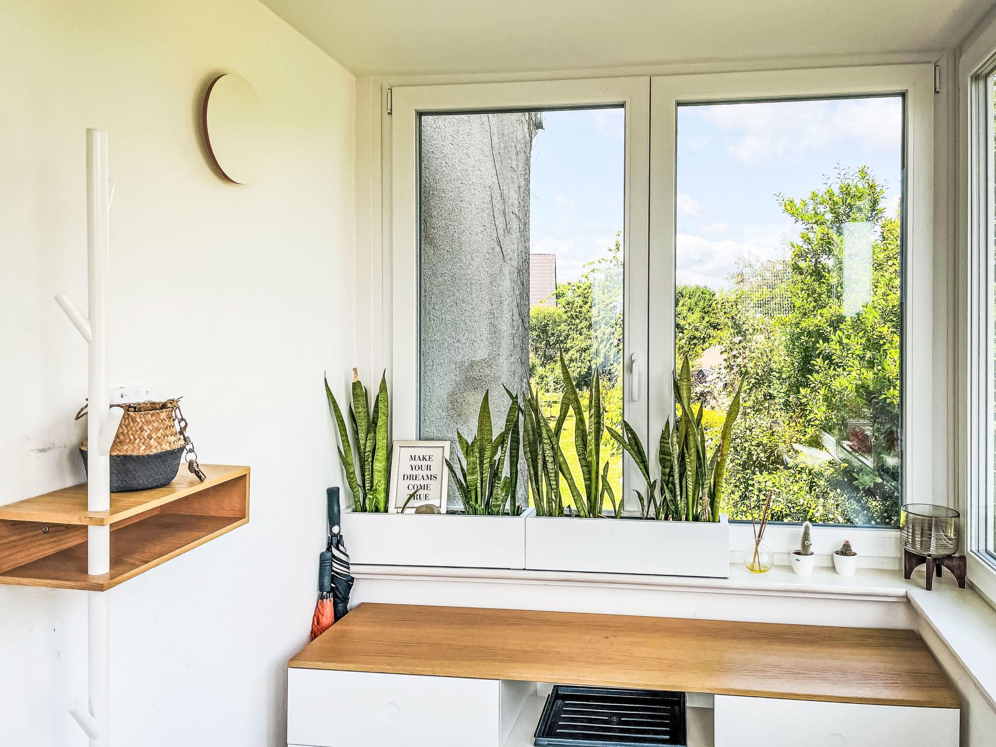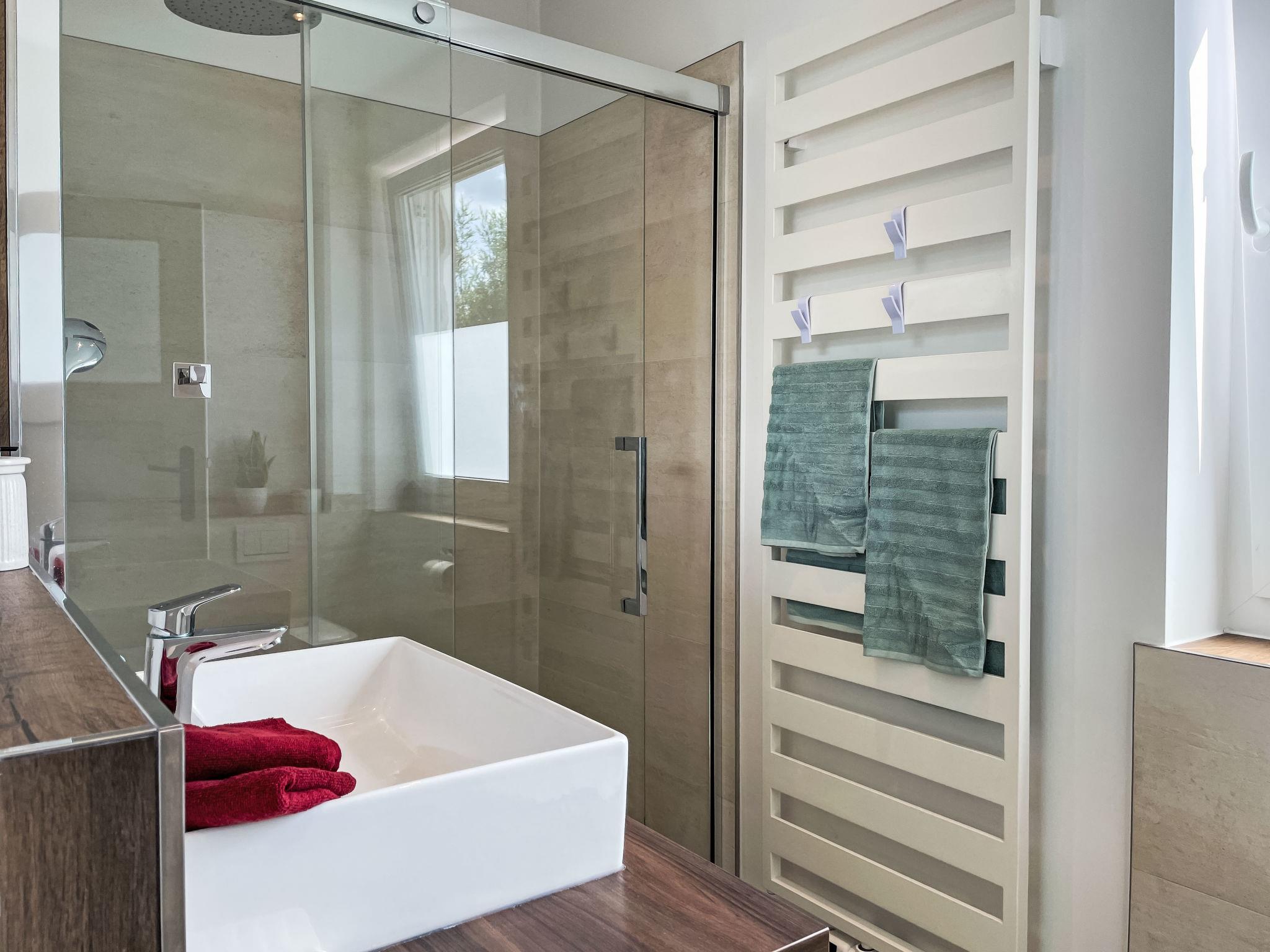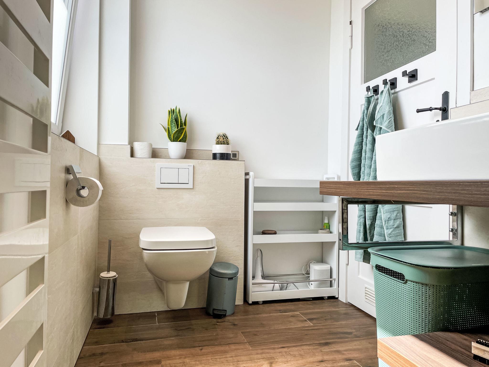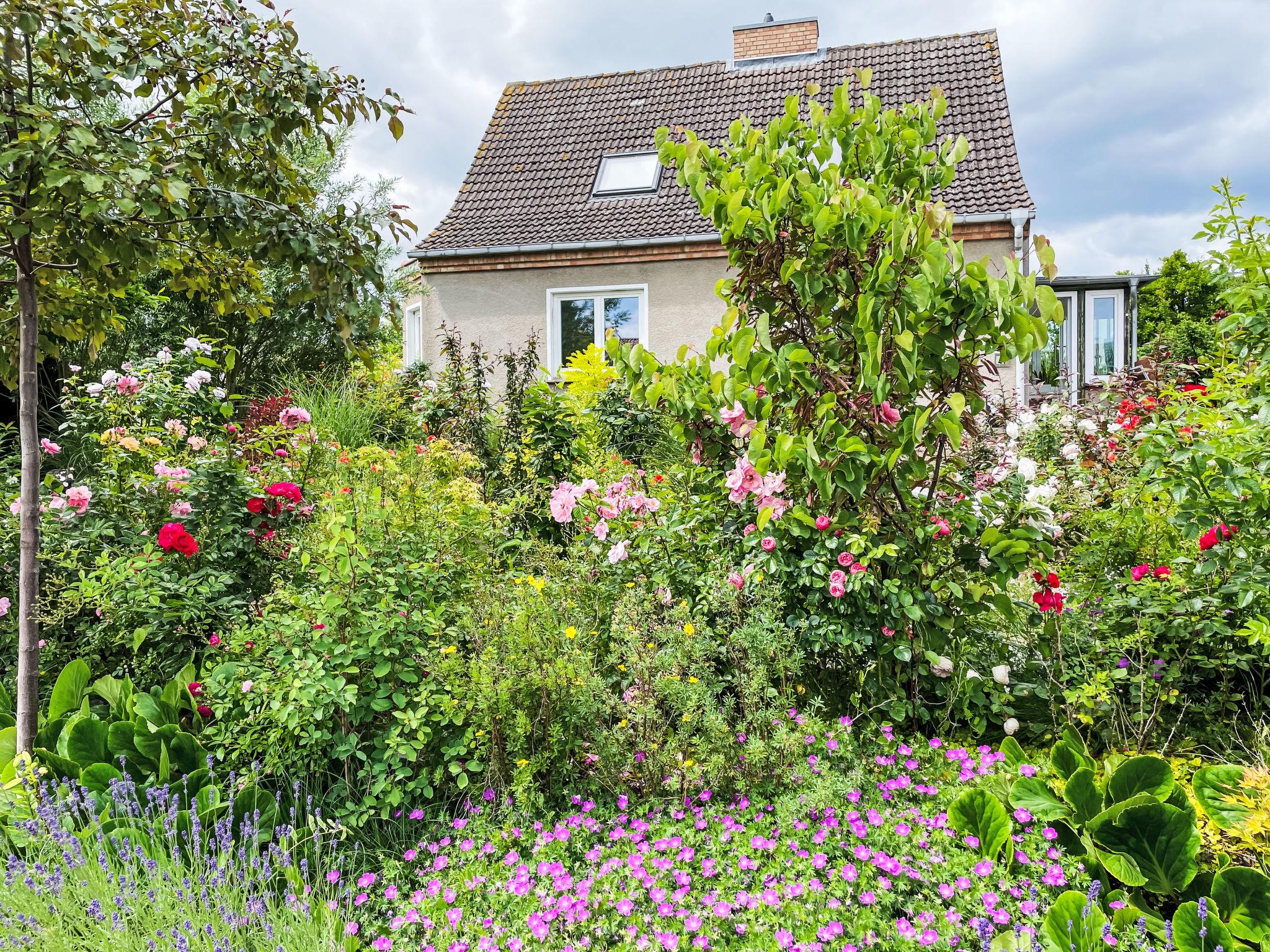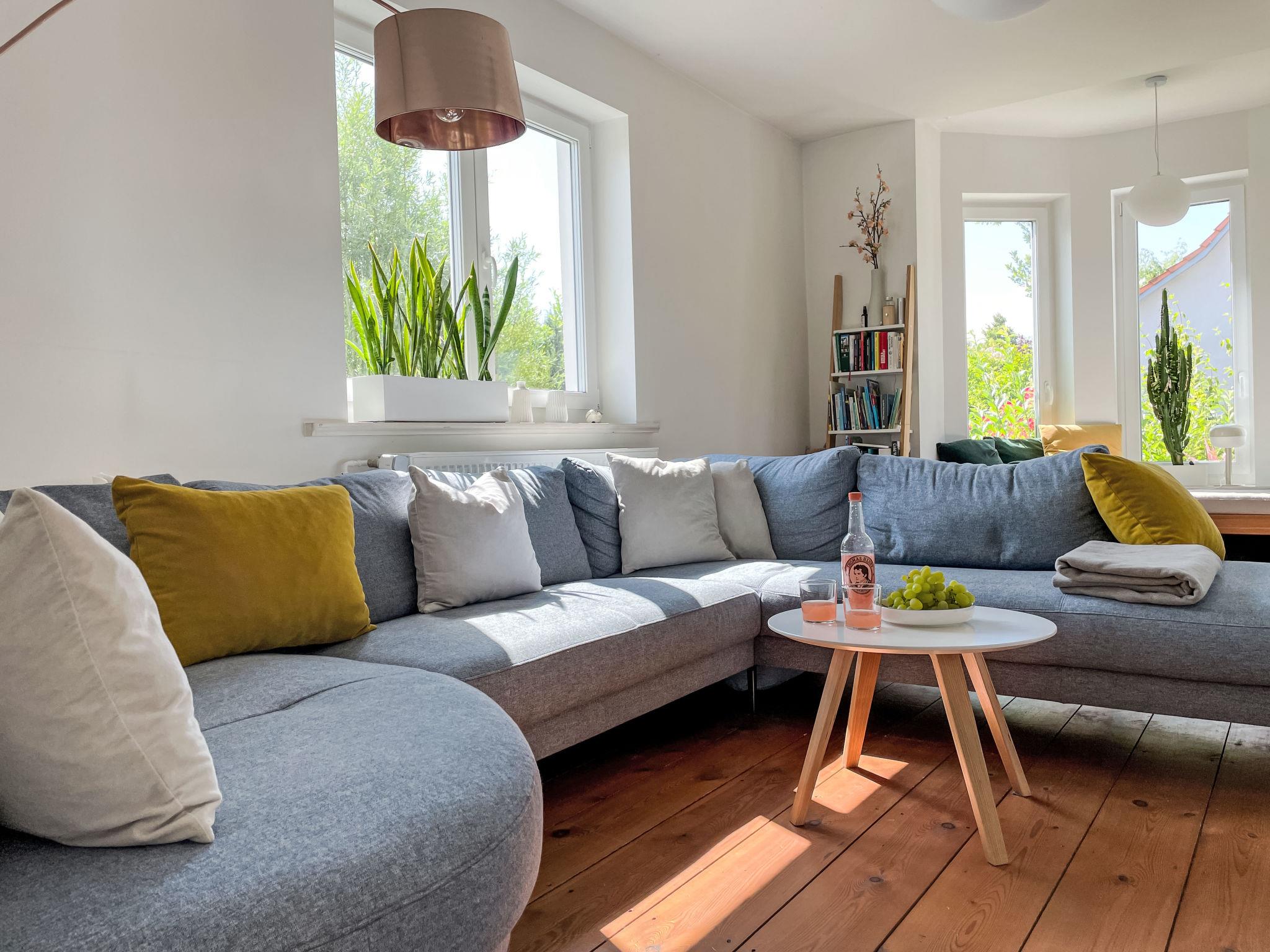 4-room house 114 m2 on 2 levels. Spacious and bright, modern and cosy furnishings: living room with digital TV and radio. Open kitchen (oven, dishwasher, 4 induction hot plates, toaster, kettle, electric coffee machine) with dining table. Exit to the garden, to the terrace. Shower/WC. Heating. Upper floor: 1 room with sloping ceilings with 1 double bed (180 cm, length 200 cm). 2 rooms with sloping ceilings, each room with 1 pull-out bed (2 pers. 2 x 80 cm, length 200 cm). Wooden floors. Large terrace. Terrace furniture. Beautiful view of the garden. Facilities: washing machine, dryer, iron. Internet (WiFi, free). Parking (1 car) at the house. Please note: suitable for families. Non-smoking house. Maximum 2 pets/ dogs allowed. Smoke alarm. The living room features a bright bay window that serves as a reading corner. The kitchen features a BORA cooktop and a Quooker faucet.