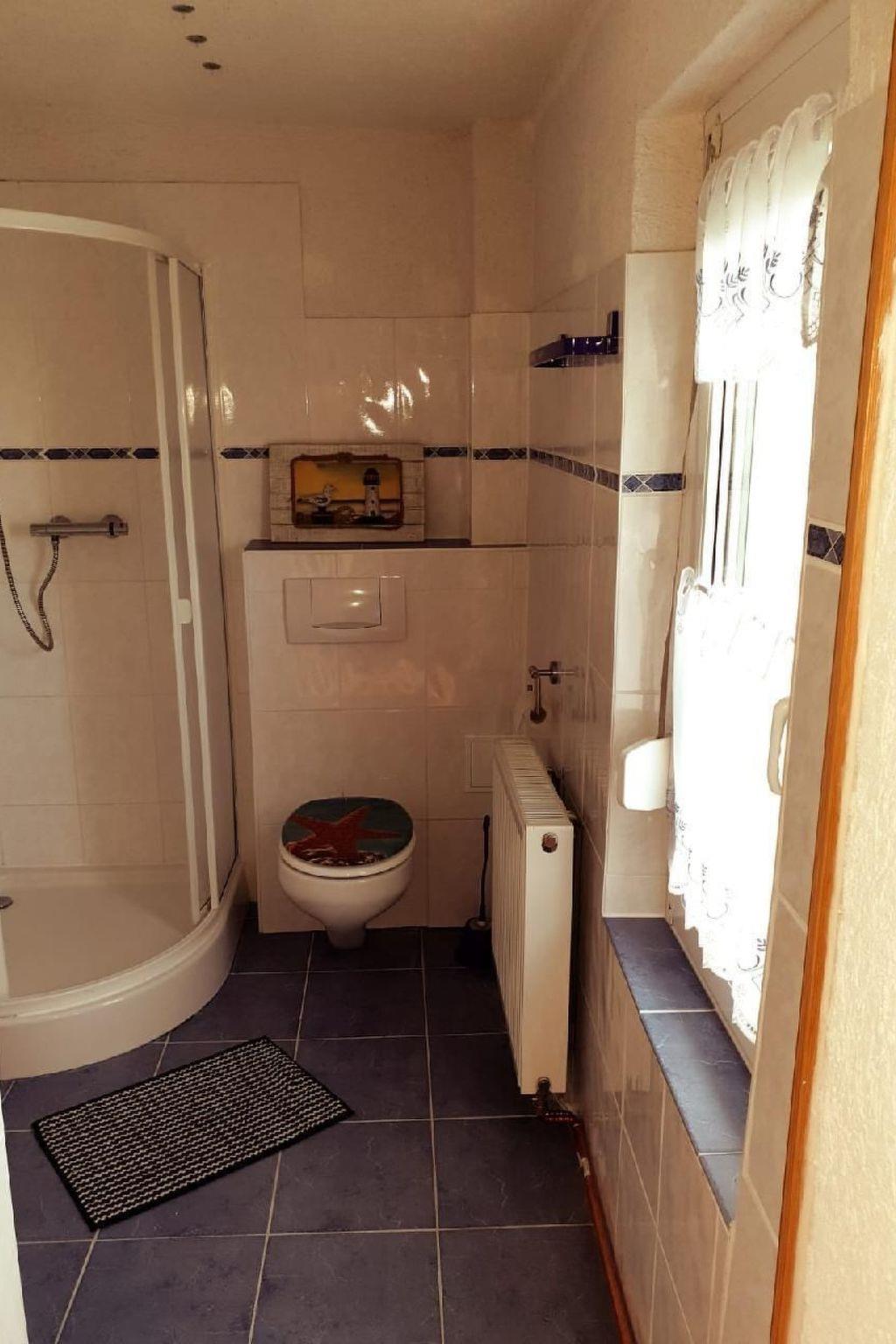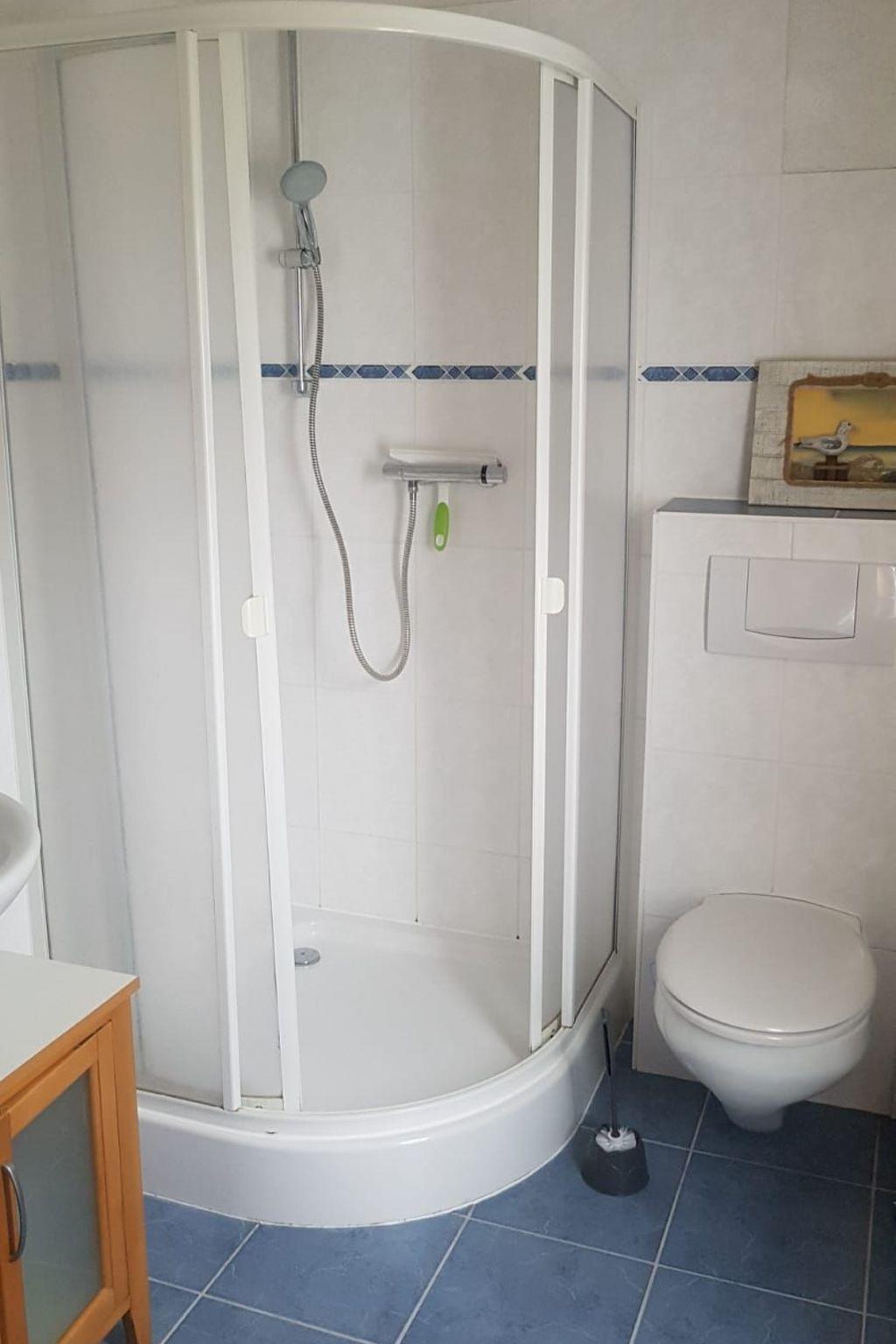 A daylight bathroom is equipped with a shower, WC and washbasin.