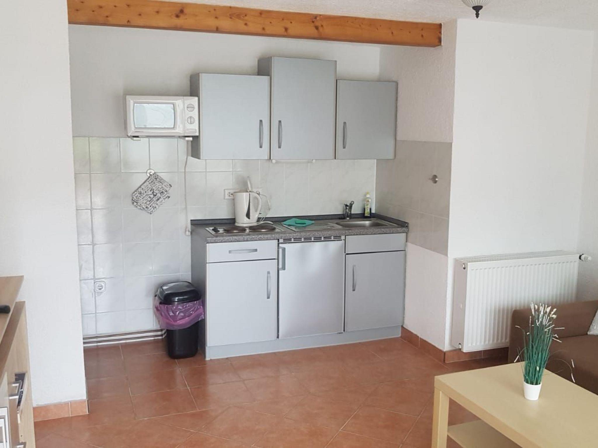 The bright living and dining room is equipped with a single kitchen (2 hotplates, a microwave, a small oven and a fridge, coffee machine and toaster), cupboards, a dining area for 5 people and a TV.