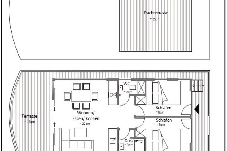 Stueetage: (åbent køkken(kogeplade(Komfur med to kogeplader, glaskeramisk), elkedel, brødrister, kaffemaskine, mikrobølgeovn, opvaskemaskine , køleskab), stue / spisestue(Fjernsyn(fladskærm, parabol), spisebord, sofahjørne, radio), soveværelse(dobbeltseng), soveværelse(dobbeltseng), badeværelse(bruser, håndvask), toilet(håndvask, toilet)) Brød udbringning, varme(gennem aircondition), terrasse(16 m2), tagterrasse, havemøbler, parkering, liggestole, Vaskeripakke inkl.