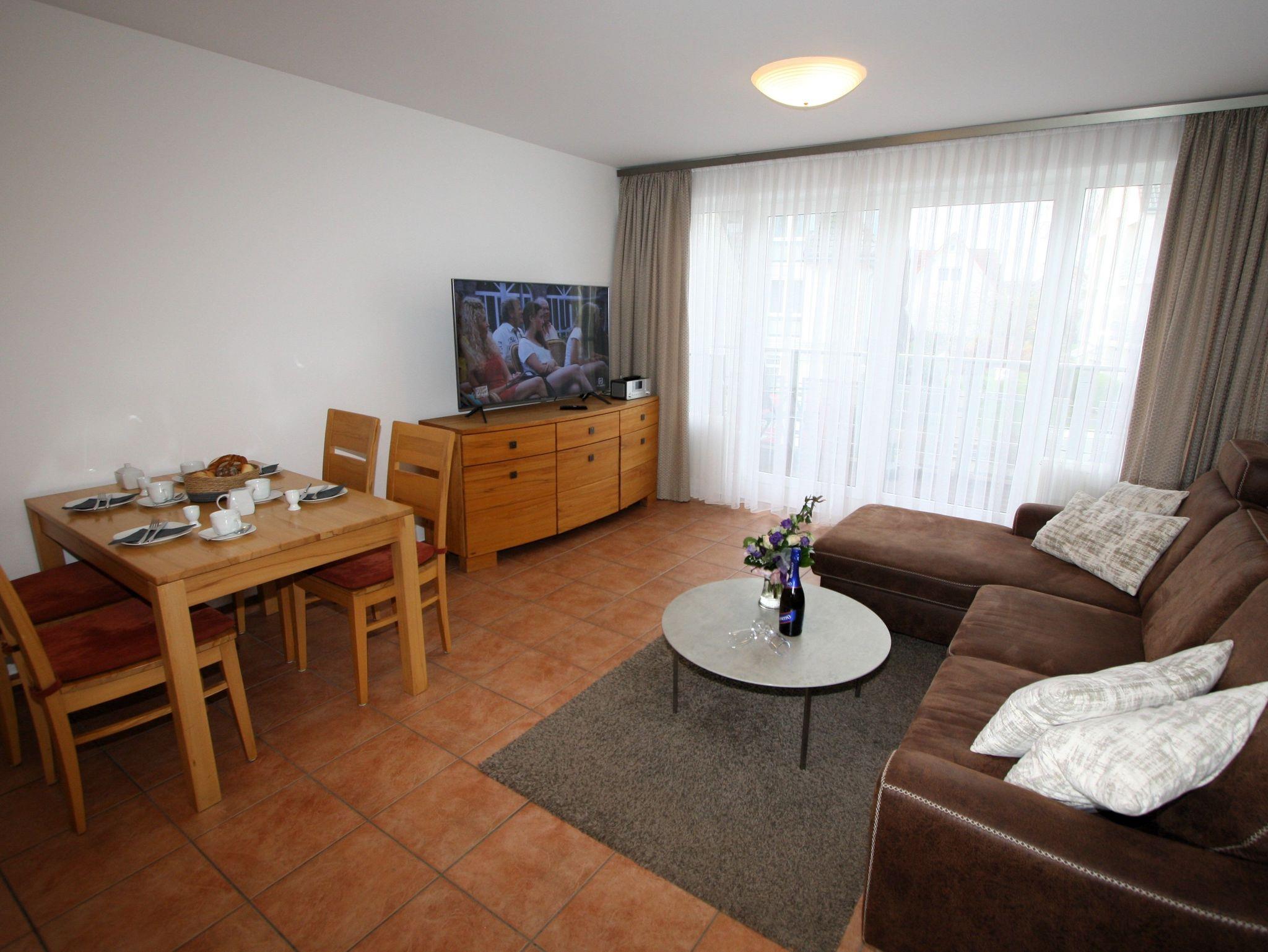 Ihre gut ausgestattete Zwei-Zimmer-Ferienwohnung für bis zu vier Personen verfügt über einen Balkon oder Terrasse, kostenfreies WLAN und sky-Empfang. Sie erreichen die Wohnung bequem mit dem Aufzug, für Ihren PKW steht ein Platz in der Tiefgarage zur Verfügung. Dort befindet sich zudem ein Waschraum mit Münzwaschmaschinen und Münzwäschetrockner und ein Platz für Ihre Fahrräder.