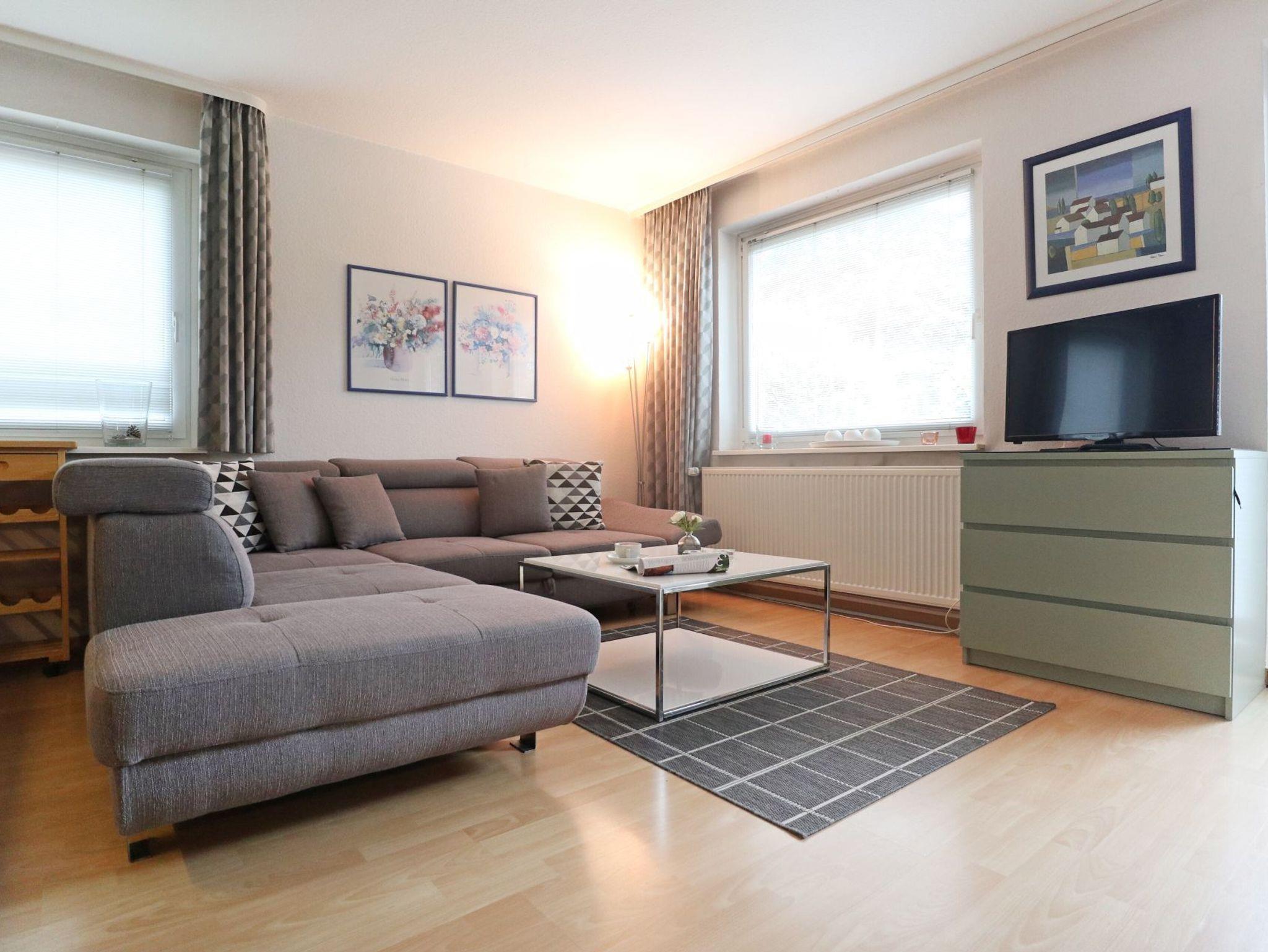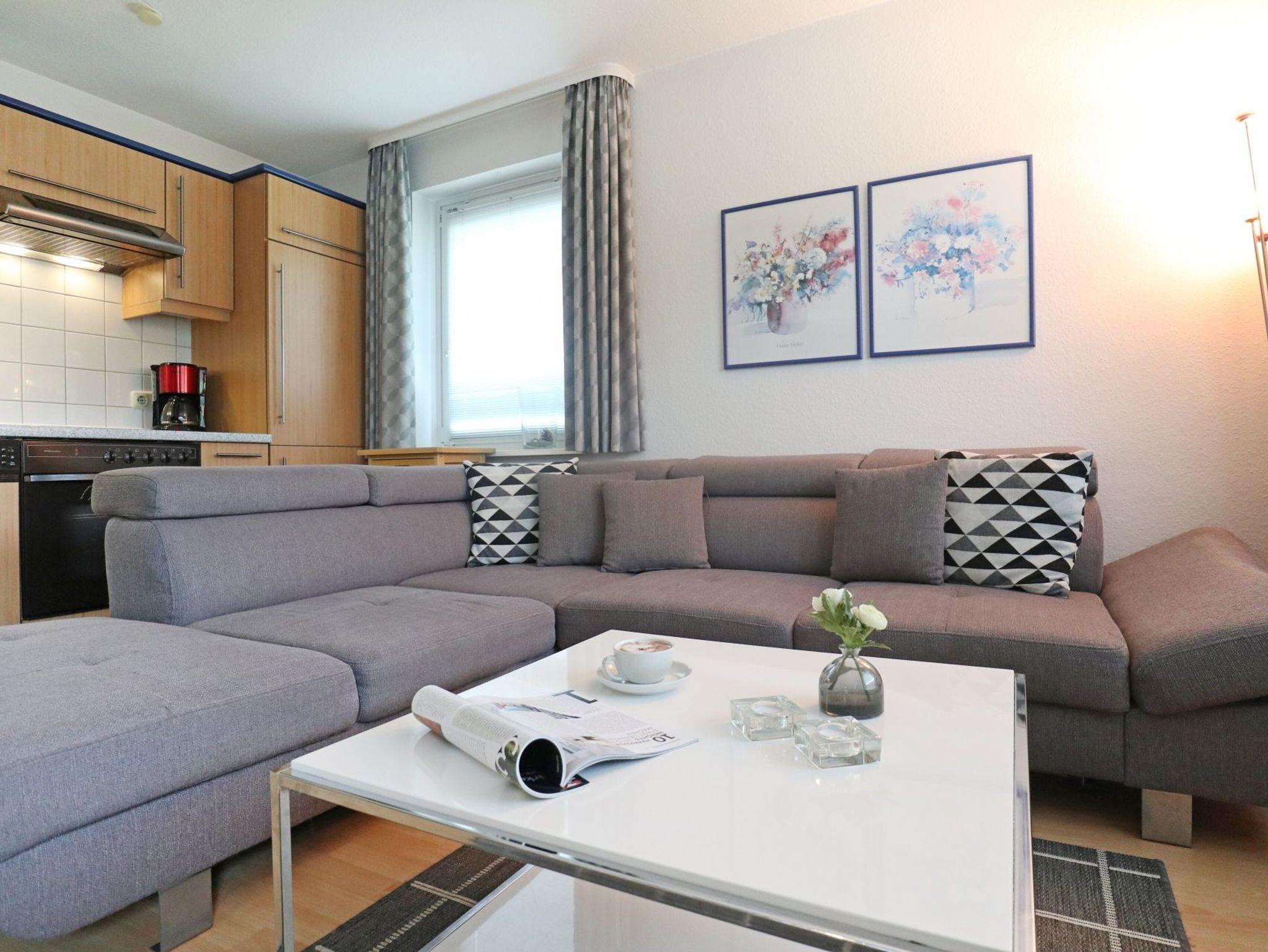 Die integrierte Küchenzeile ist voll ausgestattet mit Herd, Backofen, Mikrowelle, Geschirrspüler, Kaffeemaschine und Toaster. Erholung finden Sie auf der saisonal möblierten Süd-West-Terrasse.