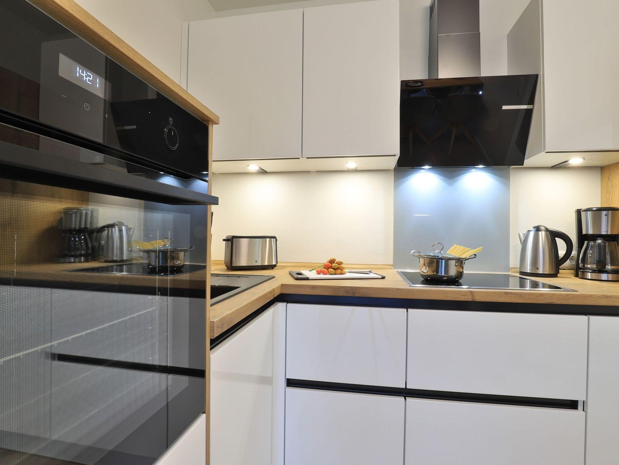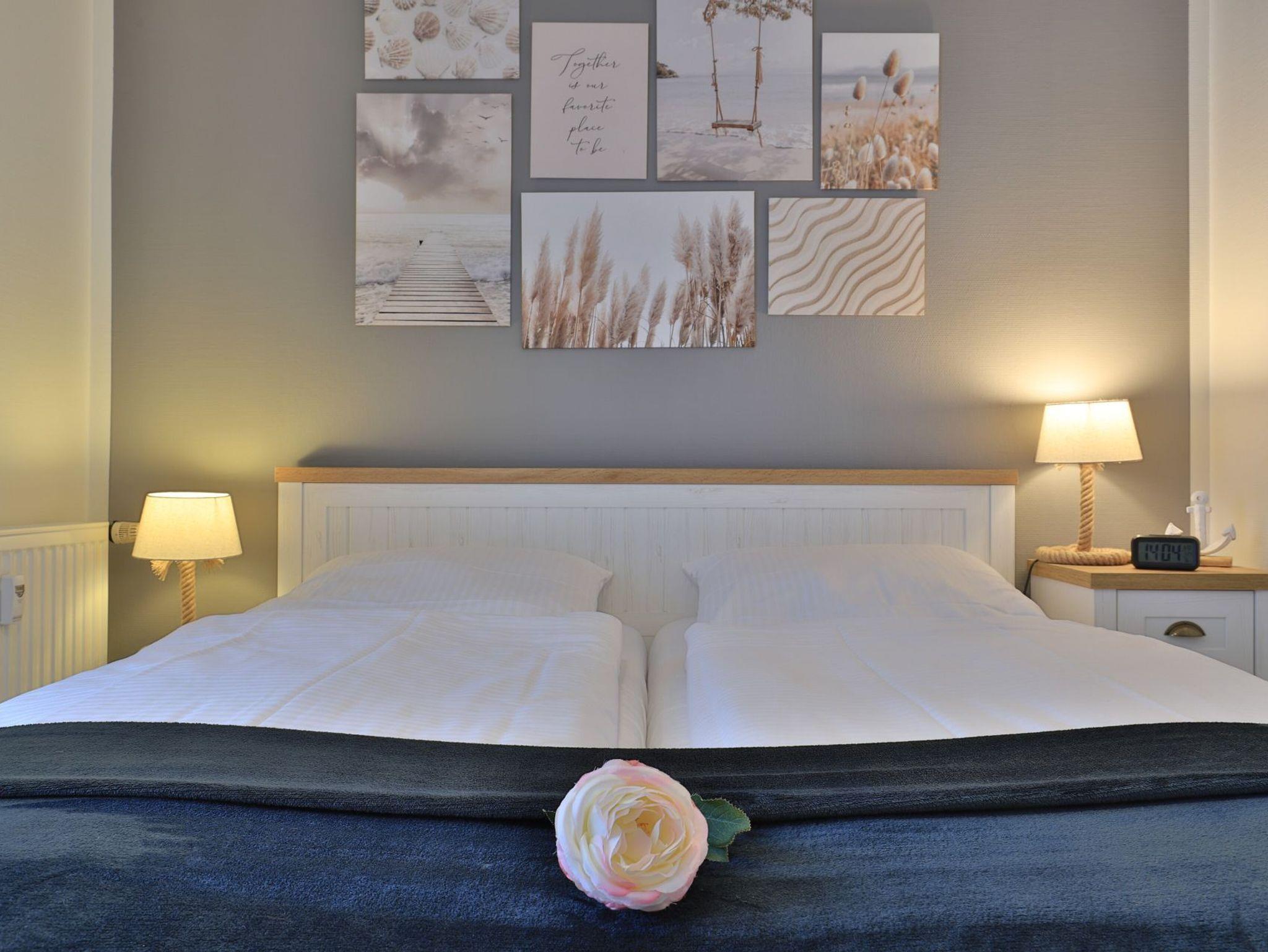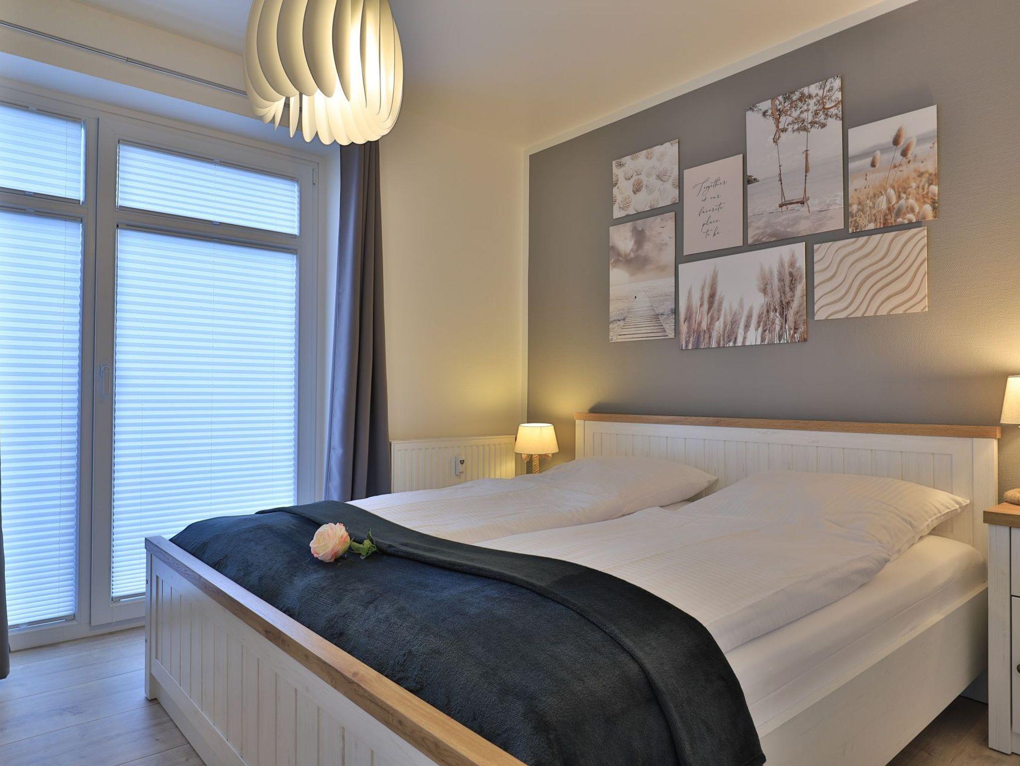 Das modernisierte 2-Zimmer Appartement befindet sich im Erdgeschoss und begeistert mit bester Ausstattung und stilvoller Möblierung. Die Wohnfläche ist mit 50m² ideal für eine Belegung mit bis zu 3 Personen. Im offenen Wohn-/Essbereich ermöglicht ein ausziehbares Komfortsofa eine dritte Schlafgelegenheit. Auch der Relax -Sessel lädt zum Entspannen ein. In der hochwertigen Küchenzeile können die Urlaubsmahlzeiten zubereitet werden: Herd, Backofen, Toaster, Kaffeemaschine, Wasserkocher, Geschirrspüler usw. laden zum Kochen ein. Für Unterhaltung sorgen ein Fernseher (kostenloser Sky-TV-/Primere Empfang) und eine Musikanlage. WLAN steht ohne zusätzliche Gebühr bereit. Dies Wohneinheit bietet eine saisonal möblierte Süd-Terrasse mit Strandkorb und dem zauberhaften Blick auf die Haffwiesen.