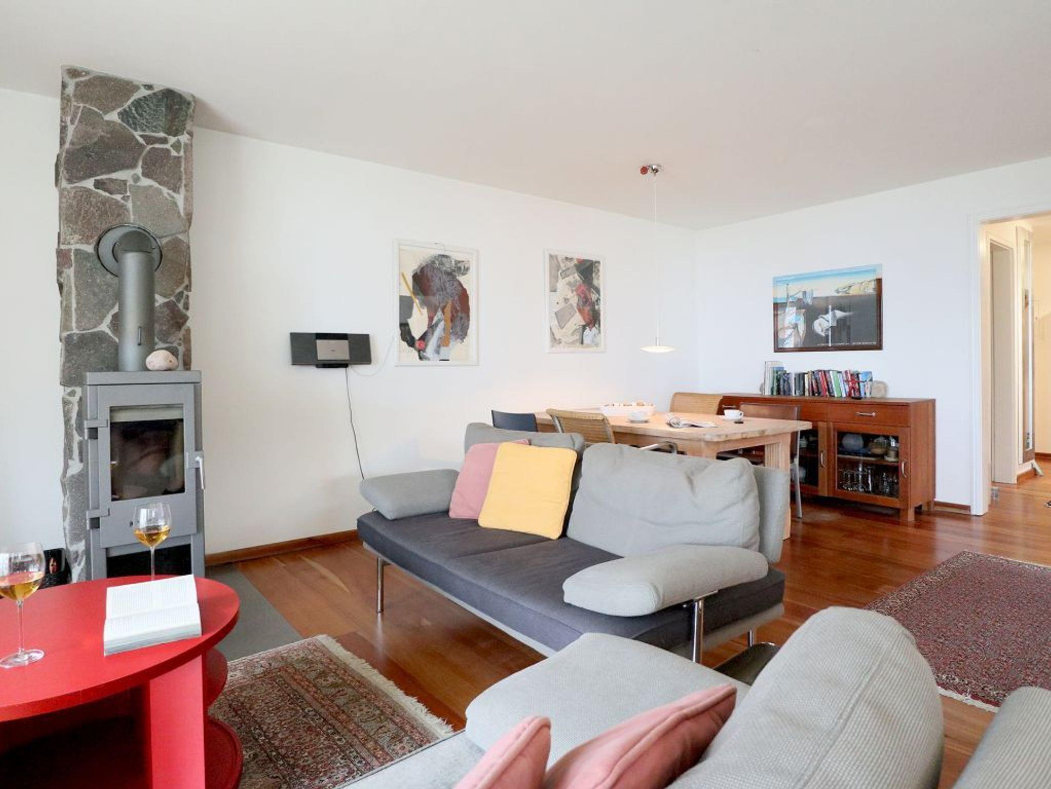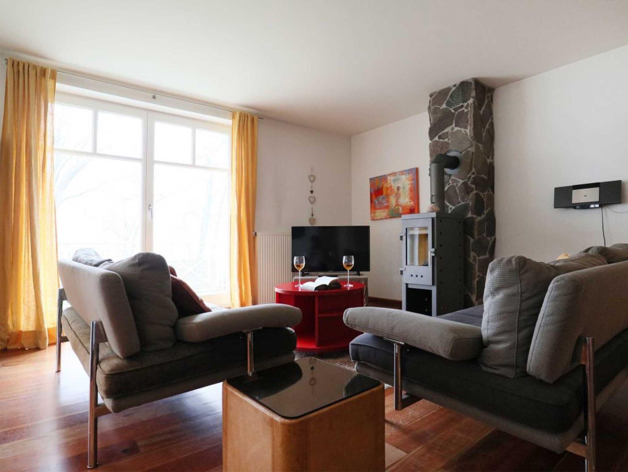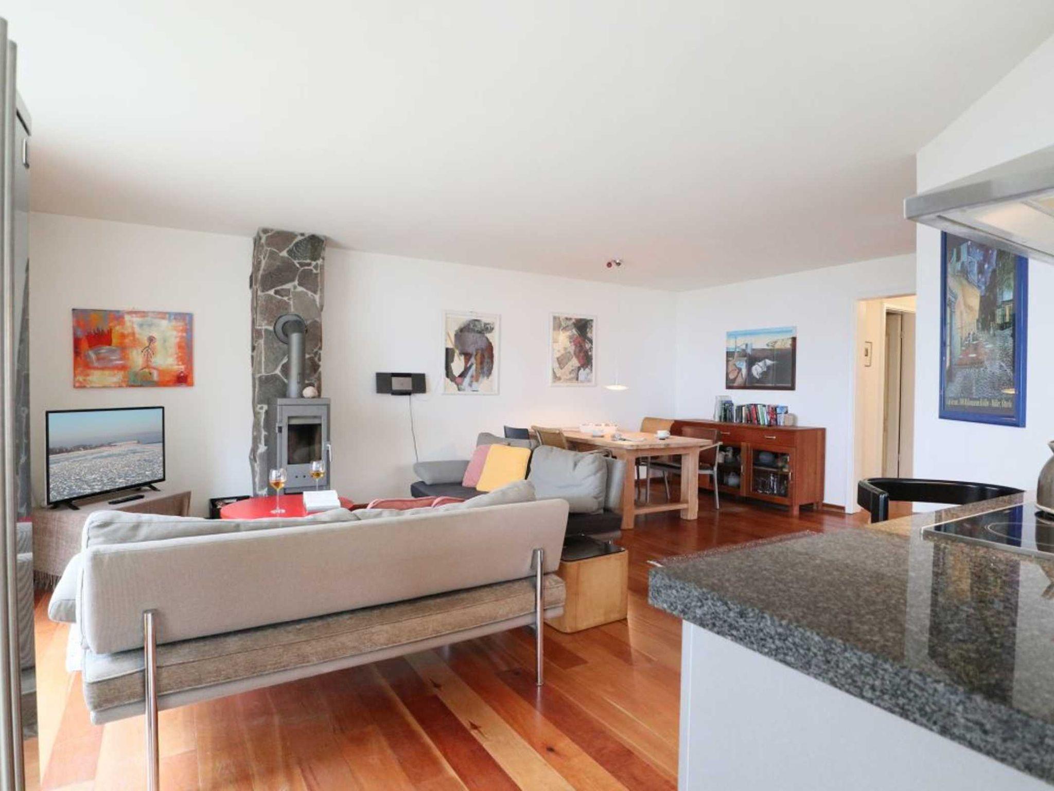 Diese Meerblick Ferienwohnung befindet sich im 1. Obergeschoss des Hauses. Die Wohnfläche von ca. 73qm kann mit max. 4 Personen bewohnt werden. Der offene Wohn-Essbereich mit Kaminofen, ist sehr komfortabel mit einer Sofagarnitur sowie einem großen Esstisch möbliert. Fernseher und Musikanlage sind ebenfalls vorhanden. Die offene Wohnküche ist voll ausgestattet und ermöglicht die Eigenversorgung: Herd, Backofen, Dunstabzug, amerikanischer Kühlschrank mit Eiswürfel Zubereiter, Kaffeemaschine, Toaster usw. ermöglichen die Herstellung von Urlaubsmahlzeiten. Das Domizil bietet Ihnen einen saisonal möblierten Balkon in nördliche Ausrichtung zur Ostsee.