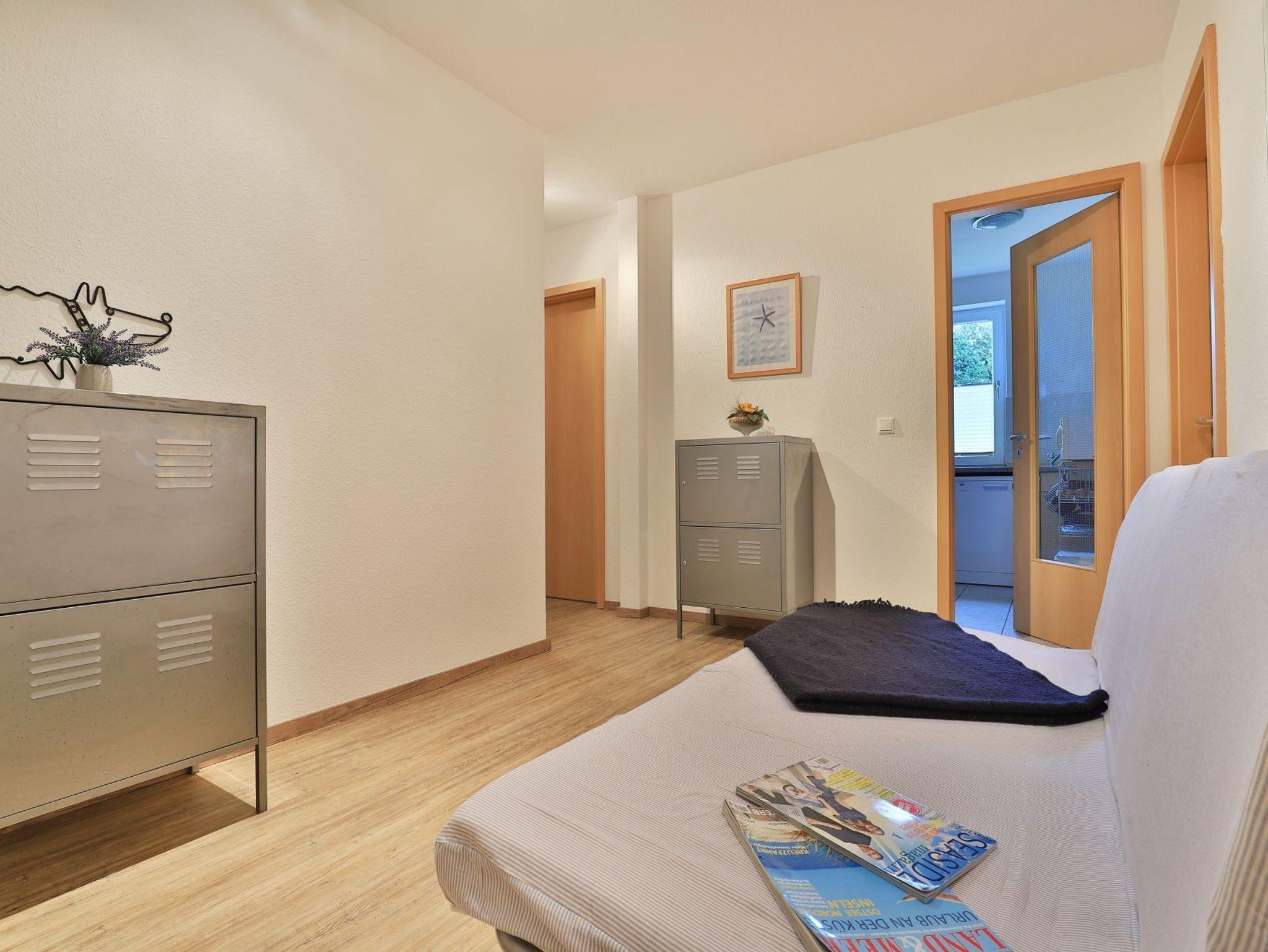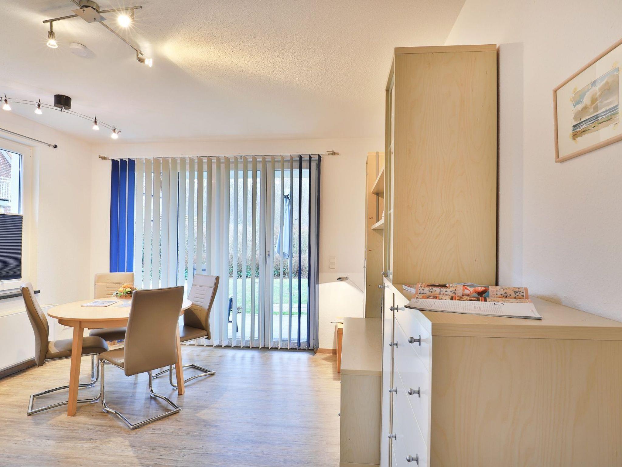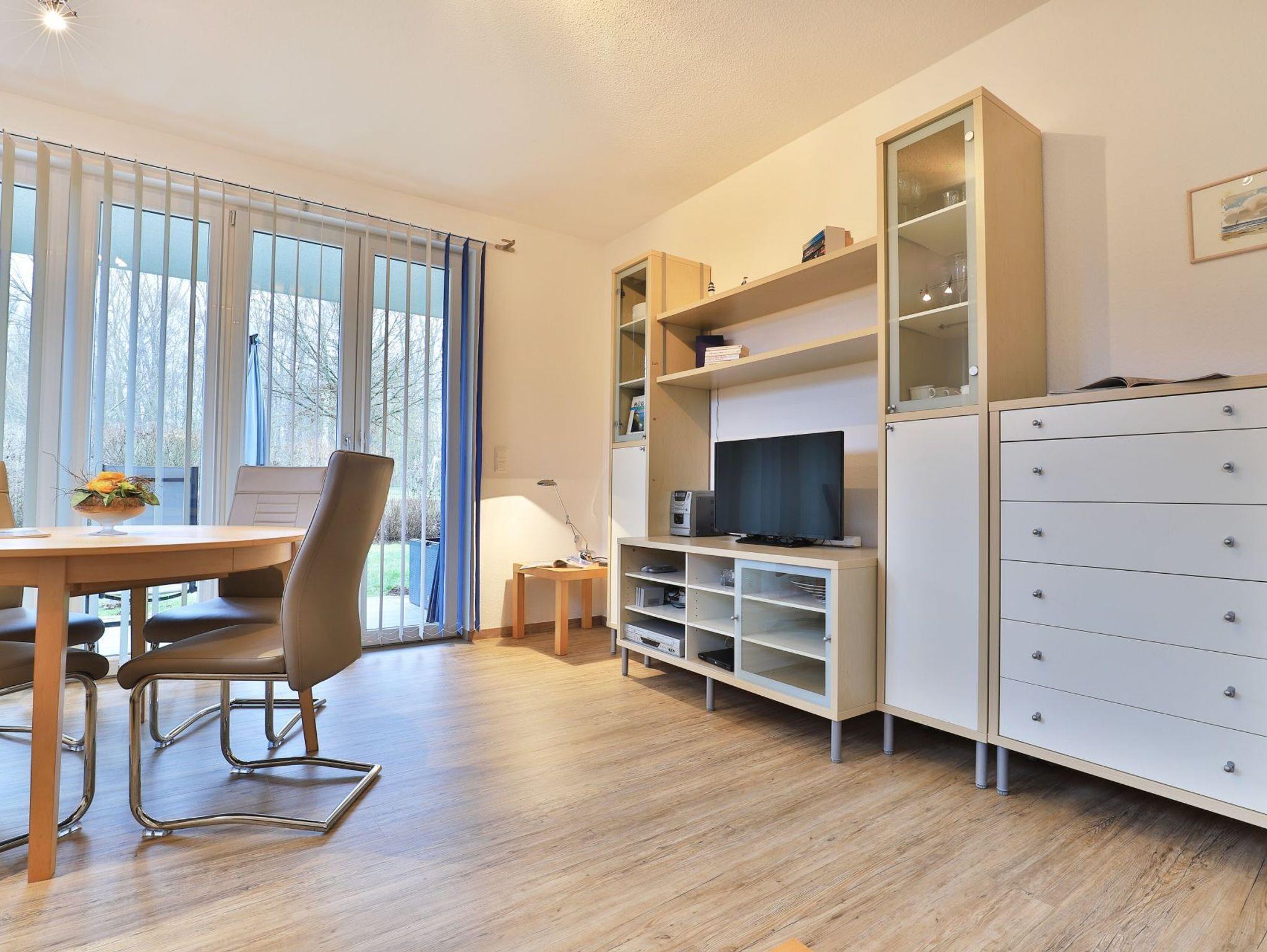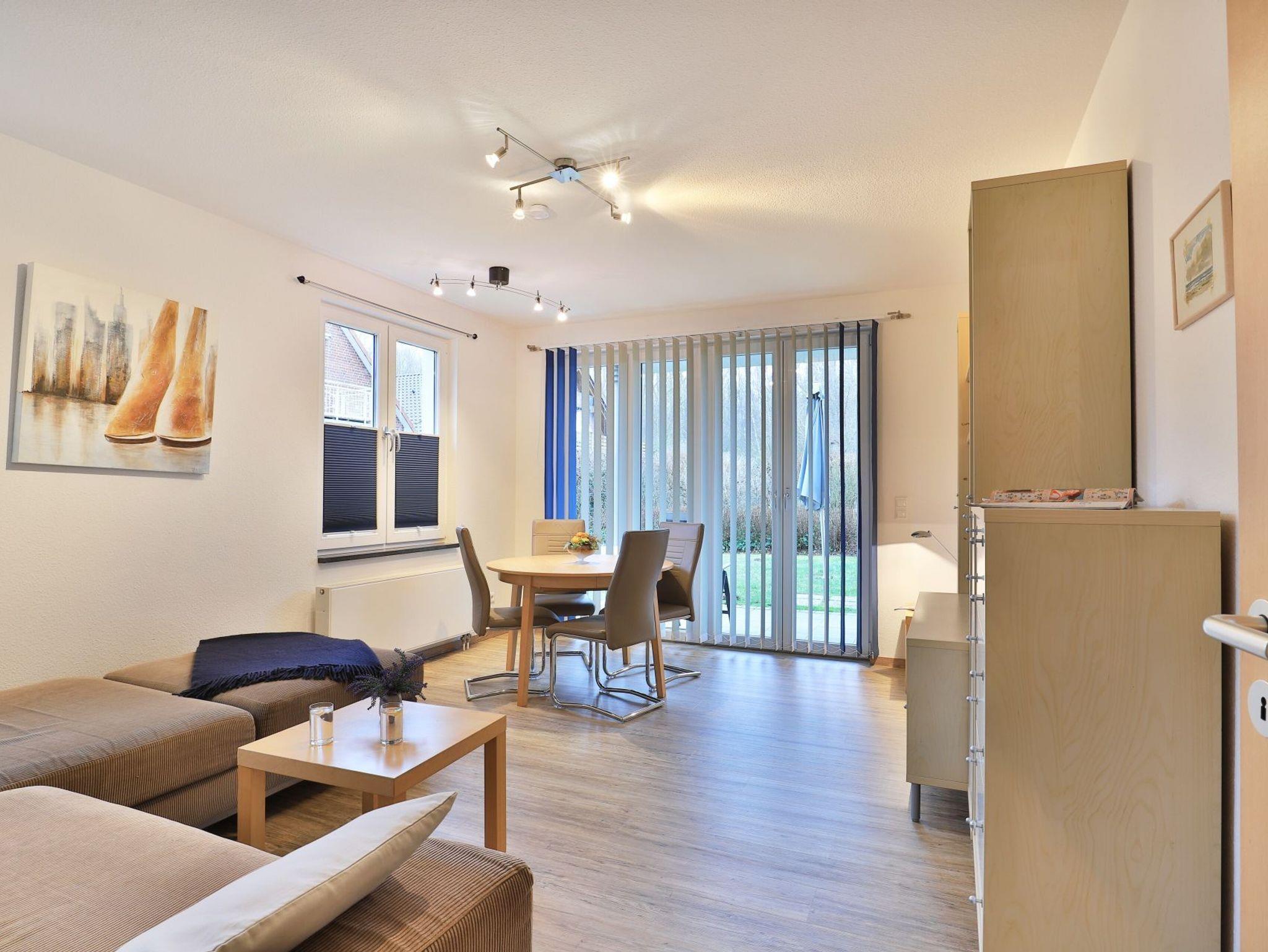 Das geschmackvoll möblierte Erdgeschoss Appartement besitzt eine Wohnfläche von ca. 62qm und kann mit bis zu 4 Personen belegt werden. Der Wohn und Essbereich ist mit einem Sofa, Regalwand, Fernseher, DVD-Player und Musikanlage ausgestattet. Die separate Küche ermöglicht die Eigenversorgung. Ceranfeldherd, Backofen, Mikrowelle, Dunstabzug, Kühlschrank mit Gefrierfach, Kaffeemaschine, Toaster, Geschirrspüler usw. Vom Wohnraum aus gelangen Sie auf die saisonal möblierte Terrasse in Süd-West Lage. Erholsame Nächte ermöglicht ein separates Schlafzimmer mit Doppelbett, Kleiderschrank, 2. Fernseher. Zwei weitere Schlafgelegenheiten bietet ein Schlafsofa im Wohnungseingangsbereich.