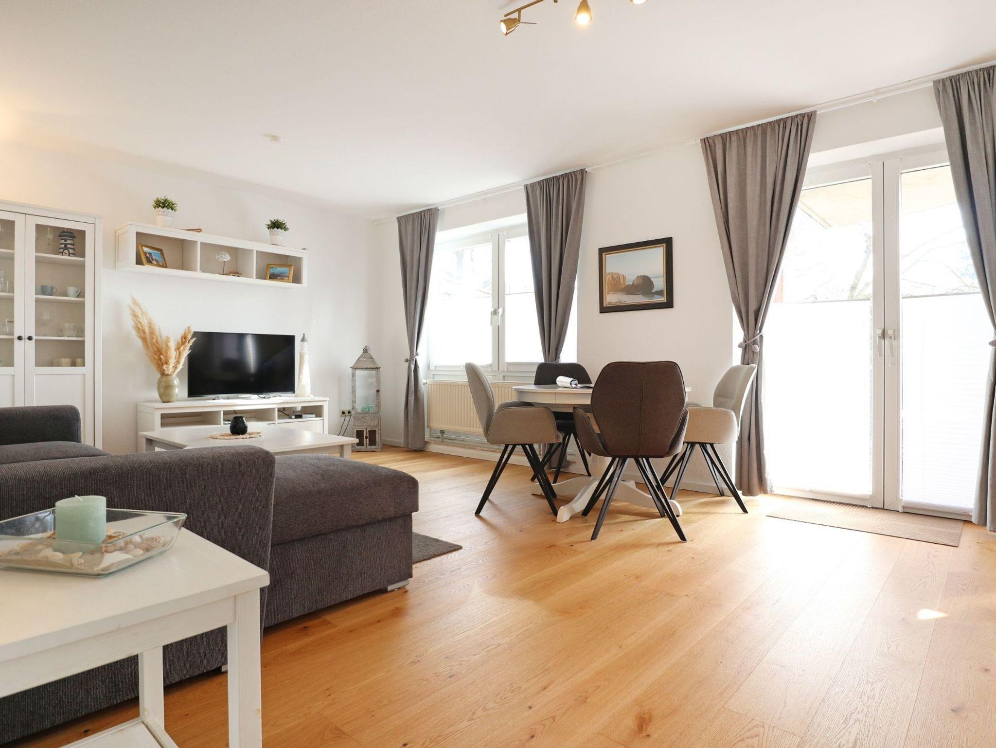 Nur 150 Meter zum feinsandigen Badestrand befindet sich die gut ausgestattete 2-Zimmer Ferienwohnung Goosbrink 21 mit Terrasse. Auf einer Wohnfläche von 50qm können Sie mit maximal 4 Personen einen angenehmen Aufenthalt verbringen. Der freundlich möblierte Wohn-Essbereich mit Terrassen Zugang verfügt über eine integrierte Küchenzeile mit Herd, Backofen, Geschirrspüler sowie weiteren Kleingeräten Kaffeemaschine, Toaster, Wasserkocher usw. Ein ausziehbares Sofa bietet zwei Schlafgelegenheiten. Zudem sind ein Esstisch, Fernsehgerät und Musikanlage vorhanden. Ein separates Schlafzimmer mit Doppelbett und Kleiderschrank und Kommode sowie ein Duschbad sind zugehörig. Für mitgebrachte Fahrräder steht ein separater Abstellraum bereit. Ihren PKW parken Sie kostenfrei auf dem Kieferngrundstück. Es handelt sich um eine Nichtraucherwohnung. Nah des Hauses beginnen schöne Spazierwege, die in den Tarnewitzer Urwald oder auch zum Jachthafen Weisse Wiek führen. Zum Ortszentrum gelangen Sie in ca. 10 Gehminuten. Einkaufsmöglichkeiten sind in direkter Umgebung.