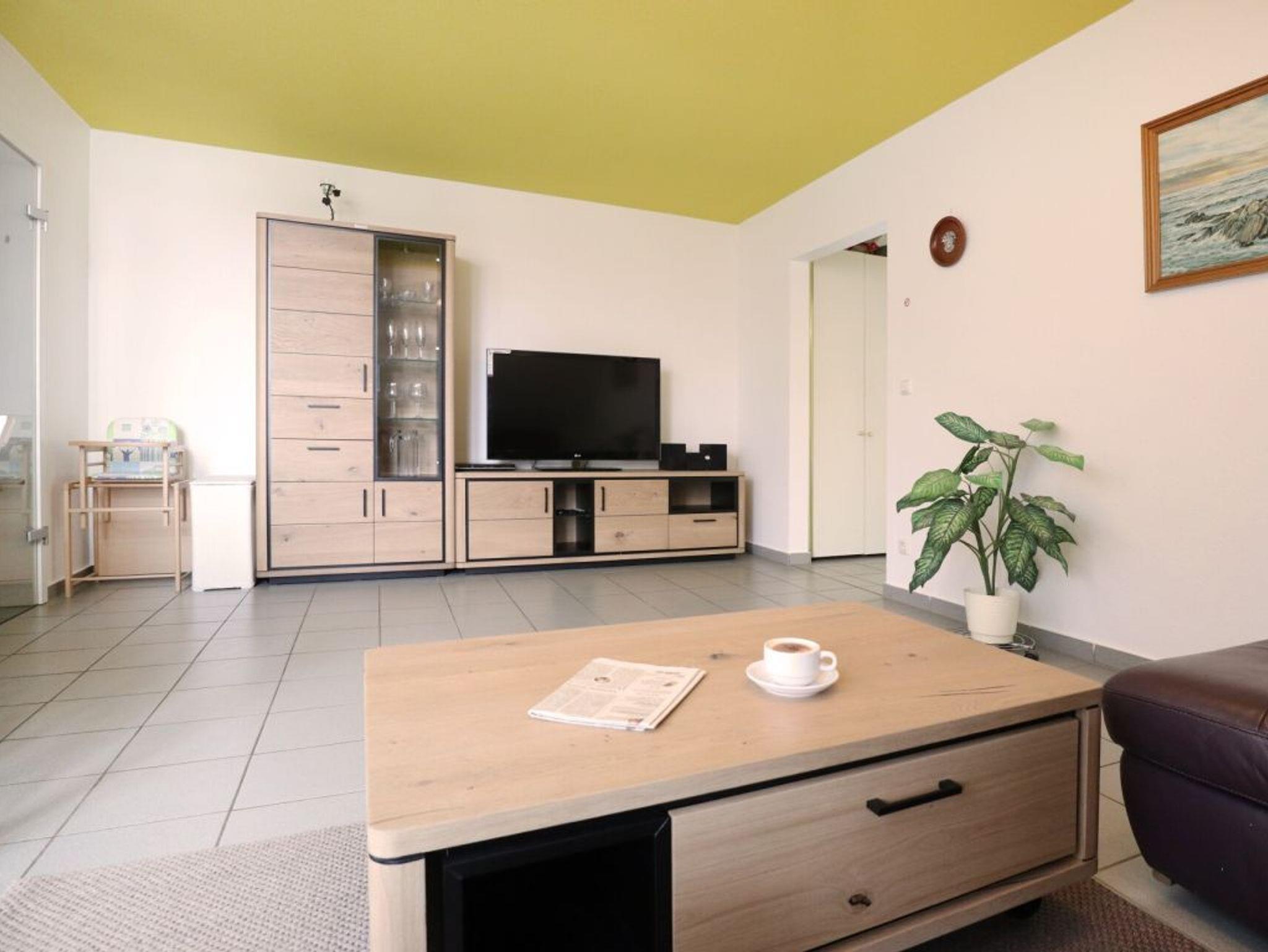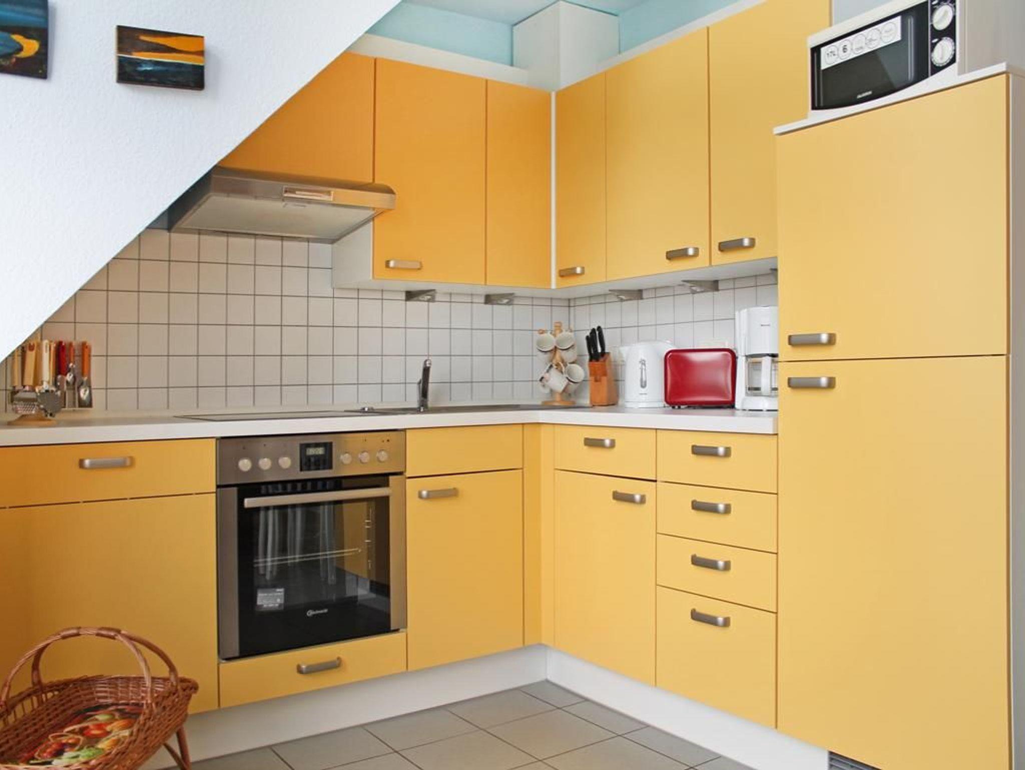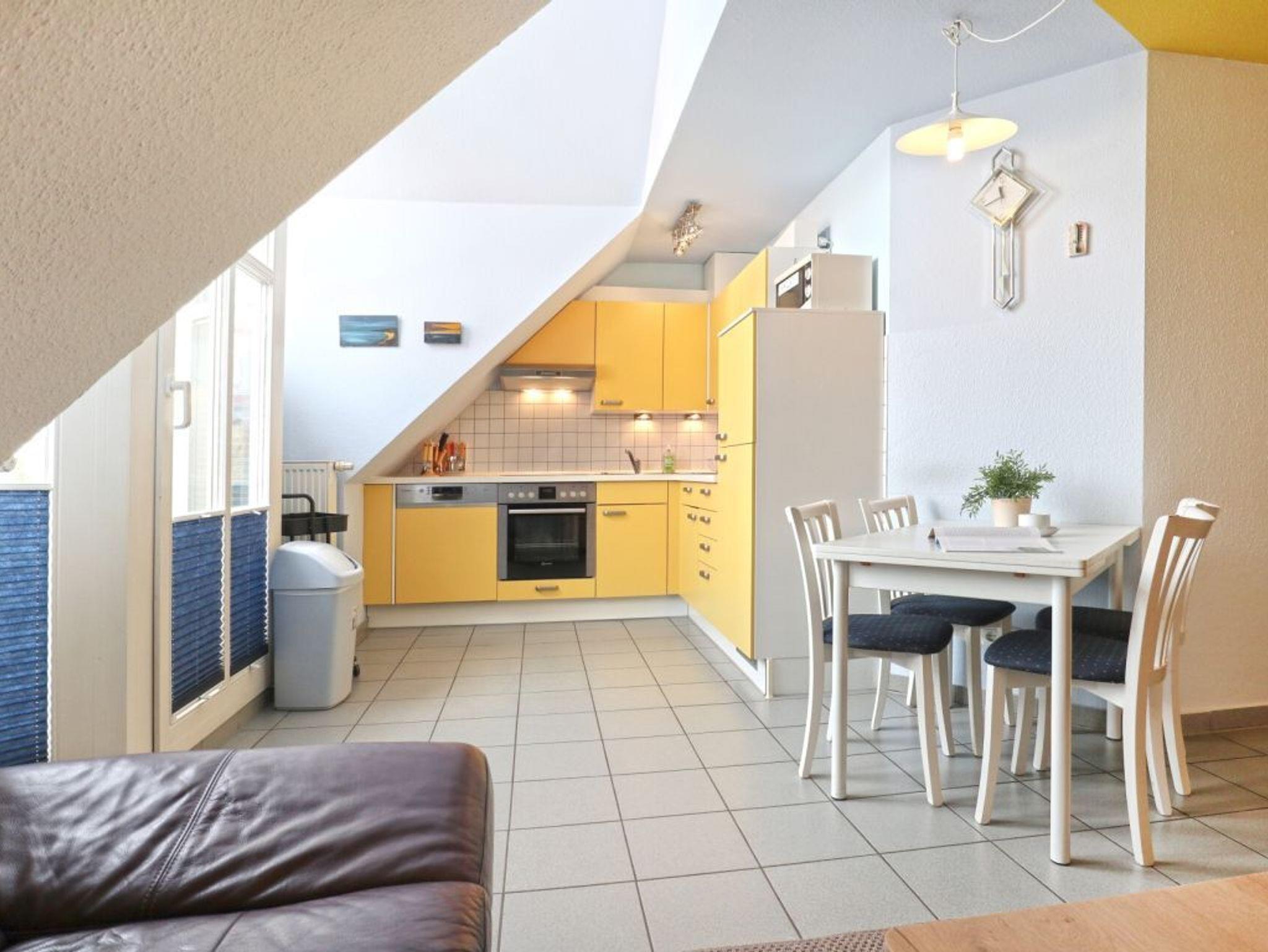 Im sehr komfortabel eingerichteten Wohn-Essbereich mit Balkonzugang, erwartet Sie eine bequeme Sofalandschaft, ein Esstisch sowie Fernseher, DVD-Player, Musikanlage und gebührenfreies WLAN. Für Urlauber, die sich gerne eigenständig mit Mahlzeiten versorgen möchten, ist die integrierte voll ausgestattete Wohnküche perfekt: Ceranfeldherd, Backofen, Mikrowelle, Dunstabzug, Kühlschrank mit integr. Frostfach, Toaster, Kaffeemaschine, Wasserkocher, Geschirrspüler usw. sind vorhanden. Sie speisen am Esstisch im Wohnbereich, oder genießen während der wärmeren Jahreszeit Ihre Kaffeezeit auf dem saisonal möblierten Balkon in Ausrichtung Süd-West.